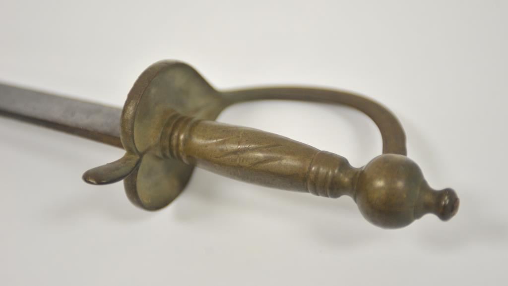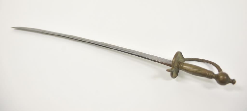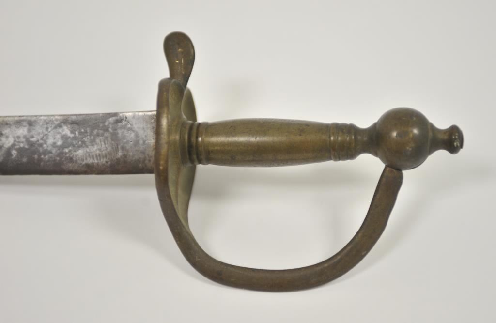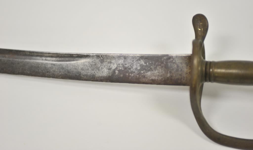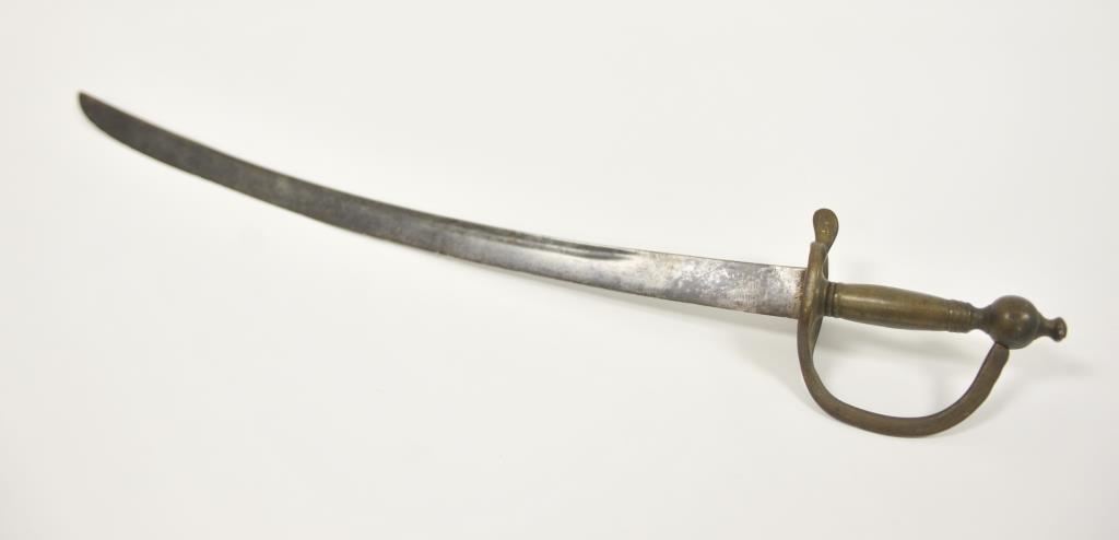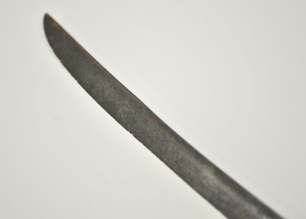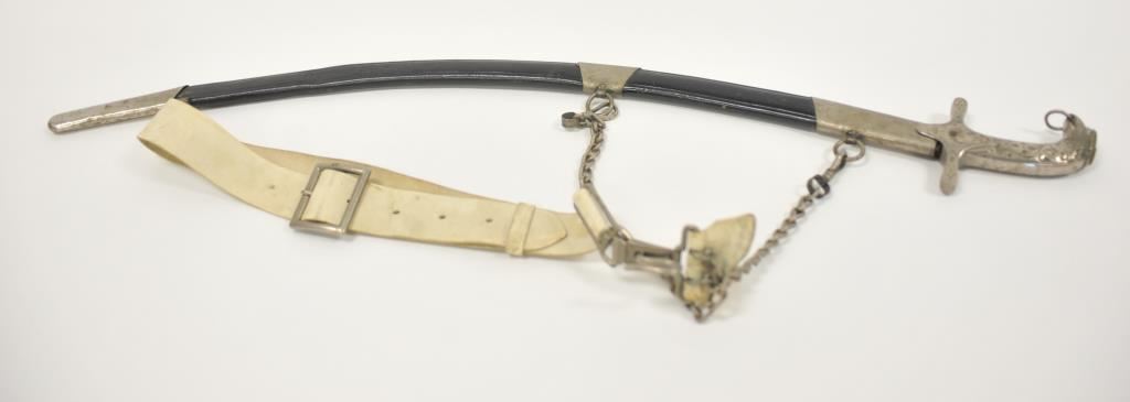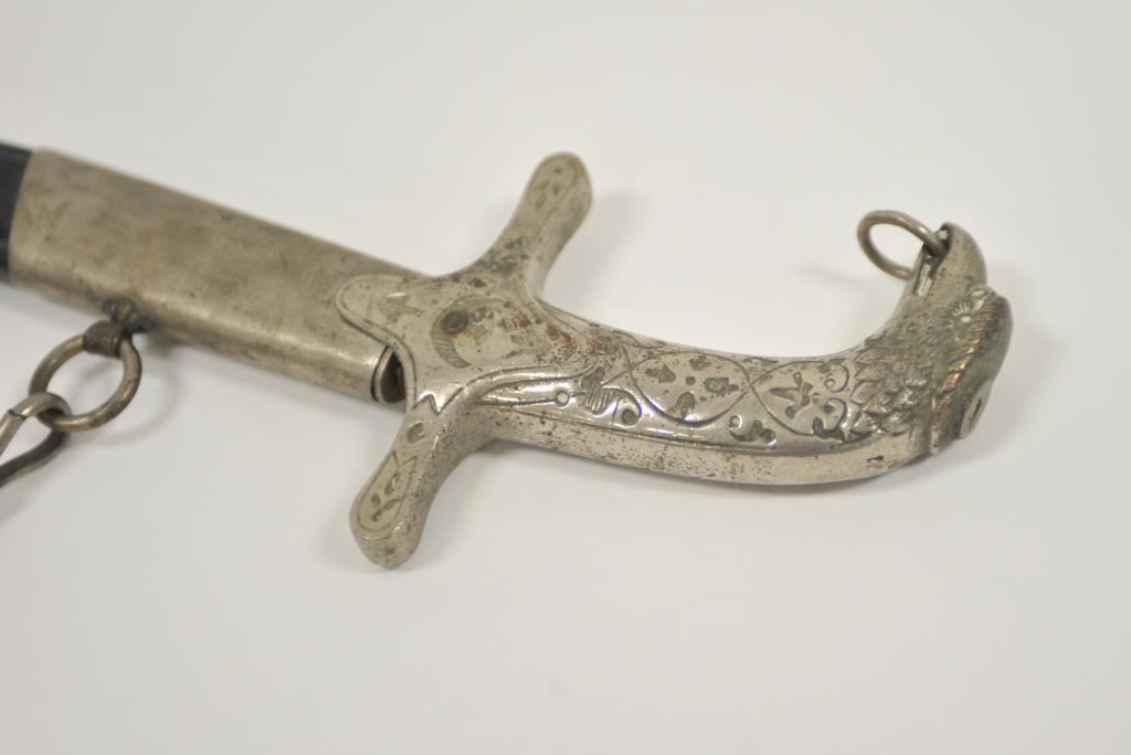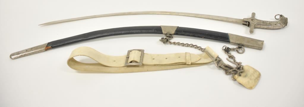 Rare and unusual Ottoman officer’s silvered eagle hilt officer’s shamshir (sword) complete with silvered brass mounted leather scabbard complete with elaborate chain hangers and original buff leather belt. The deeply curved bright fullered 29 inch blade is in excellent condition. The heavy silvered brass eagle hilt in cast and chased. The locket engraved with the Ottoman national emblem featuring a large scimitar over the crescent moon and star. Likely issued to Ottoman general officer’s during WWI. The sword and belt in remarkable condition. The mounts numbered 43 and the blade numbered 42 at ricasso. A most unusual and attractive Ottoman sword of a type we have never seen. Est.: $800-$1600