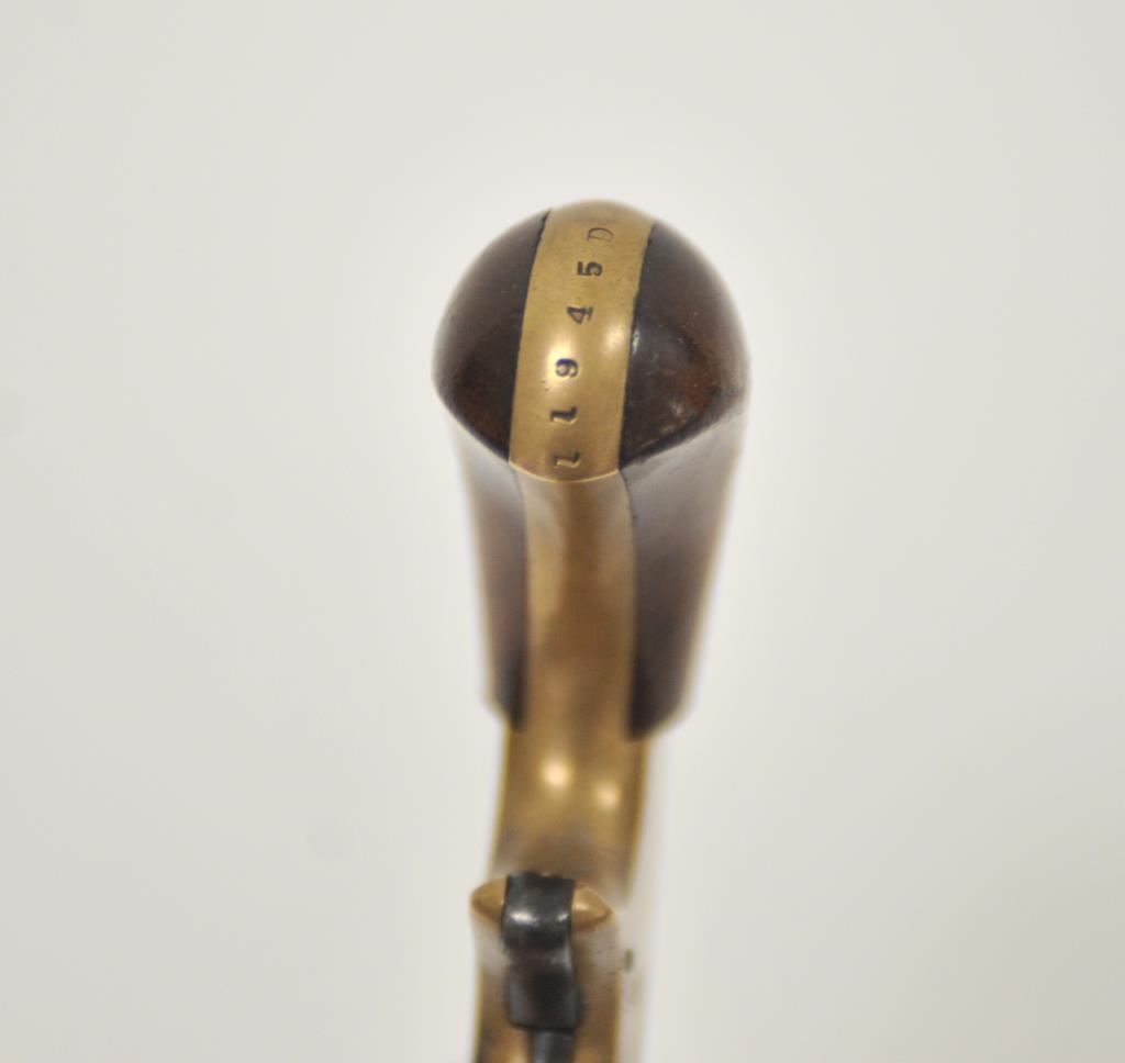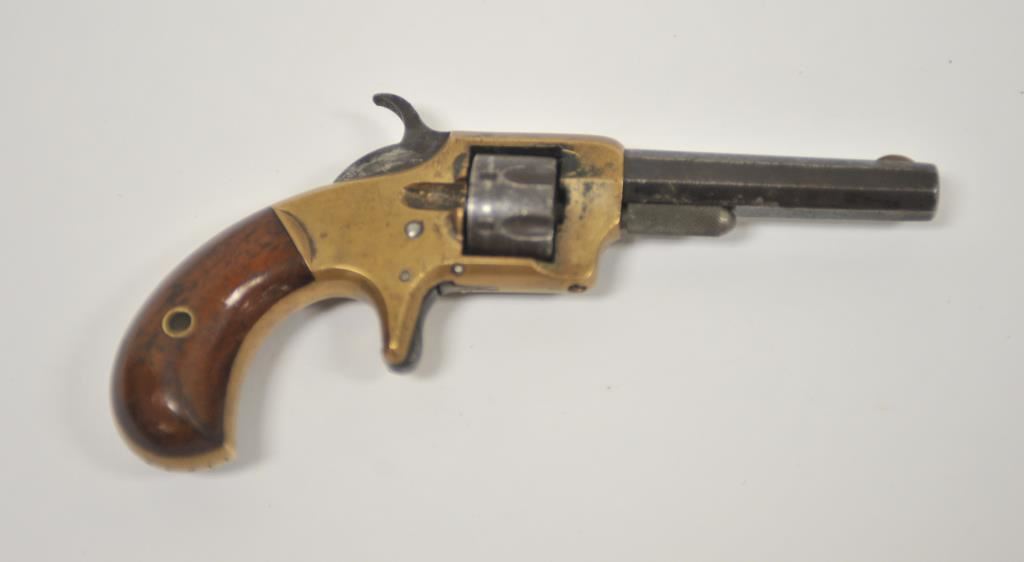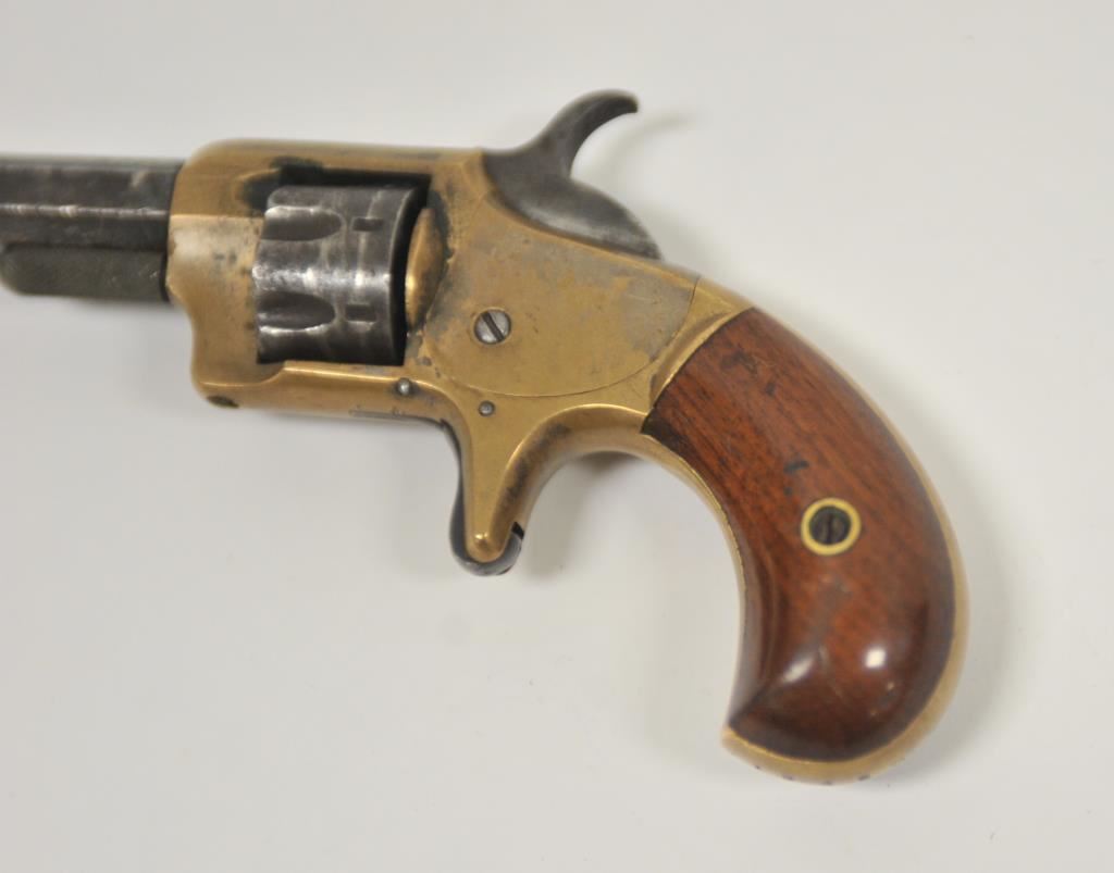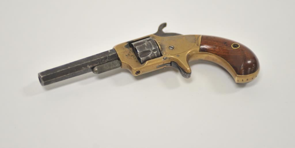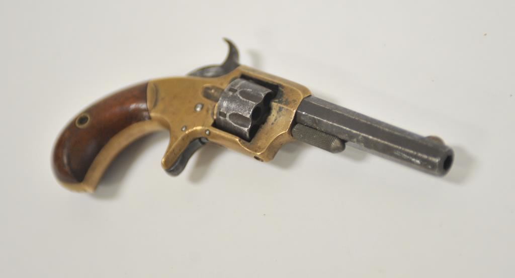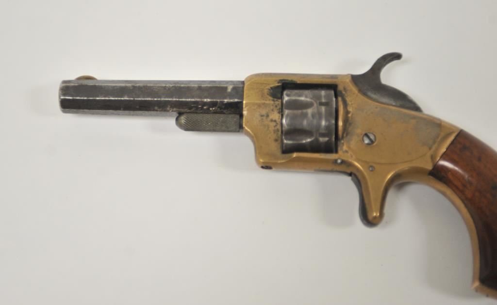 Whitney 7 shot .22 caliber revolver with brass frame and octagon barrel, S/N 11945D. Good overall with traces of blue finish. Good brass patina. Good grips and legible address. Some minor pitting. Works well. 1870s era. (Antique) Est.: $200-$400