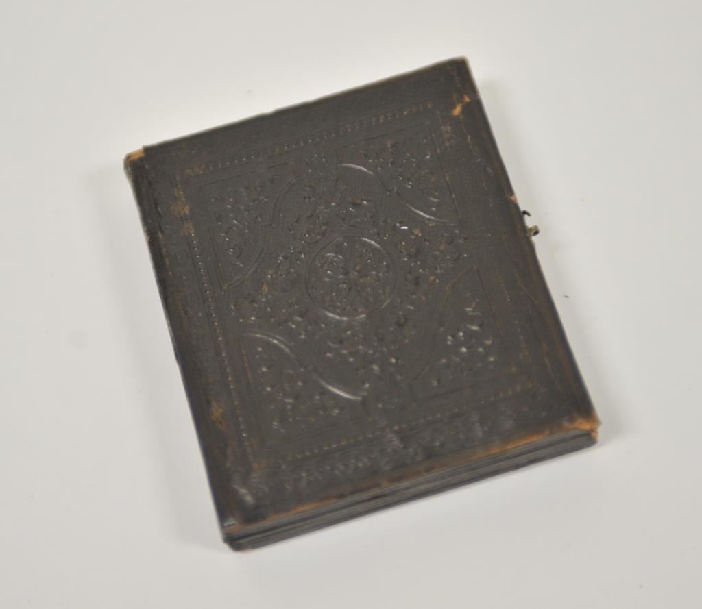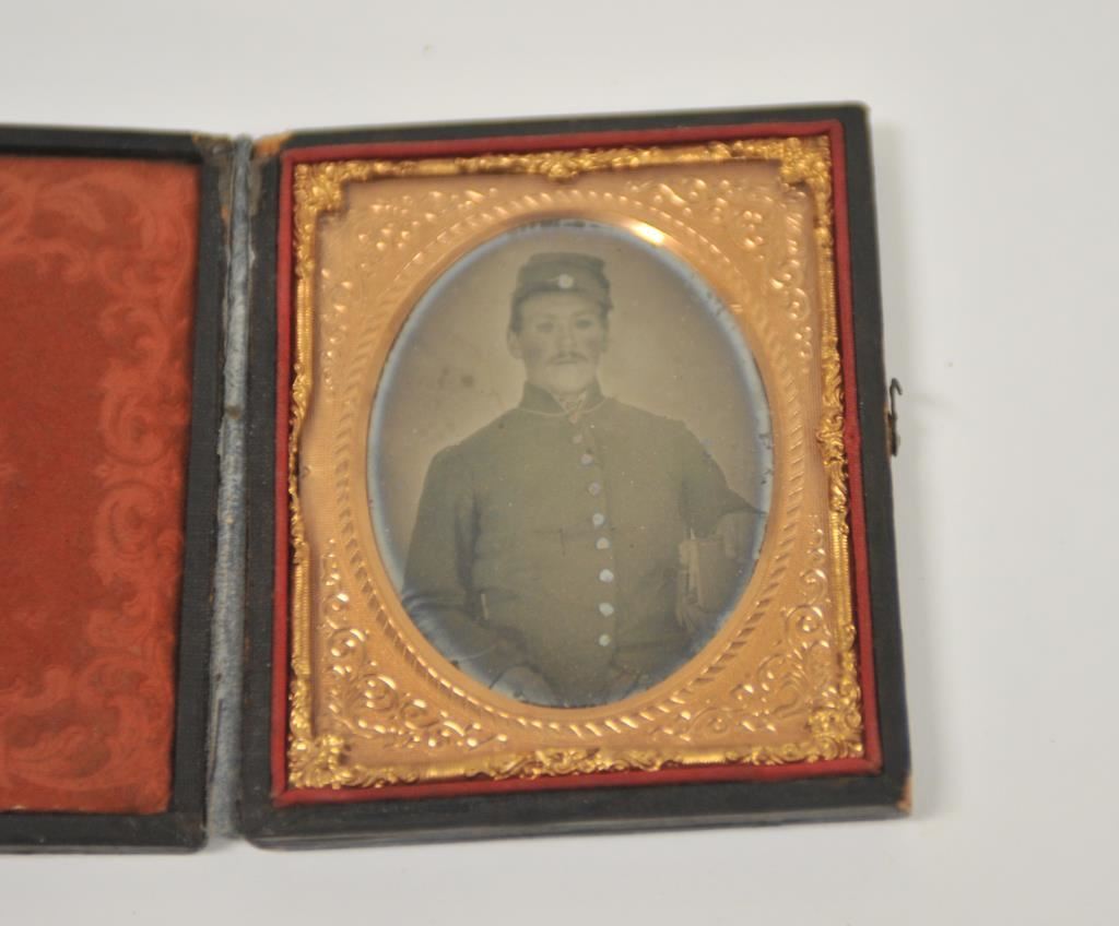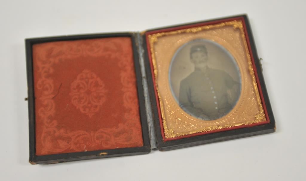 A good original Civil War Daguerrotype of a Union soldier in its embossed leather case. Image is fine and frame retains most original gilding. Cover separated. A good “Dag”. Est.: $100-$200