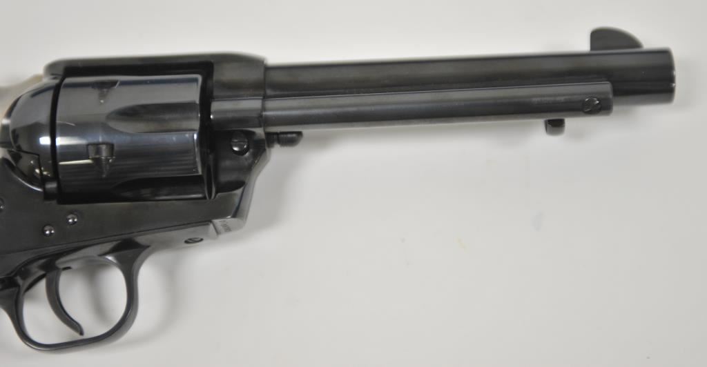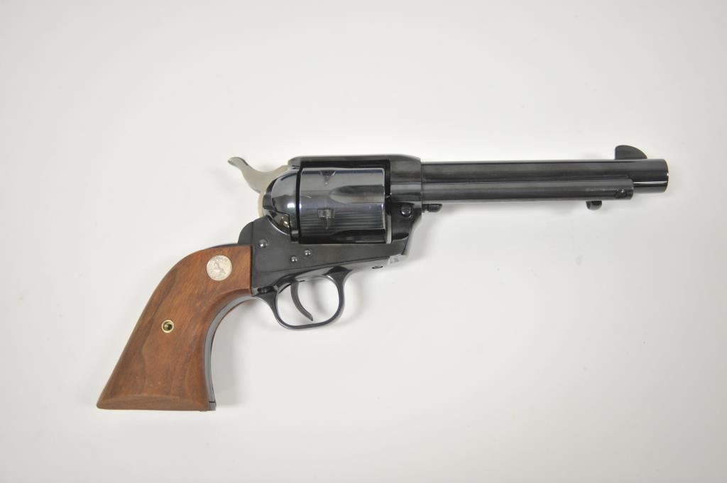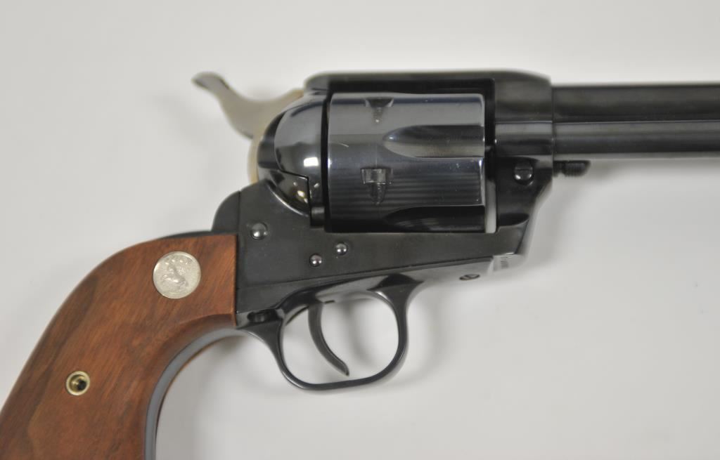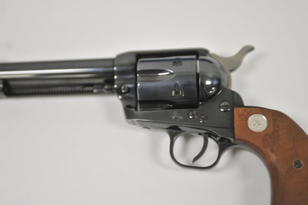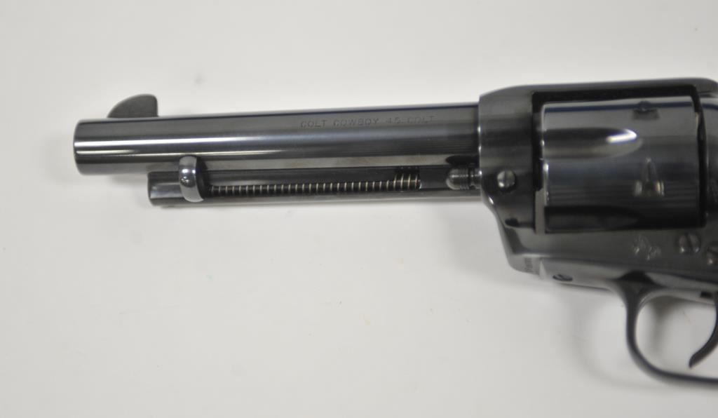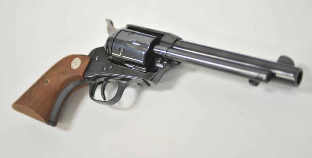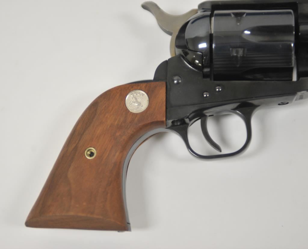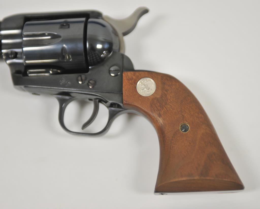Limited and out of production Colt “Cowboy” single action revolver, S/N TF09782 in .44-40 caliber with a 5 ½” barrel, full blue finish, and medallion wood grip. Excellent condition in box. 97%-99% overall. Minimal index line and very limited to almost no use. (Modern/PPT) Est.: $750-$1500