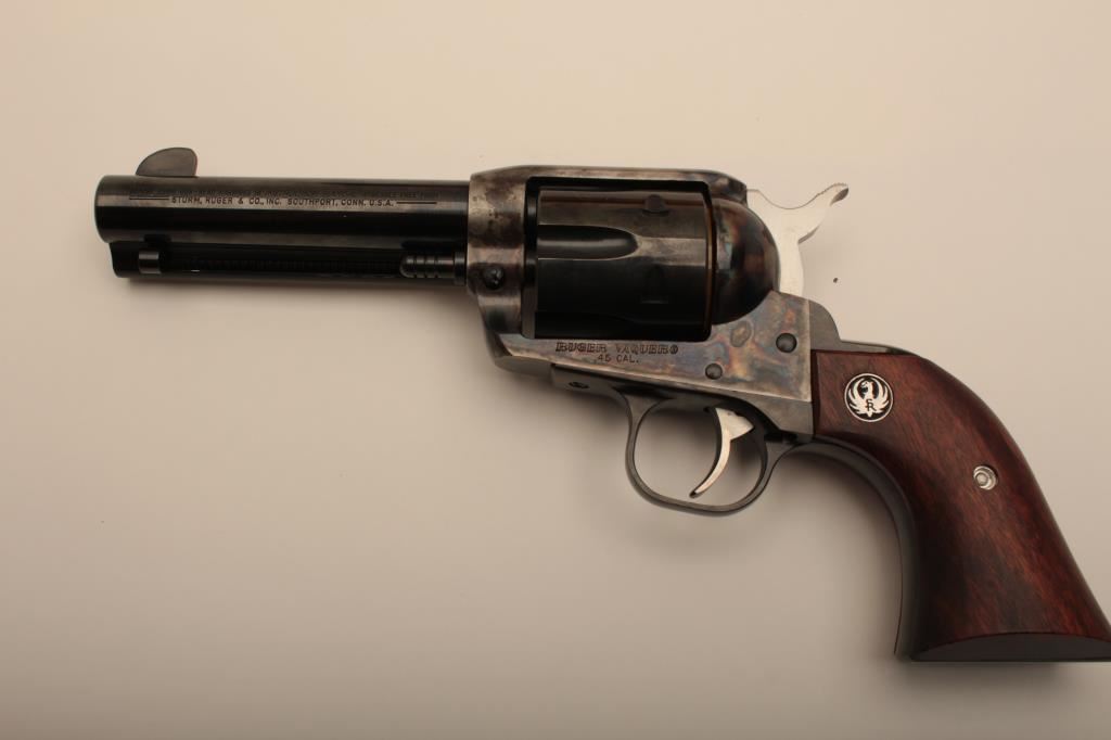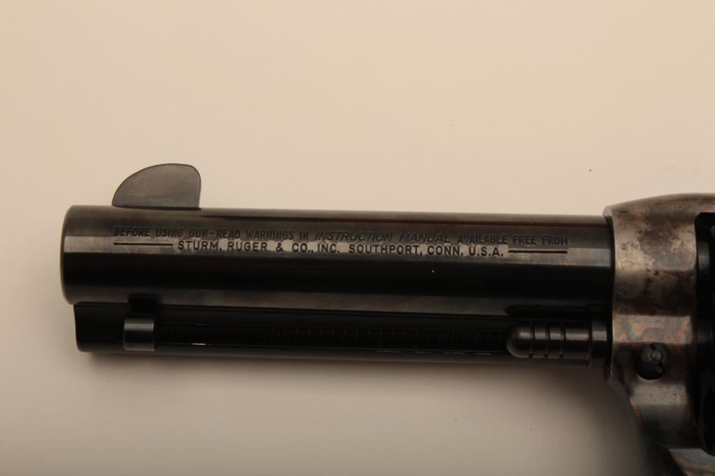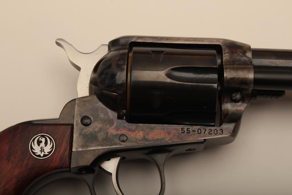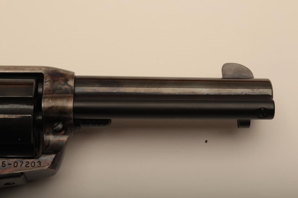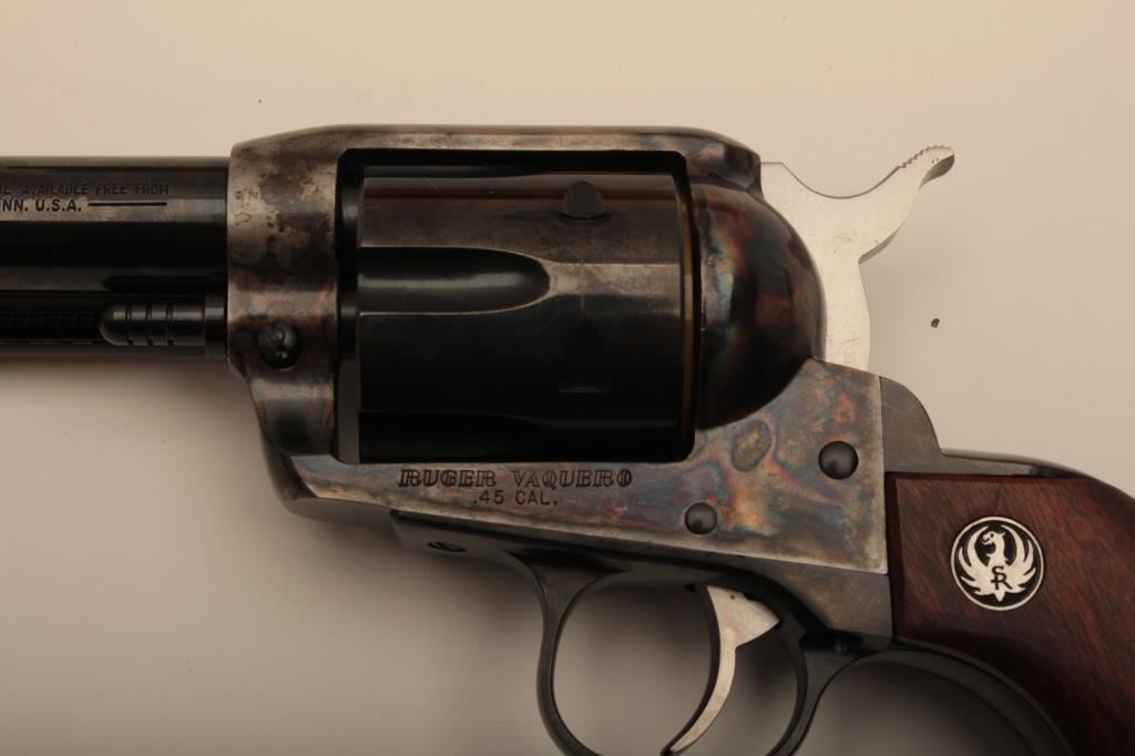 Ruger Vaquero, #55-07203, .45 Colt cal., 4 5/8" barrel, blued with color case hardened frame, fixed sights, smooth medallion grips. Revolver is in fine condition overall, retaining approximately 80%+ case colors, and 95%+ original blue. The bore is mint, the action is excellent, the grips are excellent. Includes original box and outer sleeve. (Modern / PPT) Est, $300-600