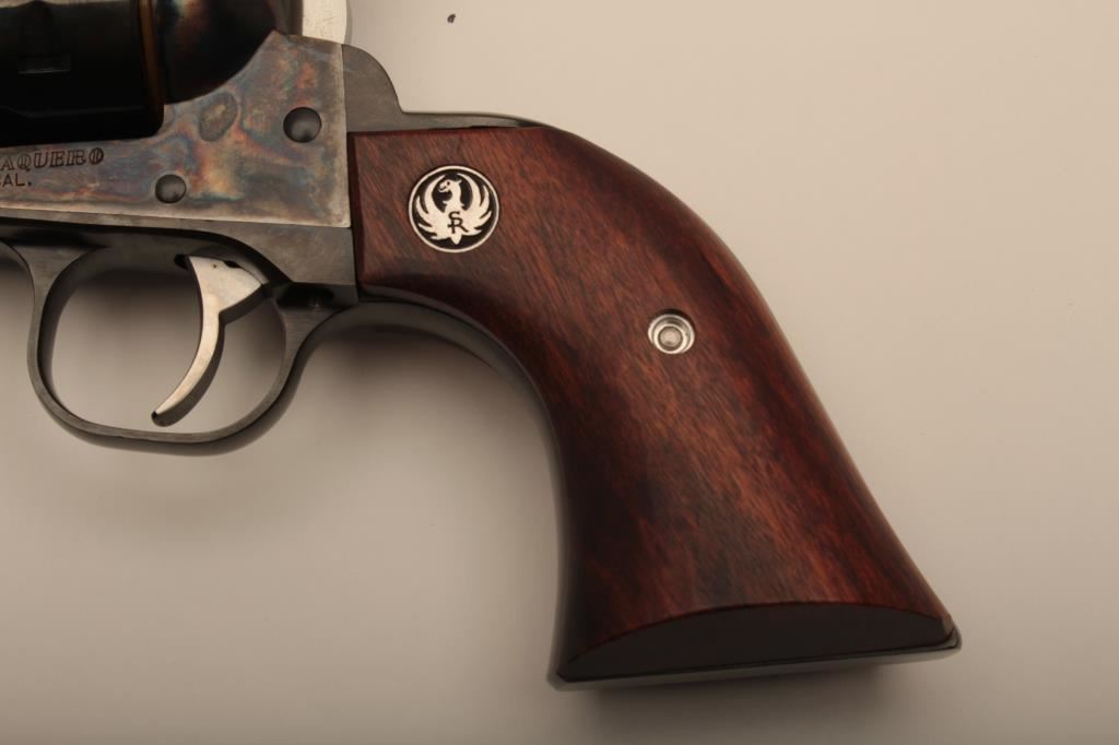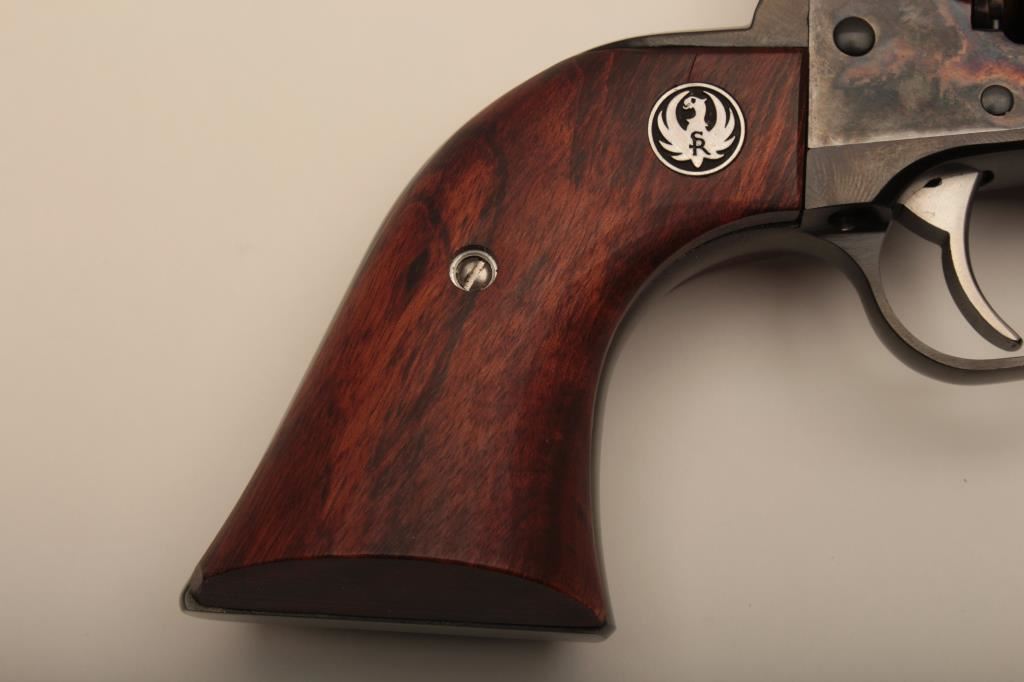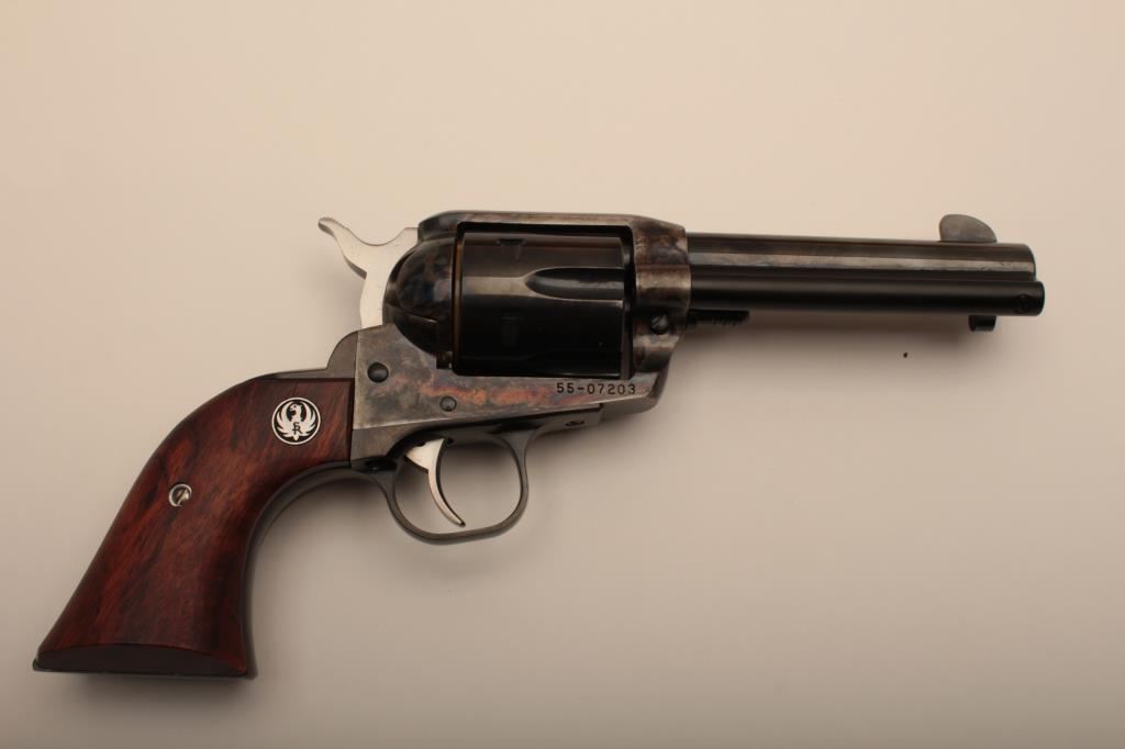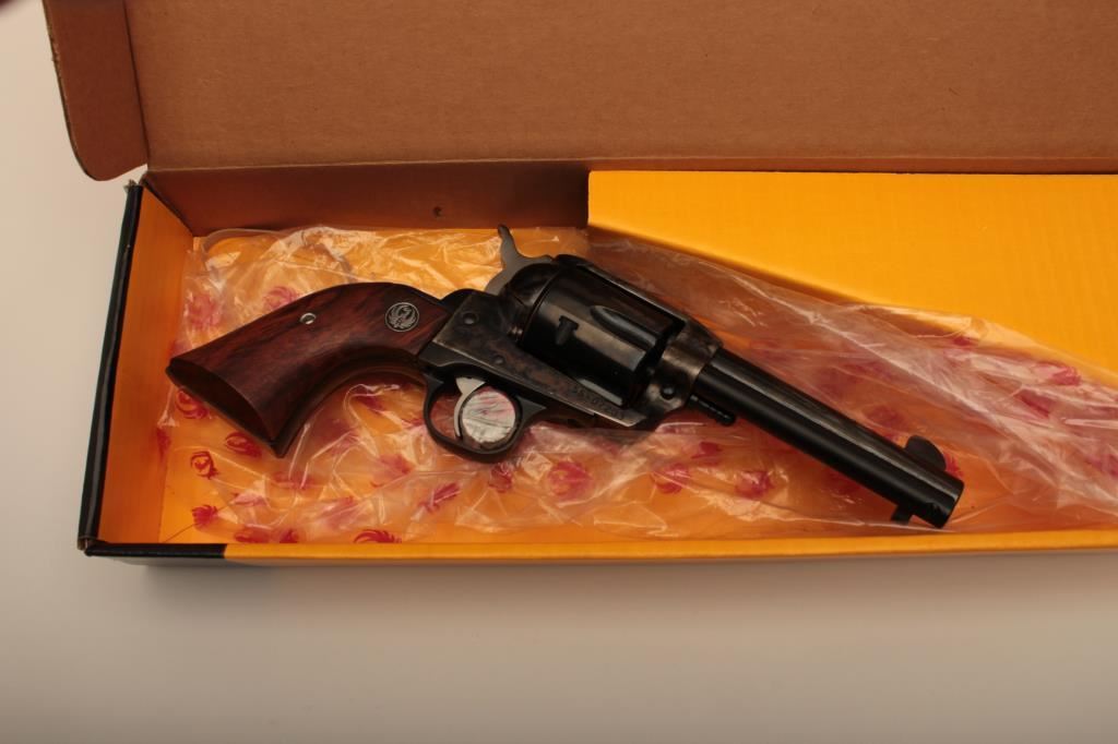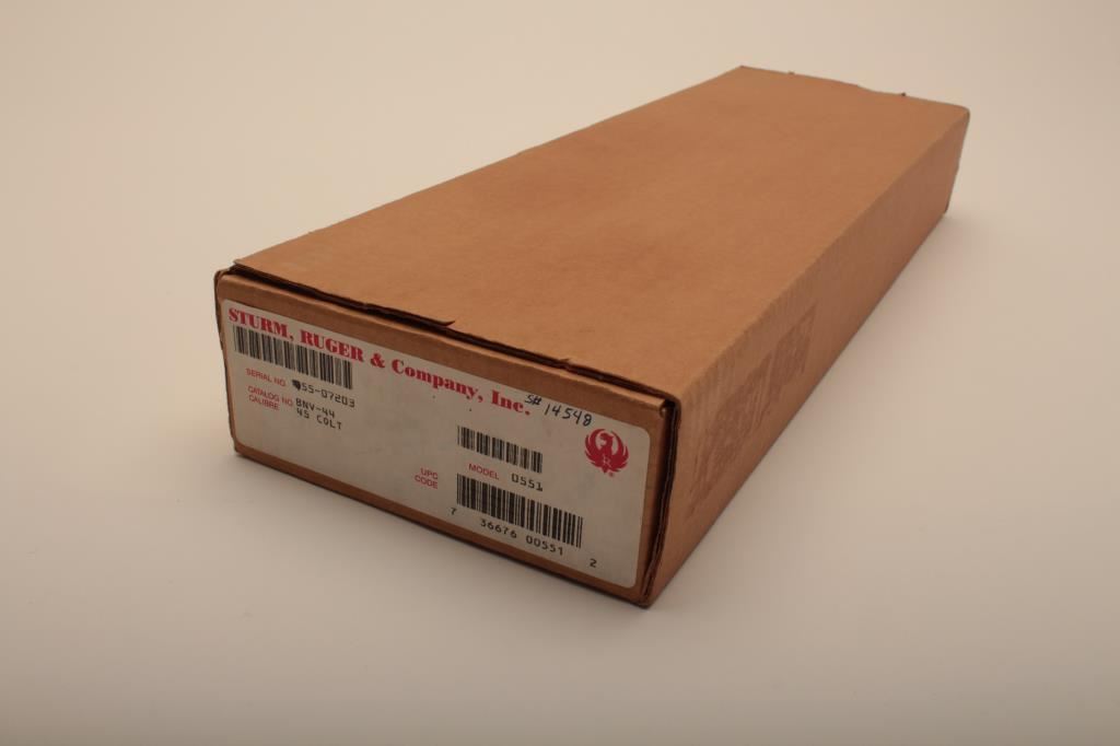 Ruger Vaquero, #55-07203, .45 Colt cal., 4 5/8" barrel, blued with color case hardened frame, fixed sights, smooth medallion grips. Revolver is in fine condition overall, retaining approximately 80%+ case colors, and 95%+ original blue. The bore is mint, the action is excellent, the grips are excellent. Includes original box and outer sleeve. (Modern / PPT) Est, $300-600