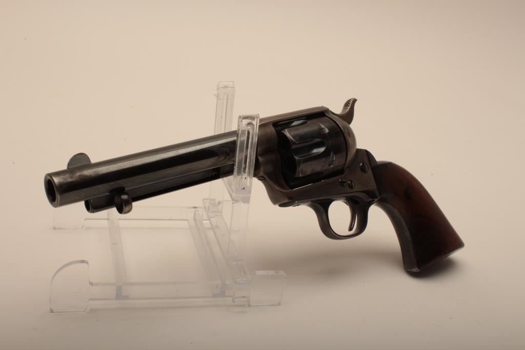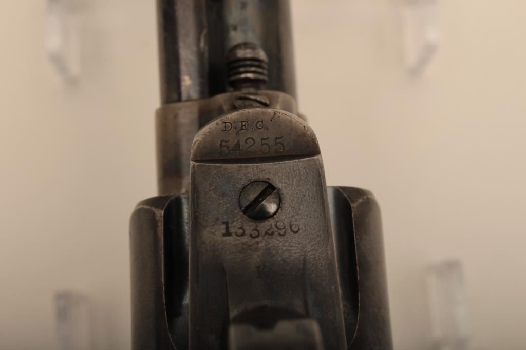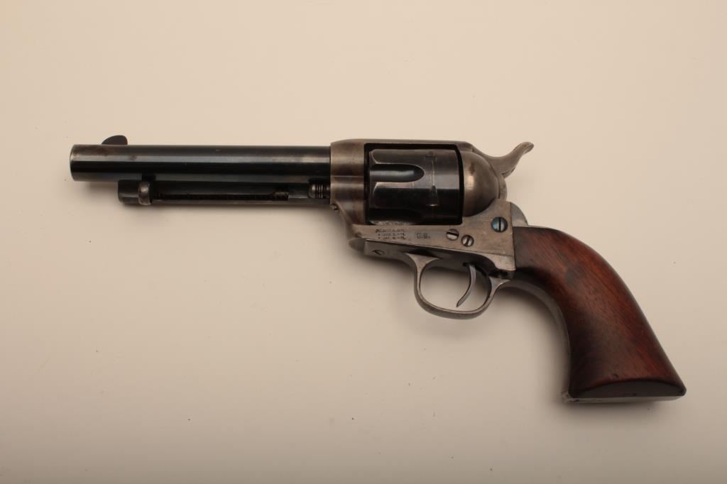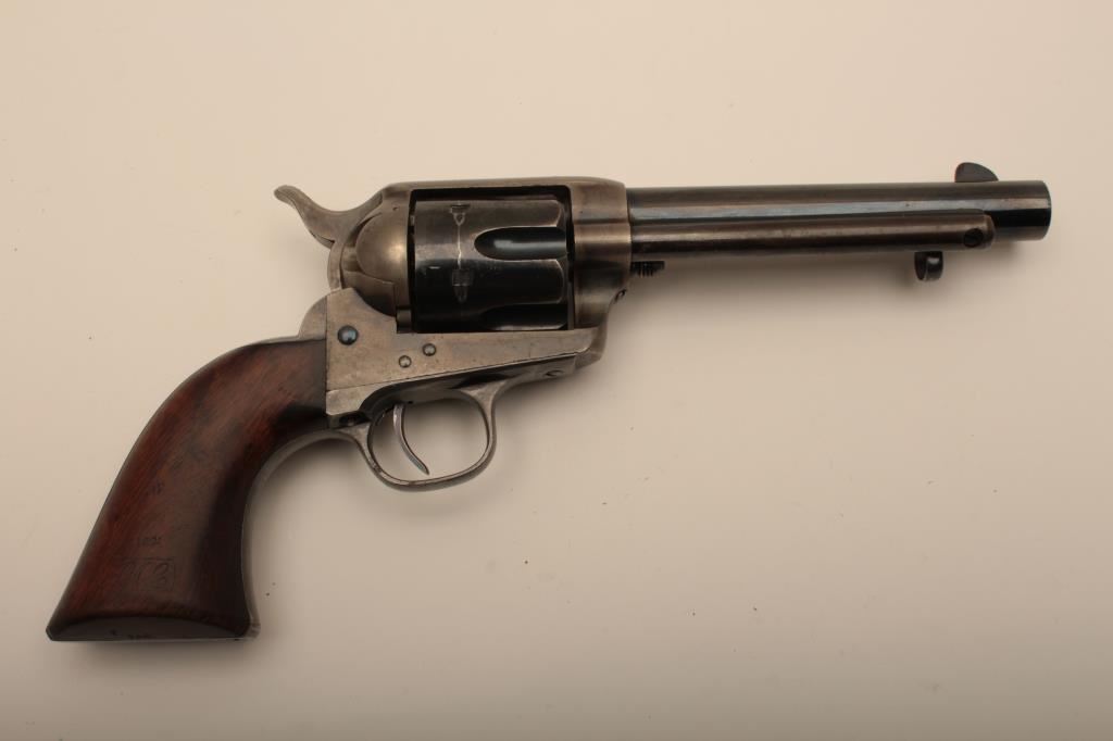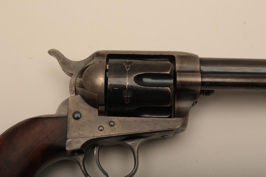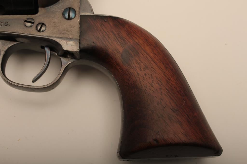 Colt U.S. “Artillery” model Single Action revolver in .45 L.C> caliber with a 5 ½” barrel, S/N 54255. Serial number 54192 was issued to troop L 7th Cavalry. This revolver remains in near fine condition retaining the majority of its arsenal blue and case hardened finish. The barrel retains 85%-95% bright blue with slight loss at the front of the muzzle and “feathering” or polish visible on sight which retains almost all original blue and is it full original dimension. The cylinder retains a matching 85%-95% bright blue with an index line and some minor aging just starting. The frame shows 75%-85% plus case colors with great rainbow hues just aging naturally. The straps show 90% plus bright blue. The hammer matches the frame condition showing strong color and the ejector rod housing is 60%-80% thinning on the edge. The grips show “R.A.C.” inspection stamps on each side of butt and are very good plus with partial cartouche on right grip face. Parts are numbered as follows: