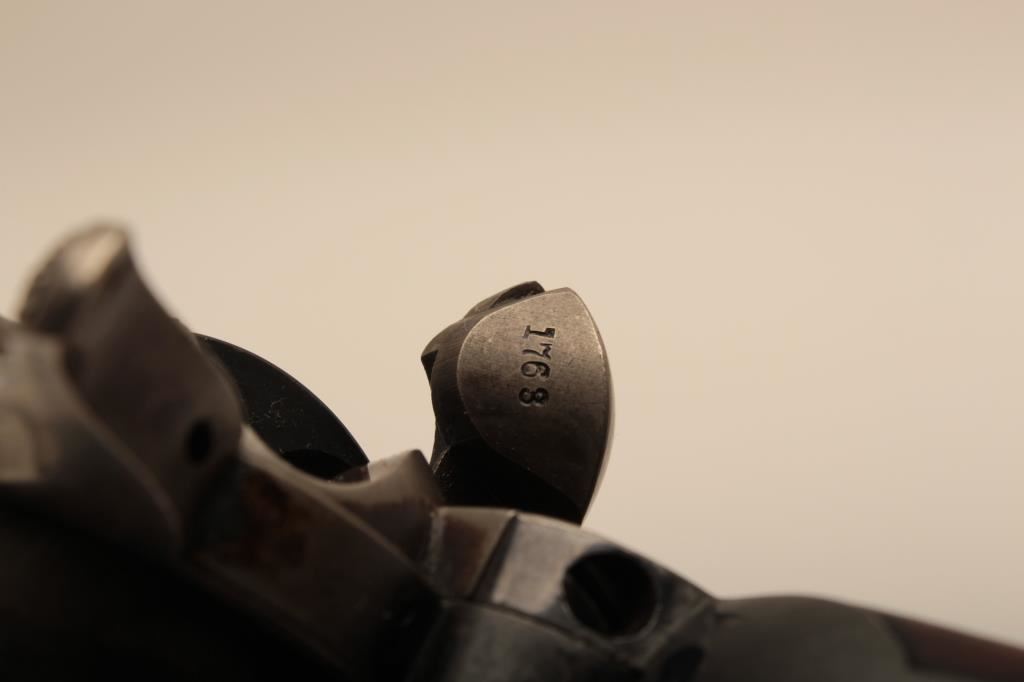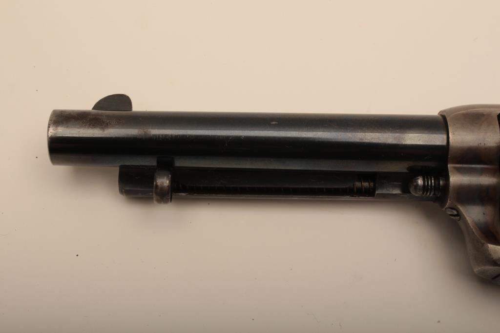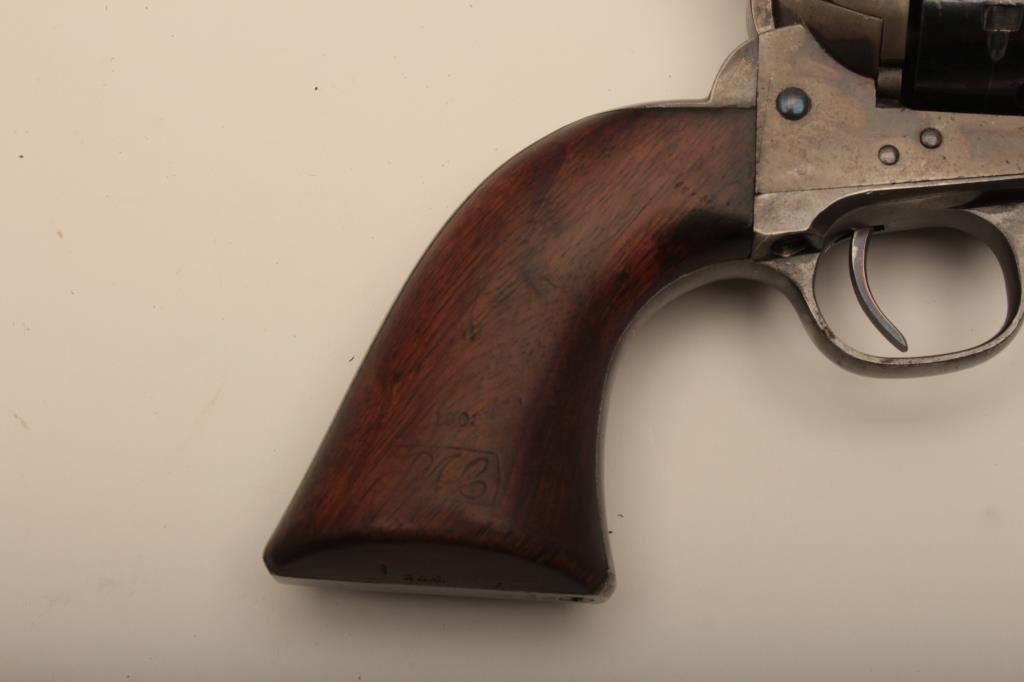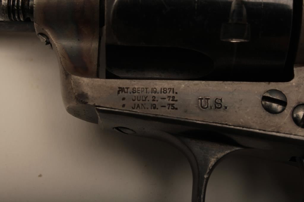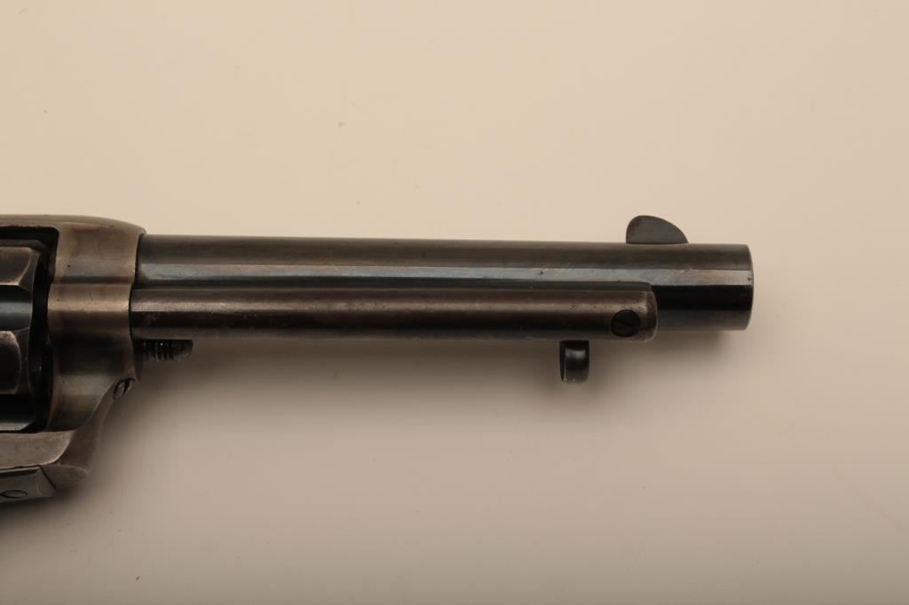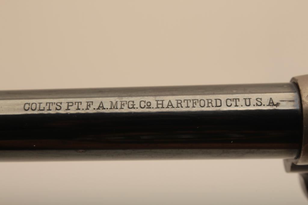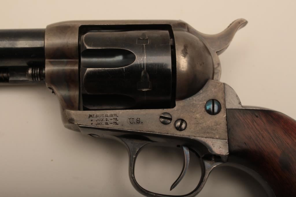 Colt U.S. “Artillery” model Single Action revolver in .45 L.C> caliber with a 5 ½” barrel, S/N 54255. Serial number 54192 was issued to troop L 7th Cavalry. This revolver remains in near fine condition retaining the majority of its arsenal blue and case hardened finish. The barrel retains 85%-95% bright blue with slight loss at the front of the muzzle and “feathering” or polish visible on sight which retains almost all original blue and is it full original dimension. The cylinder retains a matching 85%-95% bright blue with an index line and some minor aging just starting. The frame shows 75%-85% plus case colors with great rainbow hues just aging naturally. The straps show 90% plus bright blue. The hammer matches the frame condition showing strong color and the ejector rod housing is 60%-80% thinning on the edge. The grips show “R.A.C.” inspection stamps on each side of butt and are very good plus with partial cartouche on right grip face. Parts are numbered as follows:
