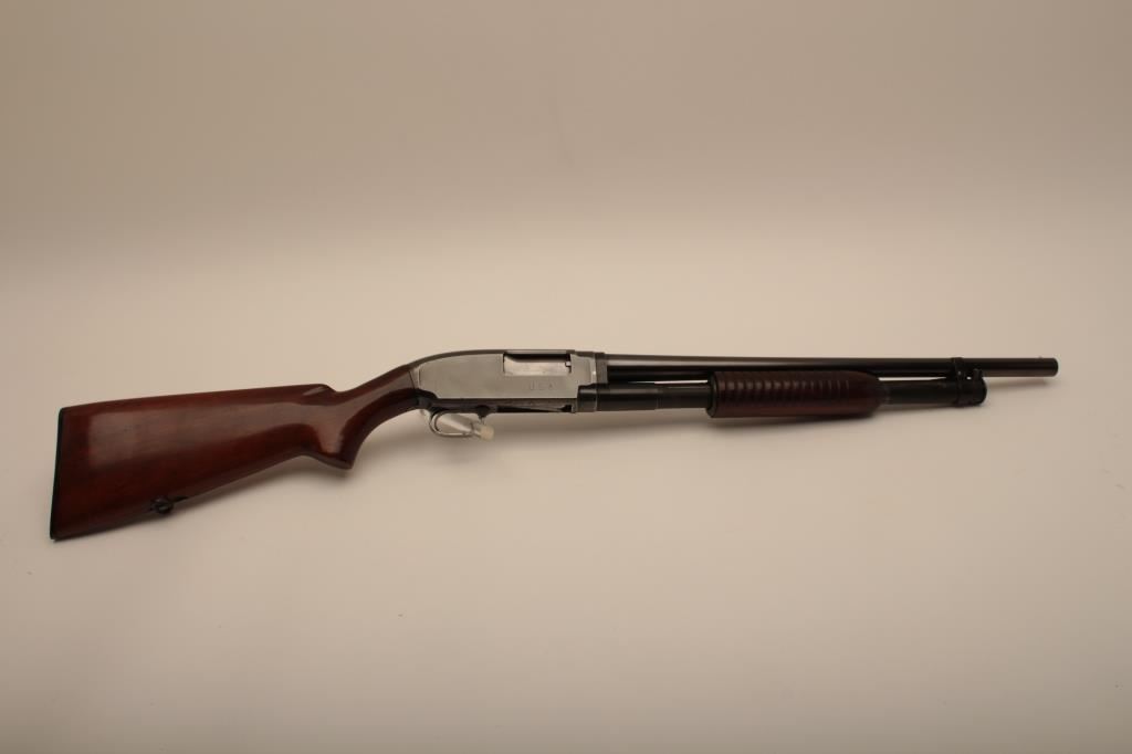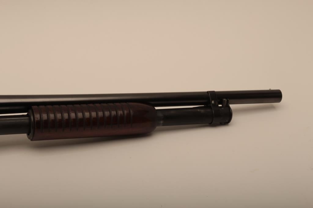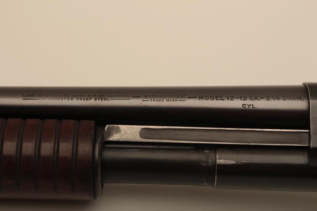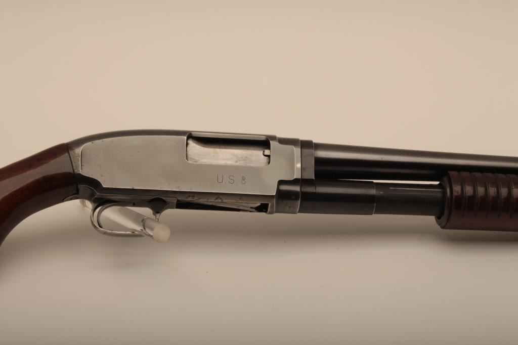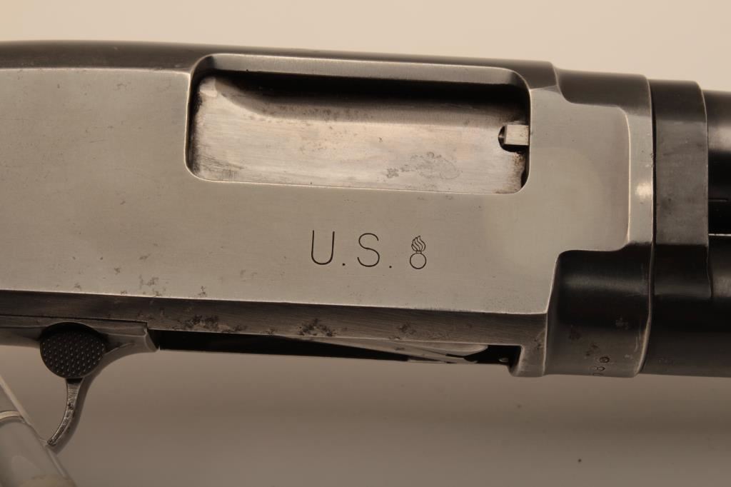 Winchester Model 12 U.S. Marked 12GA riot shotgun with 20” cylinder choked barrel, S/N 984652. 80%-90% original thinning blue finish with polishing to the edge of operating rod attached to pump mechanism. Stock lightly refinished showing outline of cartouche and R.I.A. Fire bomb proof at the breech and two Winchester proofs on the barrel and frame. Some minor pitting and erosion. Military type sling swivels. Original butt plate. Extended thumb safety with fancy knurling added (Probably P.D. as these were bought surplus and used by police agencies nationwide after WWII). A good example that’s genuine U.S. issue. (C&R). Est.: $500-$1000