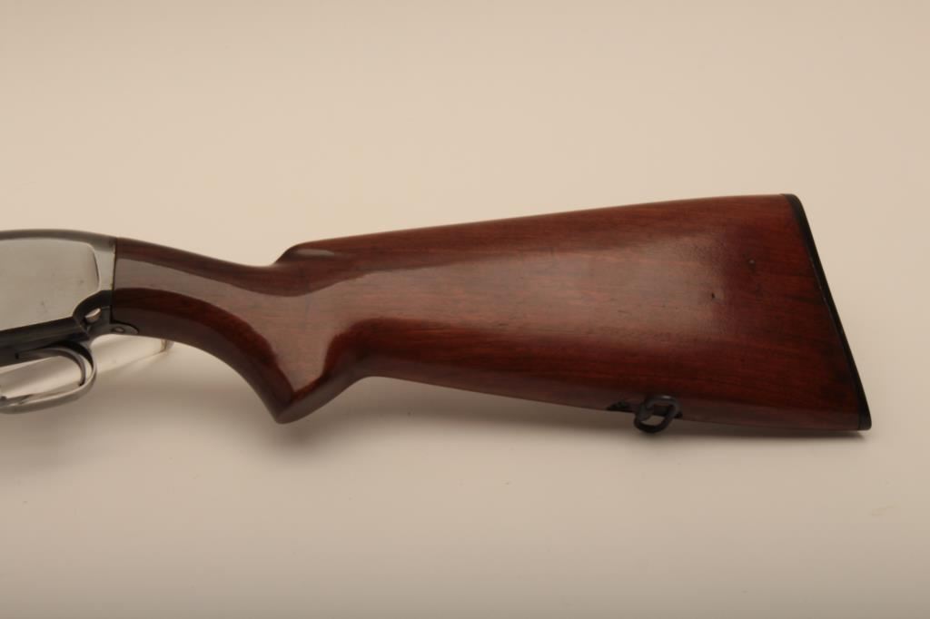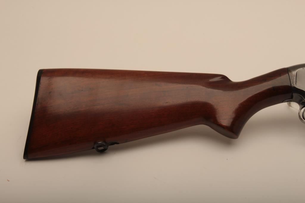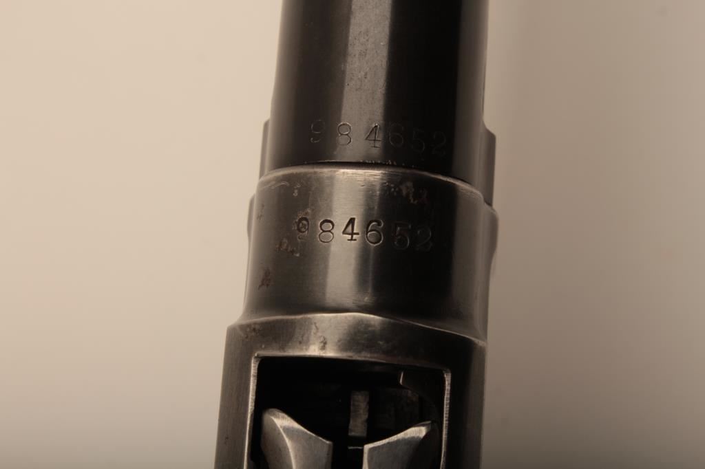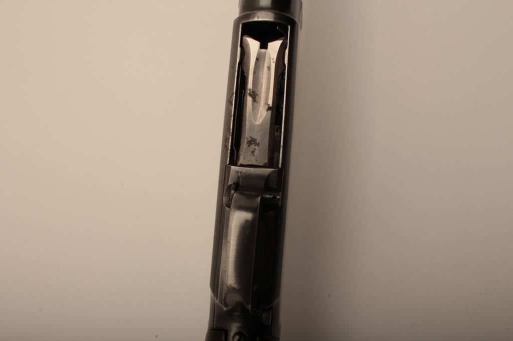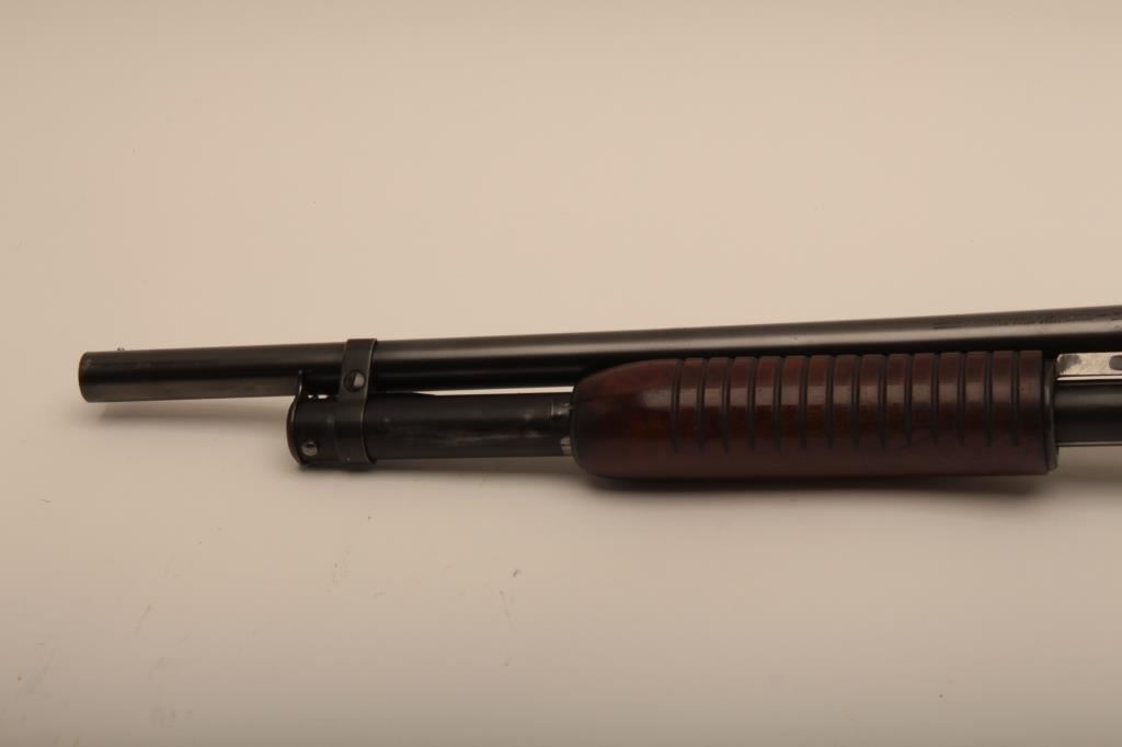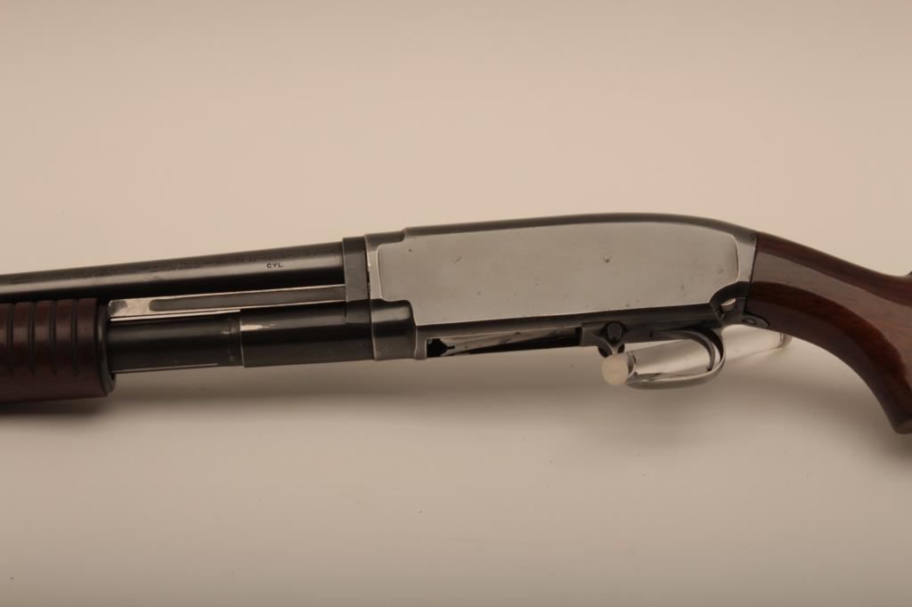 Winchester Model 12 U.S. Marked 12GA riot shotgun with 20” cylinder choked barrel, S/N 984652. 80%-90% original thinning blue finish with polishing to the edge of operating rod attached to pump mechanism. Stock lightly refinished showing outline of cartouche and R.I.A. Fire bomb proof at the breech and two Winchester proofs on the barrel and frame. Some minor pitting and erosion. Military type sling swivels. Original butt plate. Extended thumb safety with fancy knurling added (Probably P.D. as these were bought surplus and used by police agencies nationwide after WWII). A good example that’s genuine U.S. issue. (C&R). Est.: $500-$1000