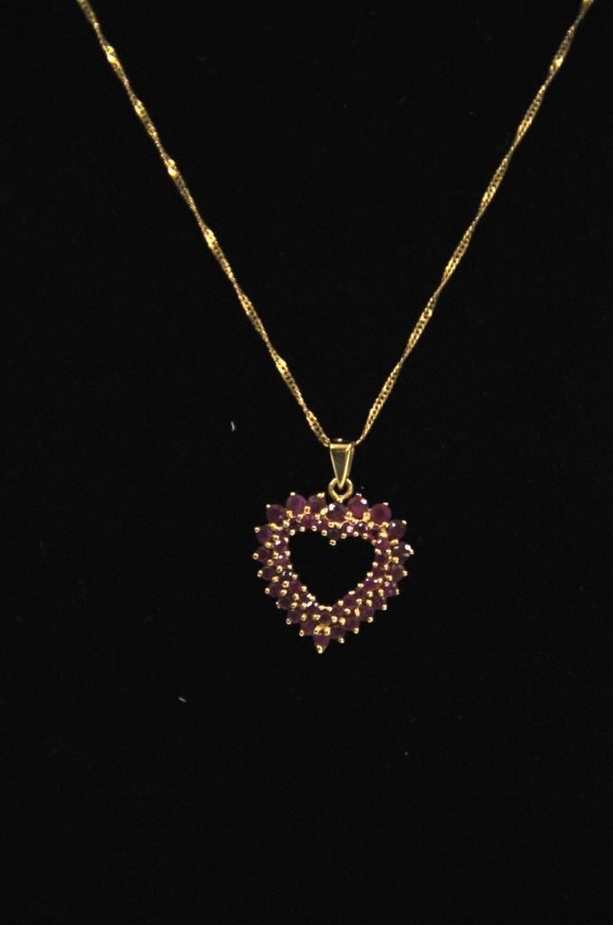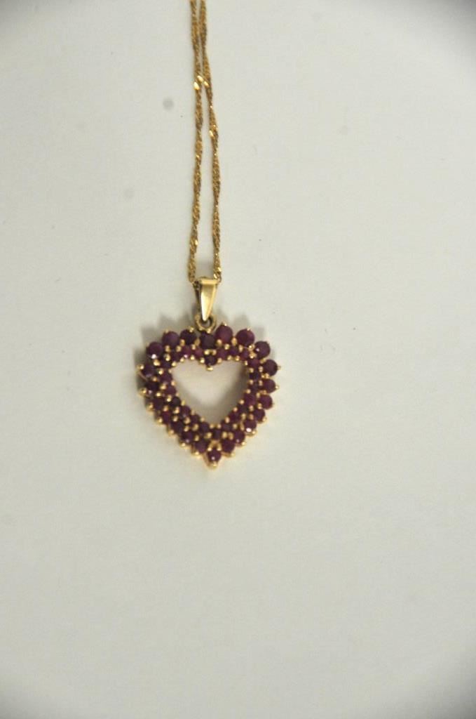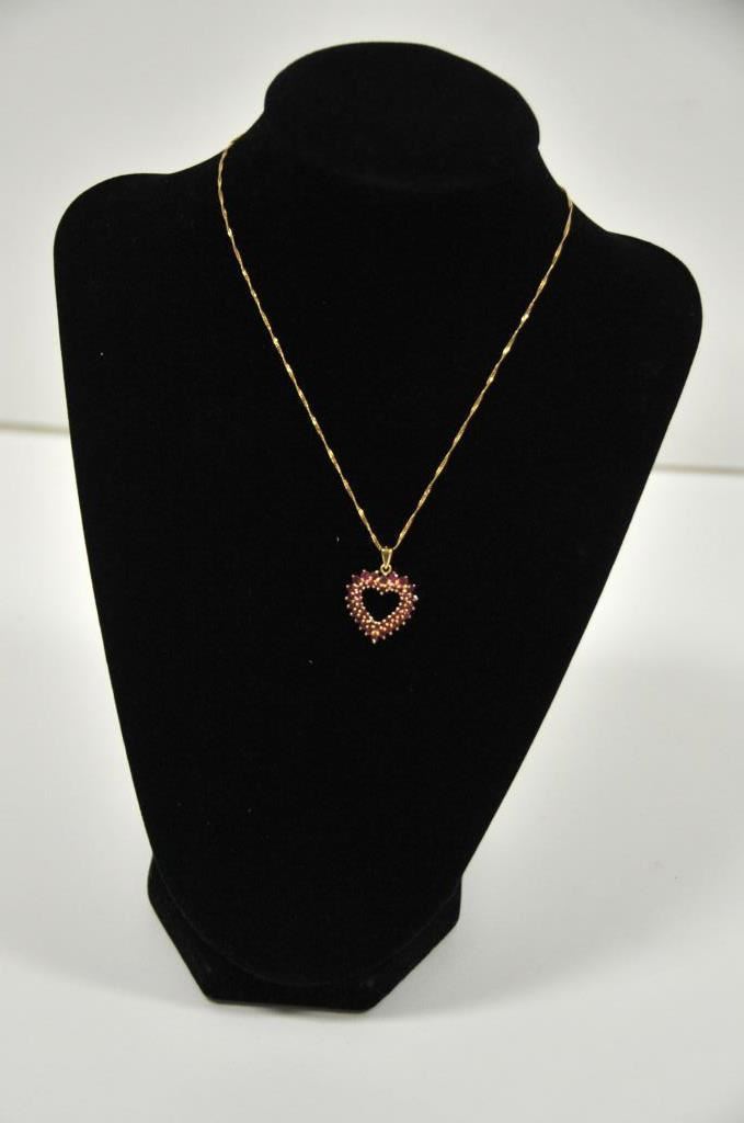 Garnet or rubies mounted in heart with thin chain. Unmarked 10-14k. Vintage. Est. $100-200