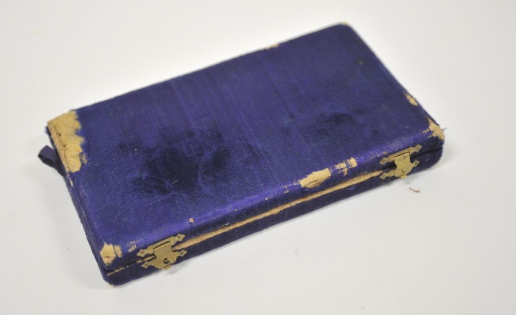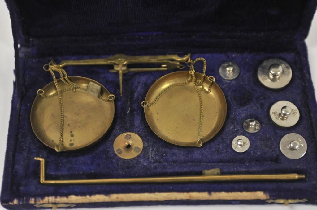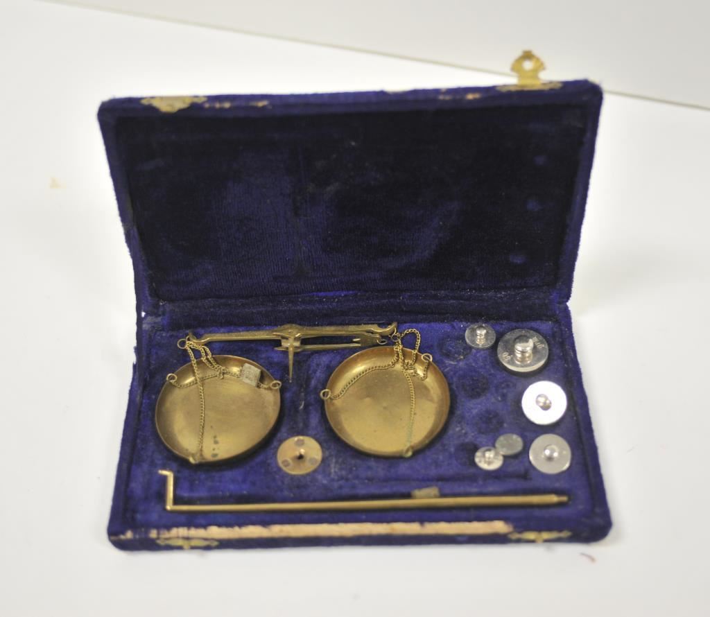 Portable brass scale set in grams (8 counter weights present) in case; approximately 9.5” x 5.5” with scattered damaged areas primarily to lid. Est.: $40-$60.