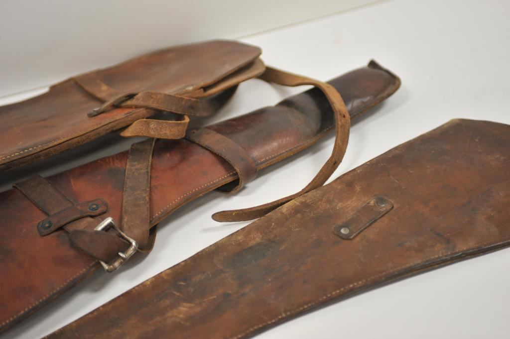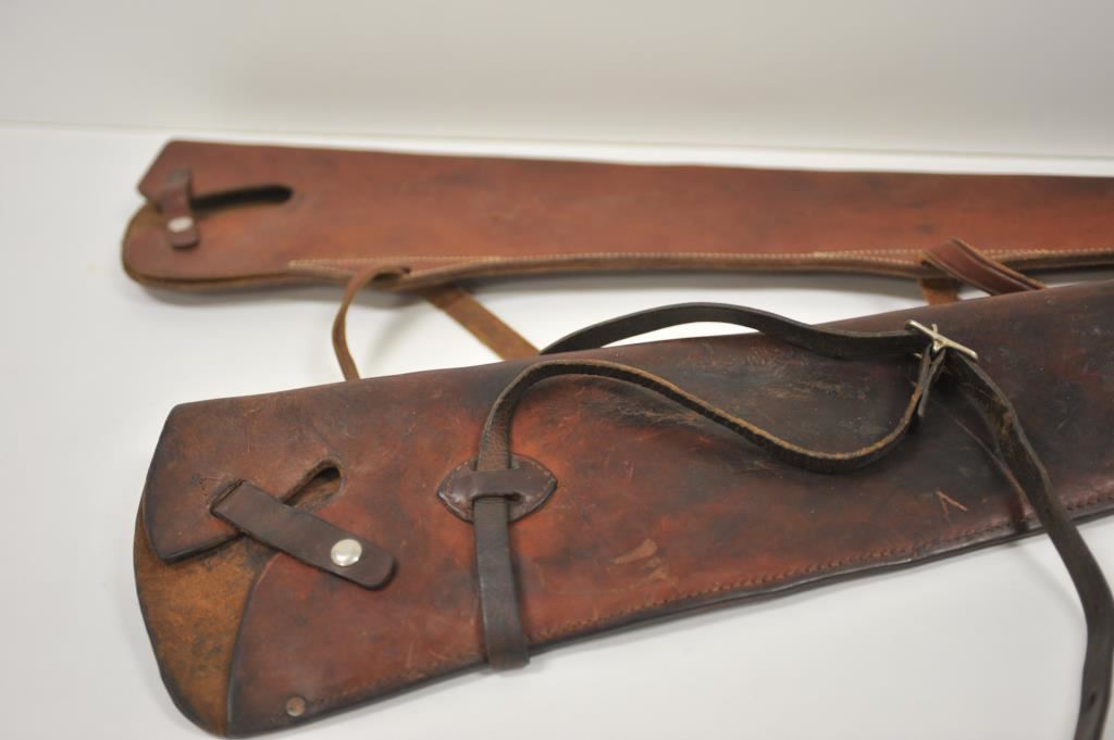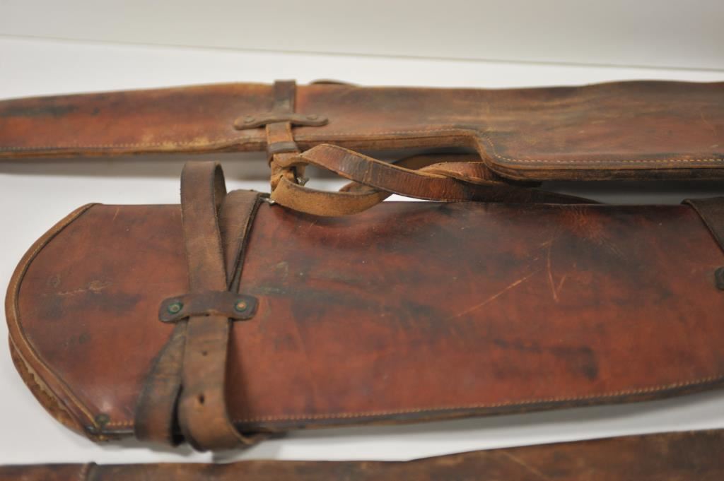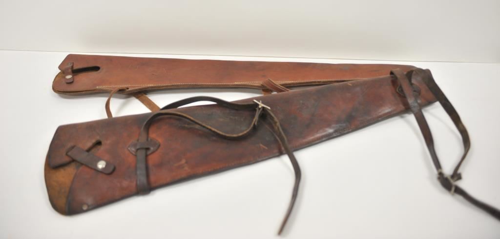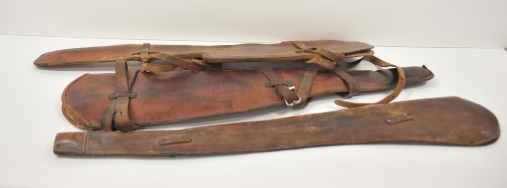 Lot of 5 misc. leather rifle scabbards, 3 un-marked, 1 is a Hunter brand and 1 is a Jumbo Brand by The Schoellkopf Co. Est.: $175-$350.