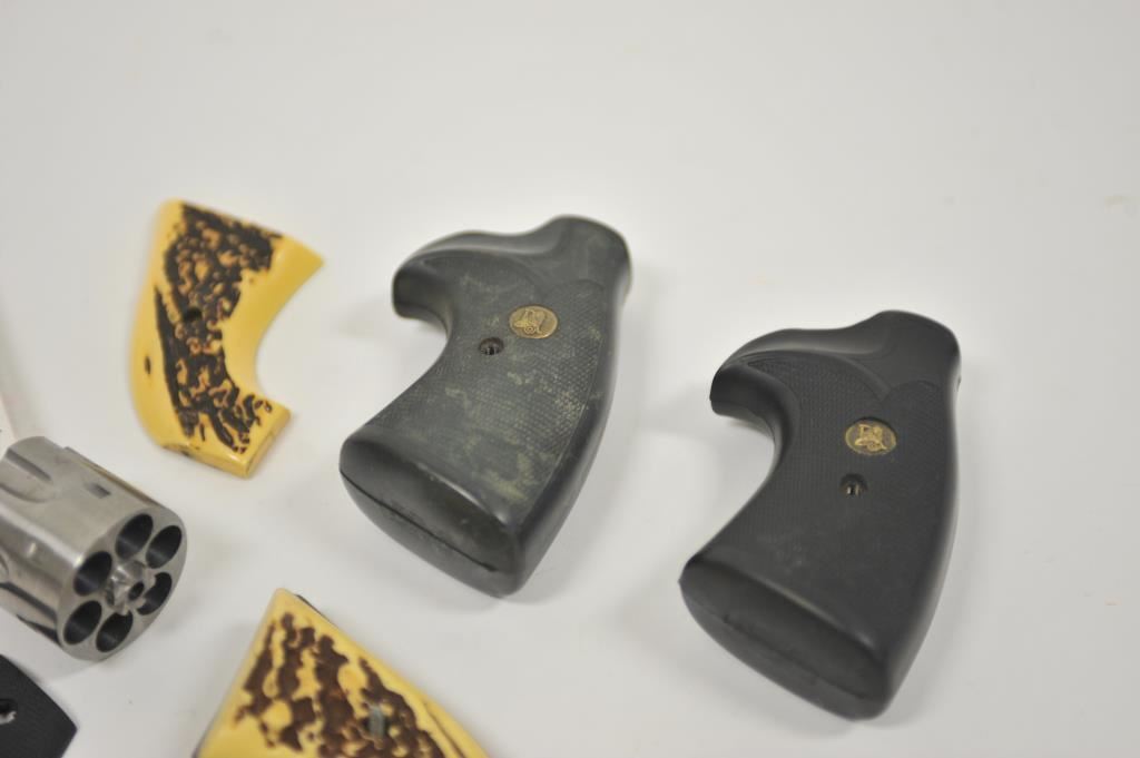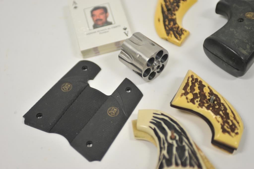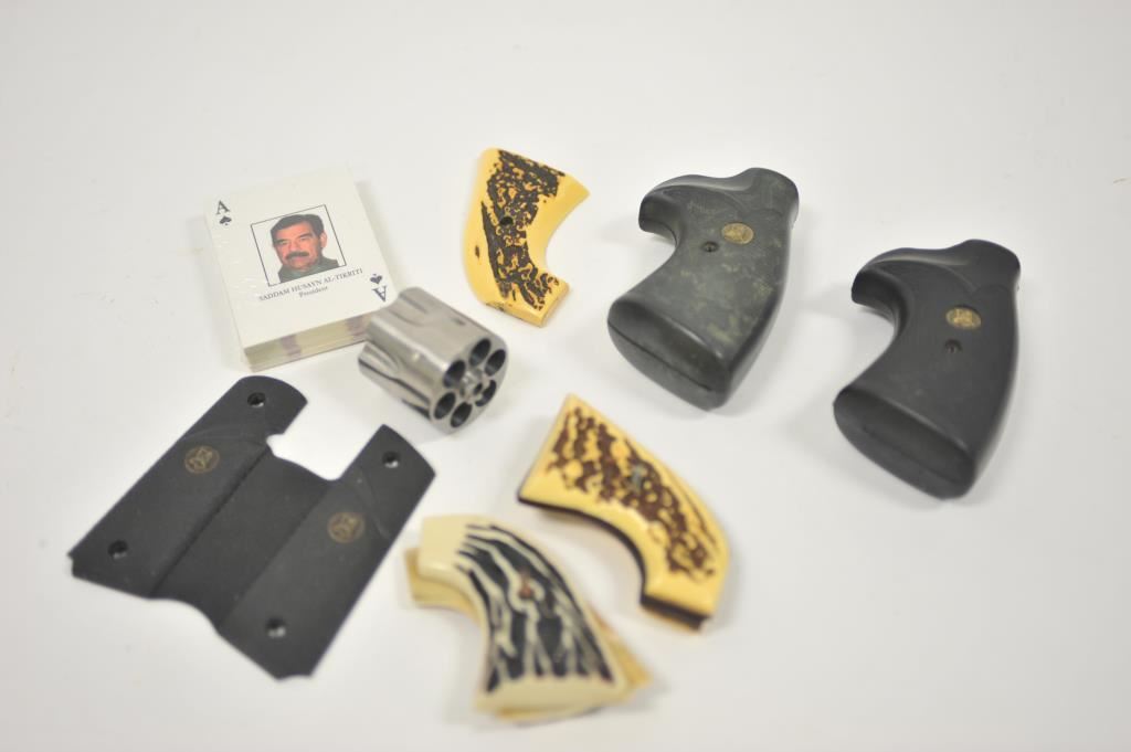 Misc. lot including 5 pair of replacement grips plus one extra left grip and a sealed pack of military playing cards with wanted officials from the first Iraq war; also a stainless steel revolver cylinder, un-marked. Est.: $50-$75.