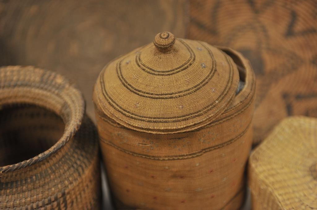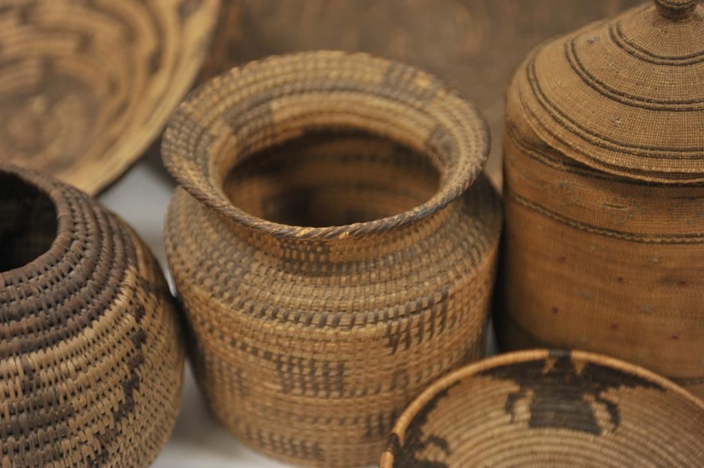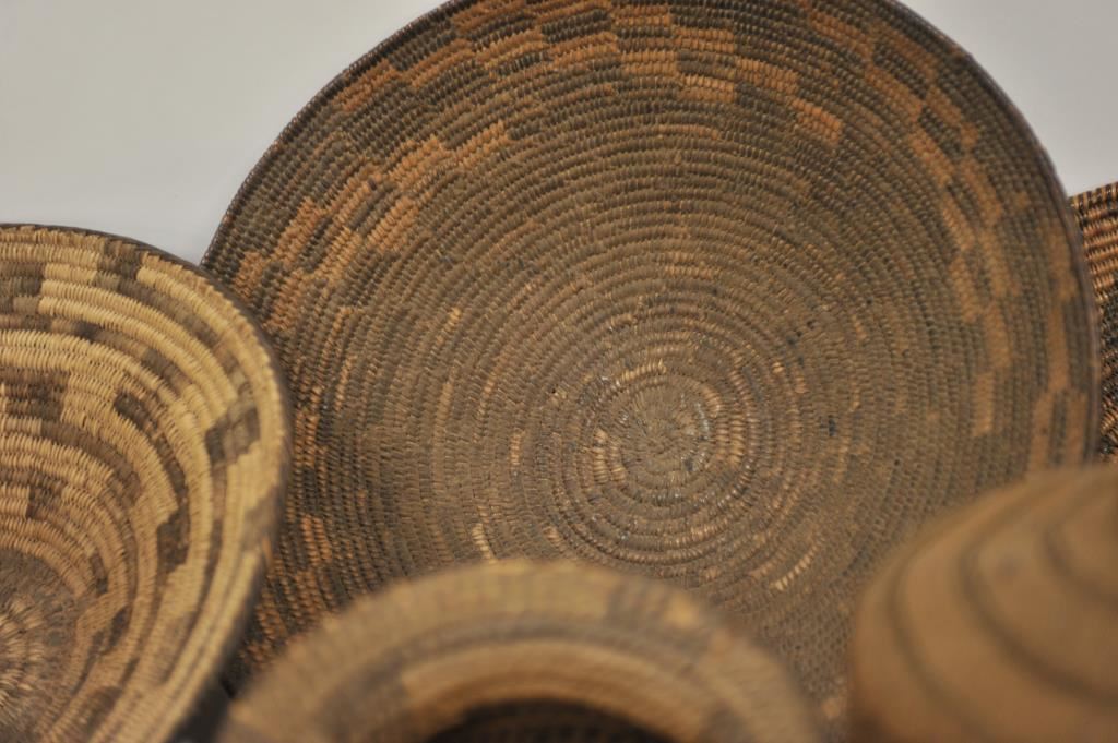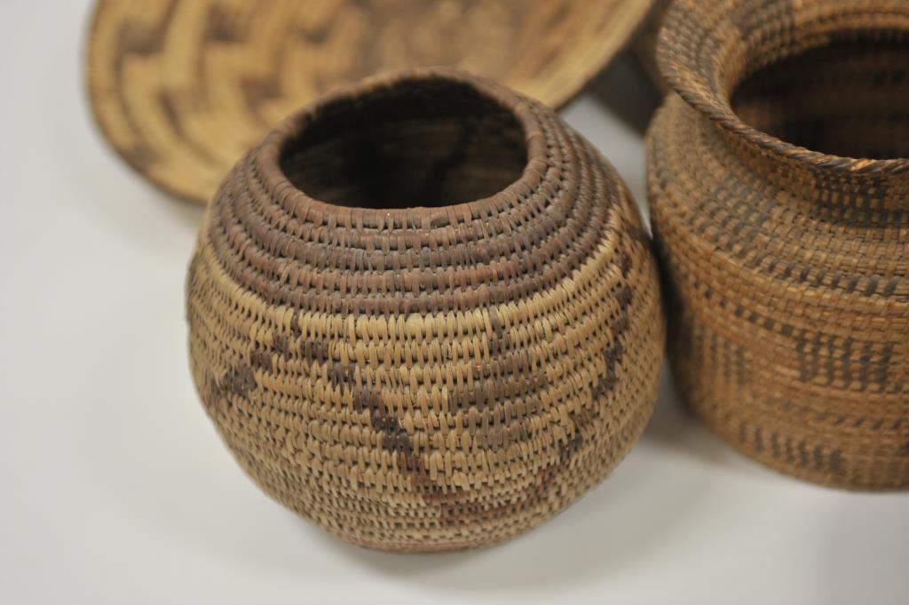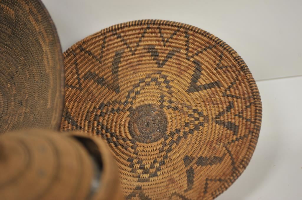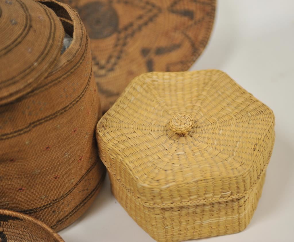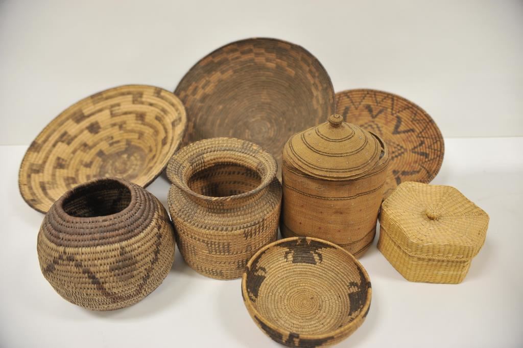 Great lot of 8 varied Indian baskets; all in overall good condition and showing age; include a large circular basket approximately 15” in diameter and 4” in height; another circular basket approximately 14” in diameter and 4” in height, a smaller circular basket approximately 12” in diameter and 2” in height; 1 bowl basket approximately 8” in diameter and 7” in height; 1 rounded basket also approximately 8” in diameter and 7” in height; 1 a finely small “stitch” round basket with lid approximately 7” in diameter and 10” in height with some damage to upper rim; 1 a small basket with 4 spread eagle woven decorations approximately 7” in diameter and 2.5” in height and 1 small basket with cover, 6 sided approximately 6” in diameter and 4” in height. Est.: $800-$1,600.