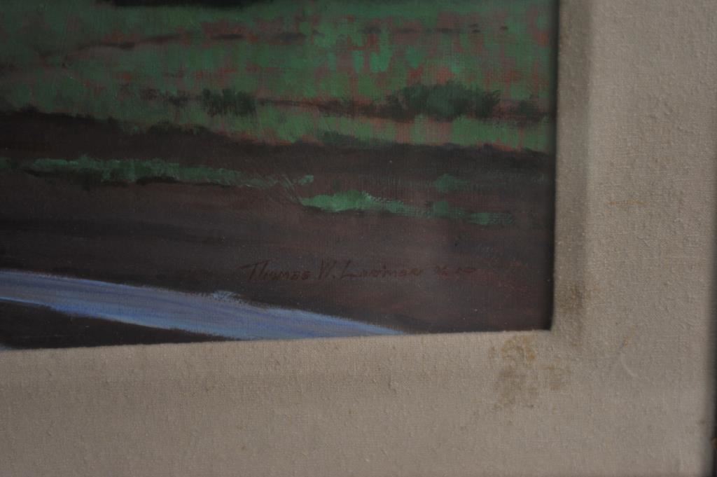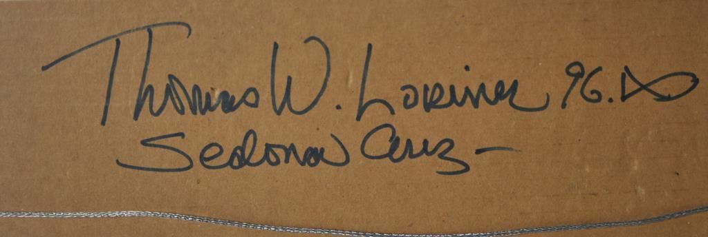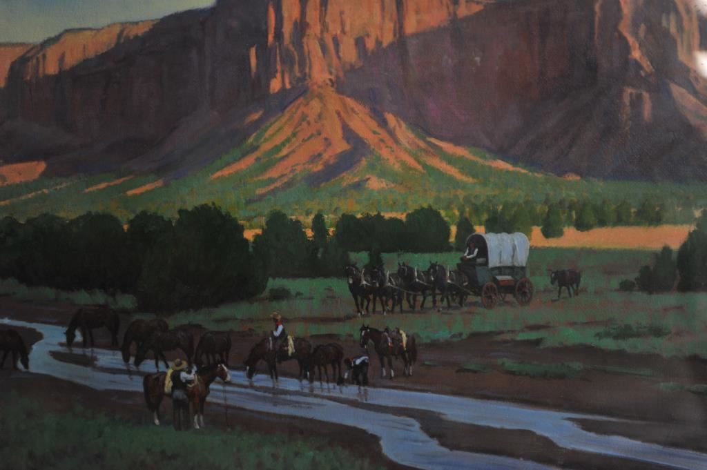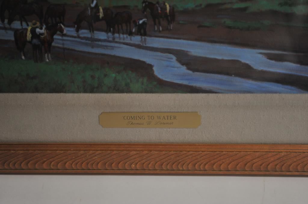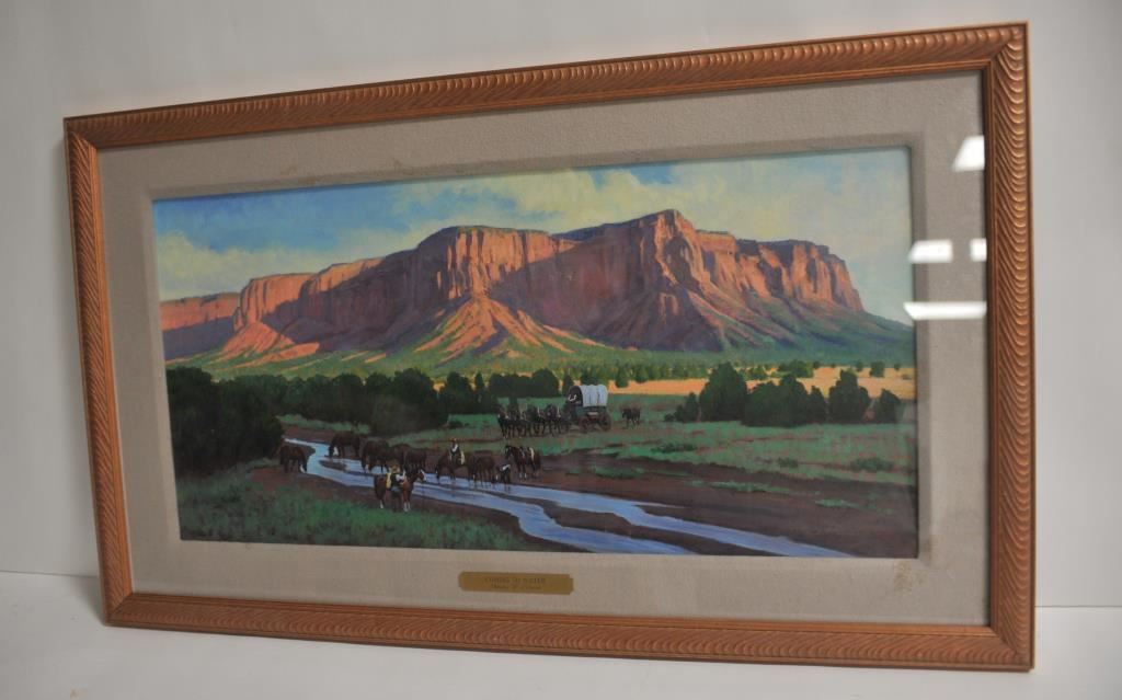Framed original painting by Thomas W. Lorimer entitled “Coming to Water”; approximately 22” x 37” overall and beautifully accomplished showing cowboys and chuck wagon at stream with Sedona, Arizona mountains in background. Est.: $1,000-$1,500.