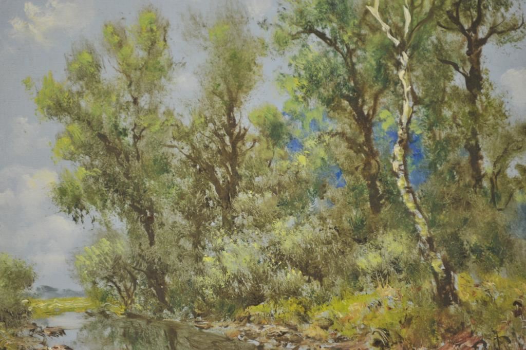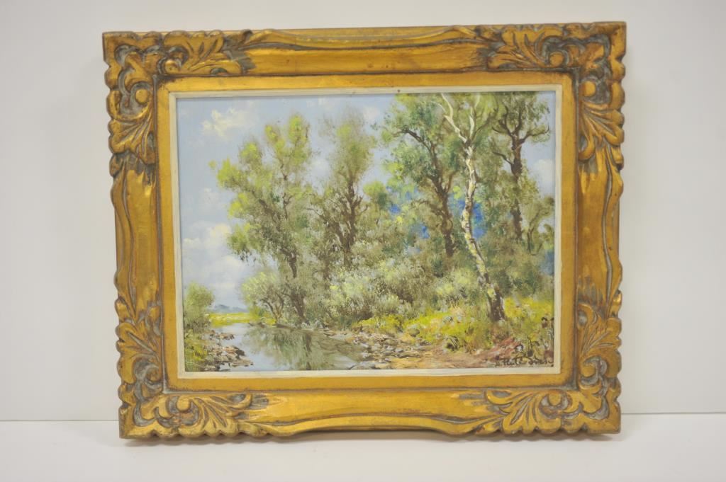 Framed oil on canvas of trees and stream; approximately 17” x21” overall’ artist signature not readable. Est.: $50-$100.