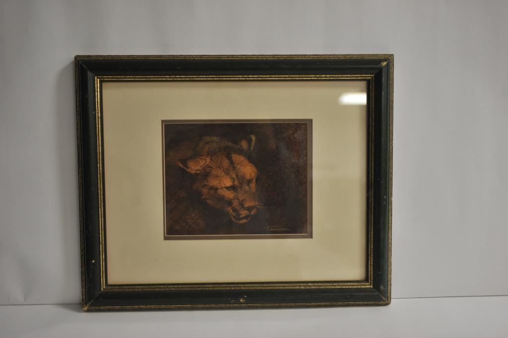 Framed and matted pencil drawing by Tom Sanders of Mountain Lion; approximately 17” x 21” overall. Est.: $200-$400.