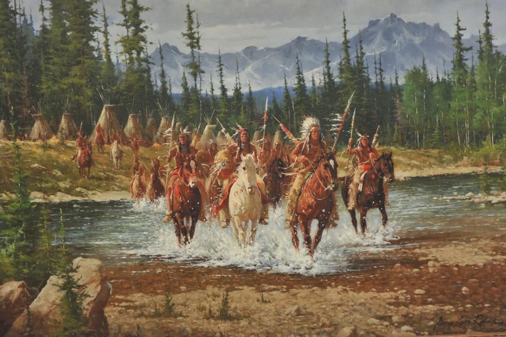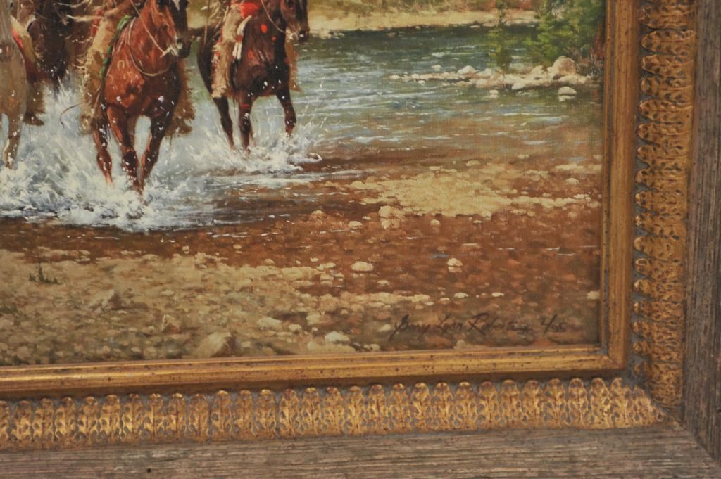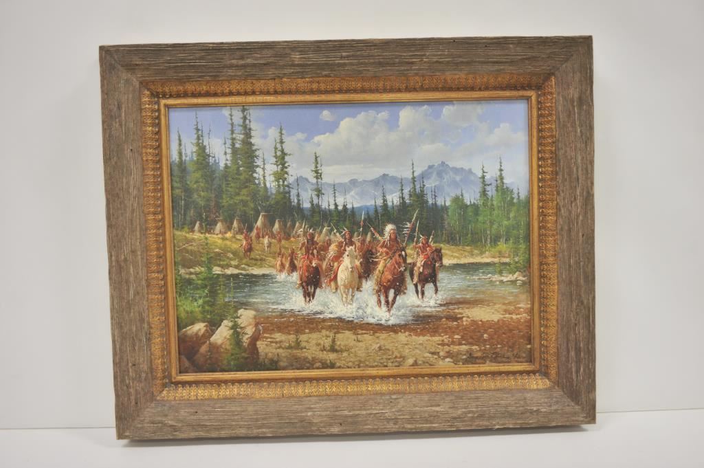 Framed Giclee print by Gary Lynn Roberts (2/95) showing Indian War Party leaving village; approximately 27” x 31”. Est.: $150-$300.