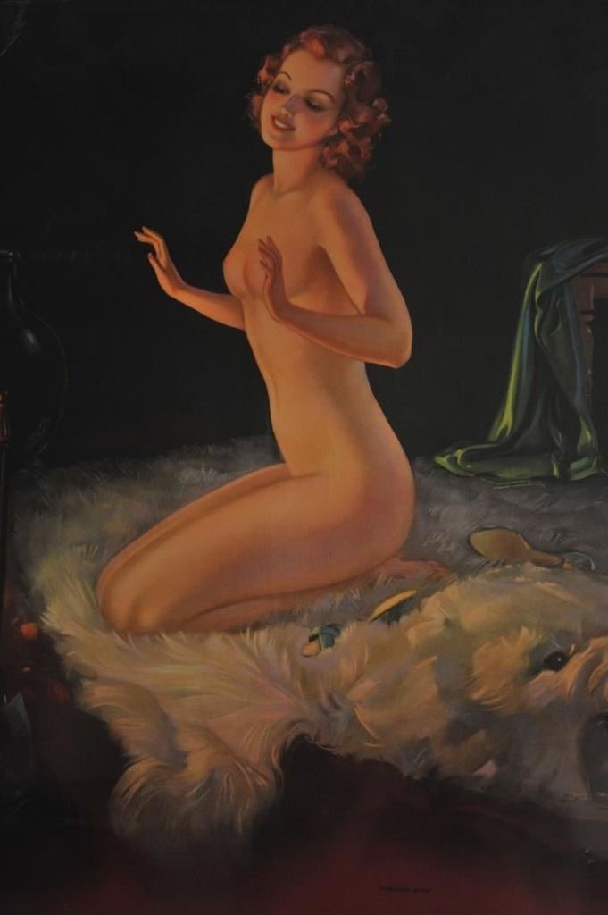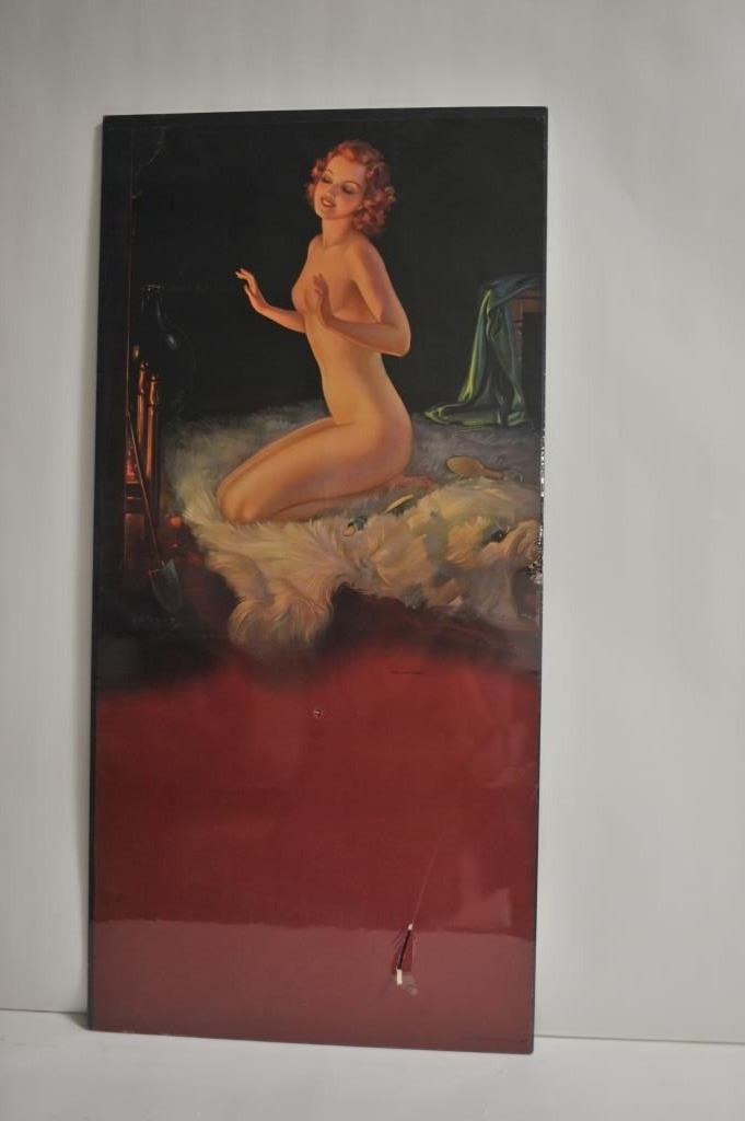 Color pin-up paper art litho entitled “Firelight Glow” 34” x 16” overall; slight damage to lower right area not affecting image of pin-up girl. Est.: $25-$50.