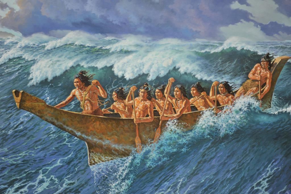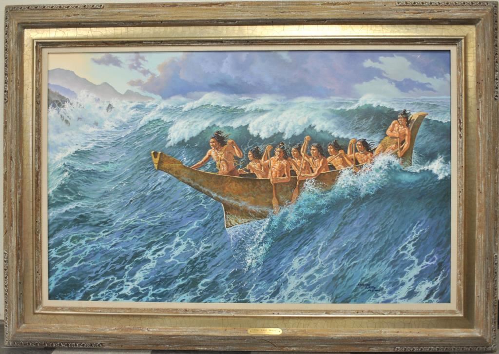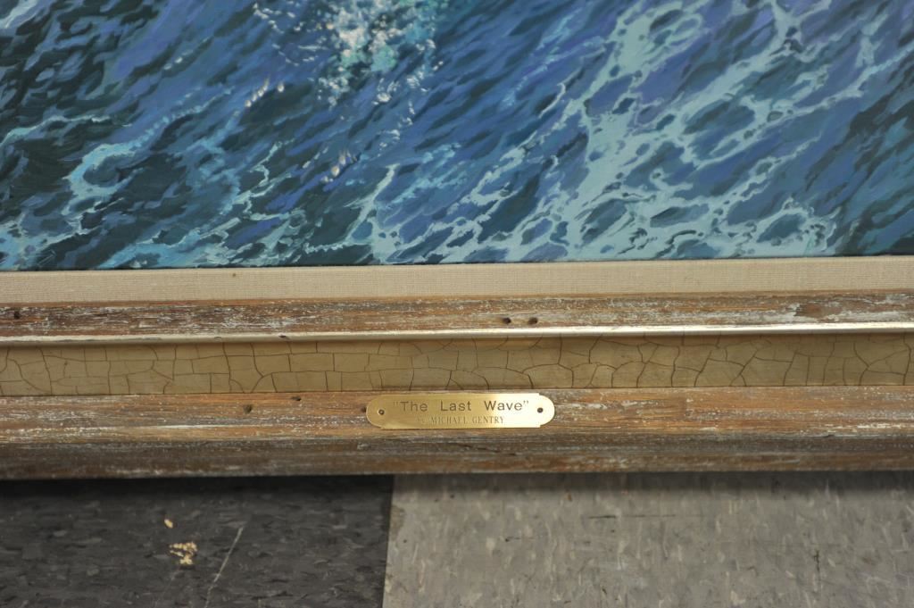 Large framed original oil painting of Indians maneuvering a large wooden canoe in the surf by Michael Gentry entitled “The Last Wave”; approximately 42” x 61” overall and beautifully accomplished. Est.: $1,000-$1,800.