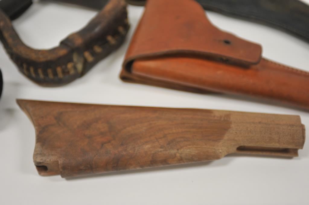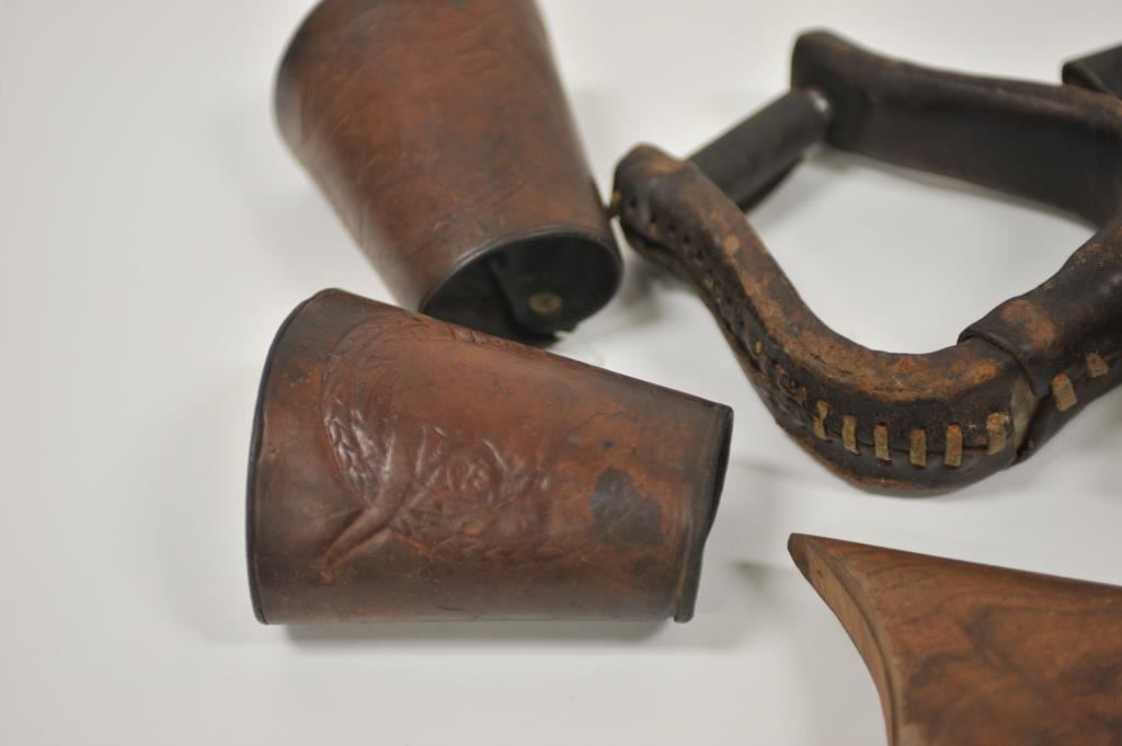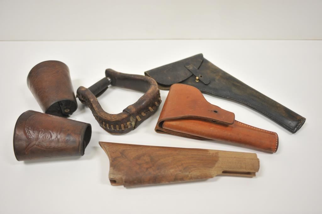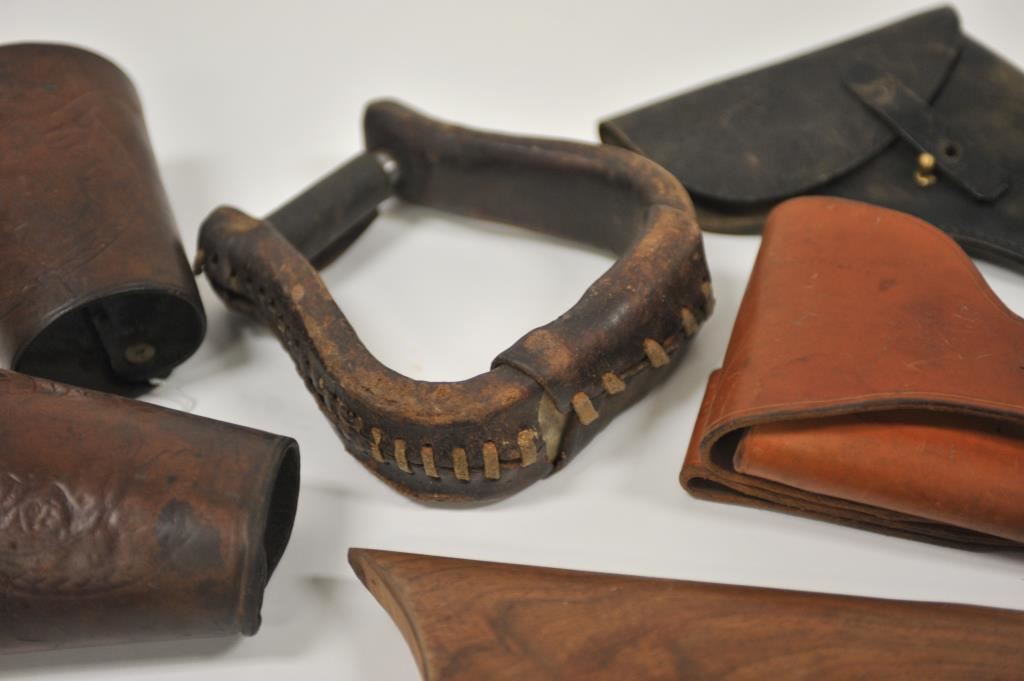 Misc. lot including an old pair of leather covered stirrups; a pair of tooled leather wrist cuffs; a leather double loop holster with H.H. Heiser marked cartridge belt; another tooled leather cartridge belt; an un-marked leather flap holster for a semi-automatic pistol; a reproduction leather flap holster for a long barrel percussion revolver; a wood butt stock for a Winchester lever action rifle and 2 leather saddle tabs marked “J.S. Collins & Co/Miles City, M.T.”. Est.: $400-$800.