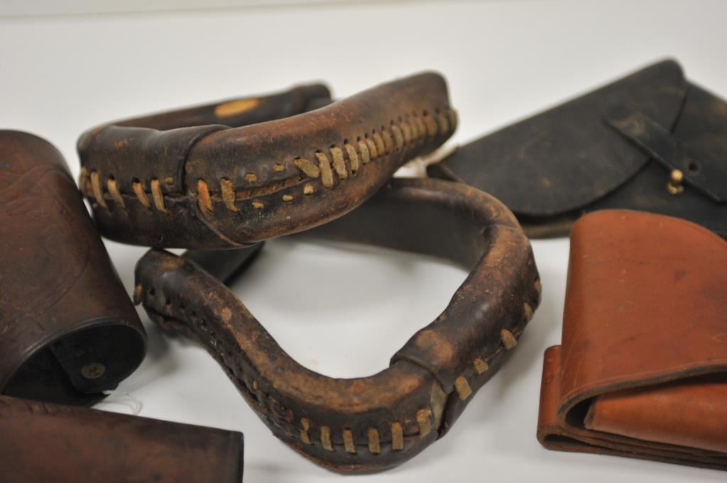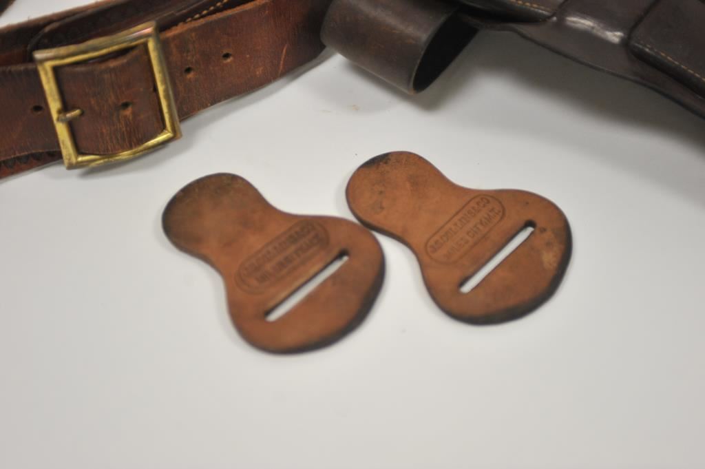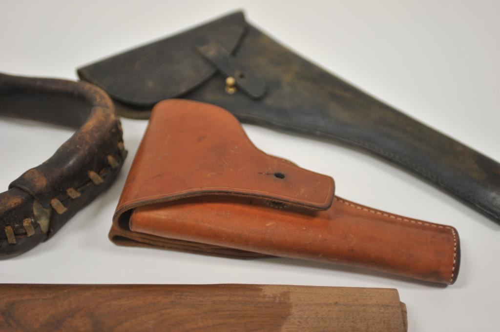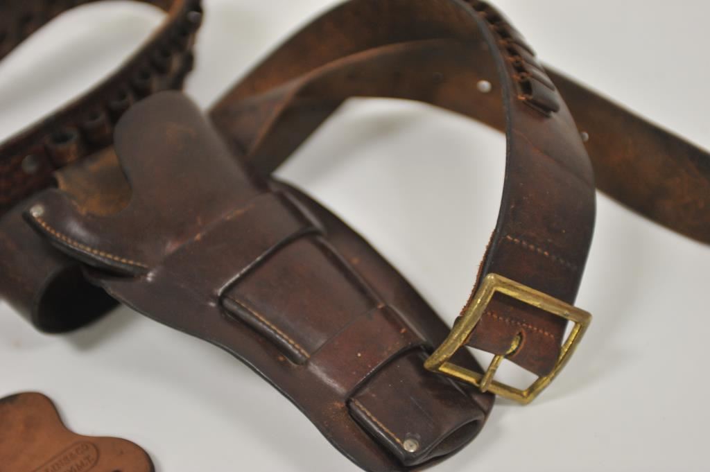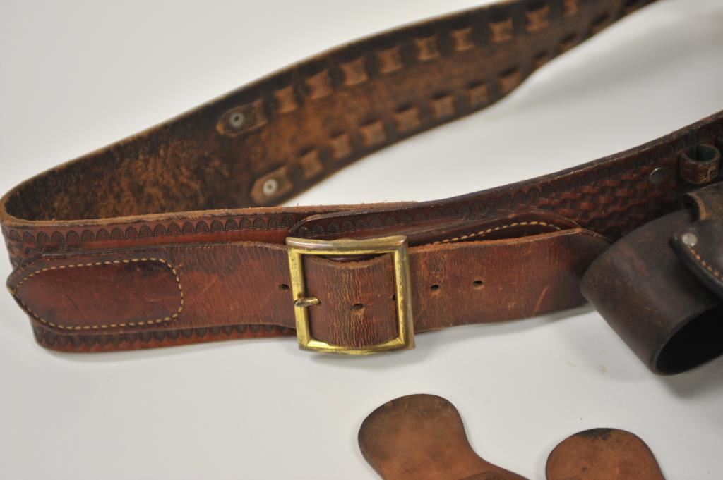 Misc. lot including an old pair of leather covered stirrups; a pair of tooled leather wrist cuffs; a leather double loop holster with H.H. Heiser marked cartridge belt; another tooled leather cartridge belt; an un-marked leather flap holster for a semi-automatic pistol; a reproduction leather flap holster for a long barrel percussion revolver; a wood butt stock for a Winchester lever action rifle and 2 leather saddle tabs marked “J.S. Collins & Co/Miles City, M.T.”. Est.: $400-$800.