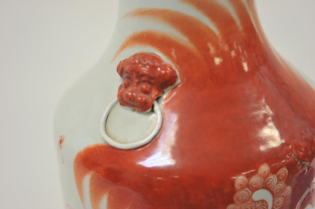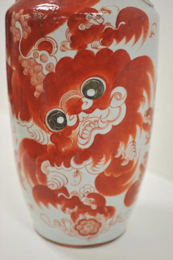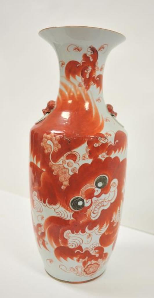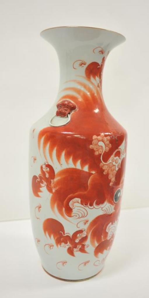 Large decorated Chinese porcelain vase, approximately 23” in height and displaying vibrant red colored deities with extensive Chinese characters on one side of the vase; bottom of vase has Chinese marking too. Est.: $300-$500.