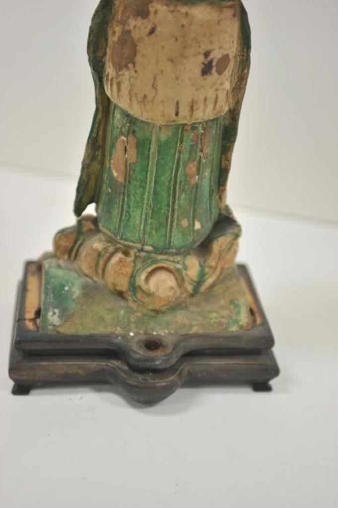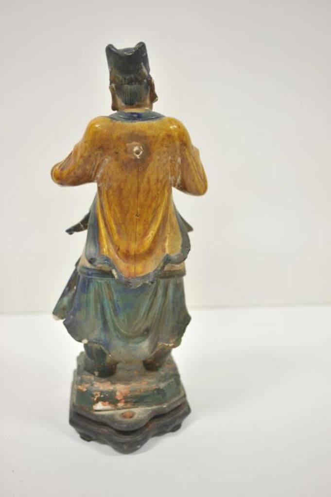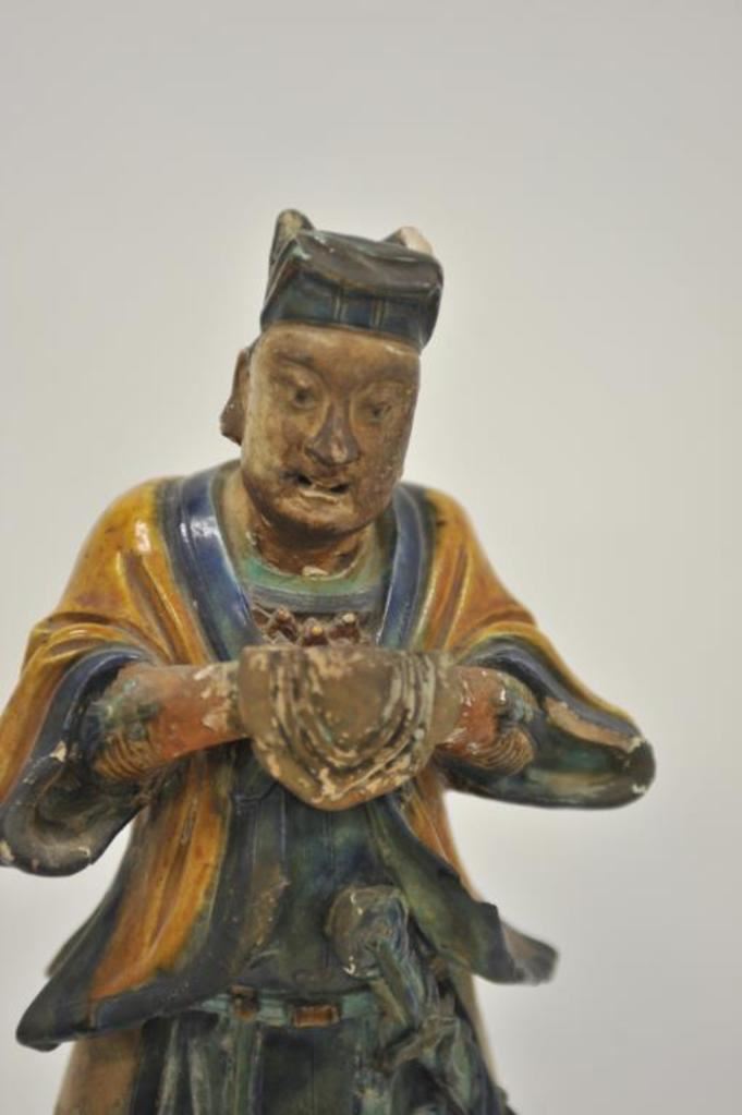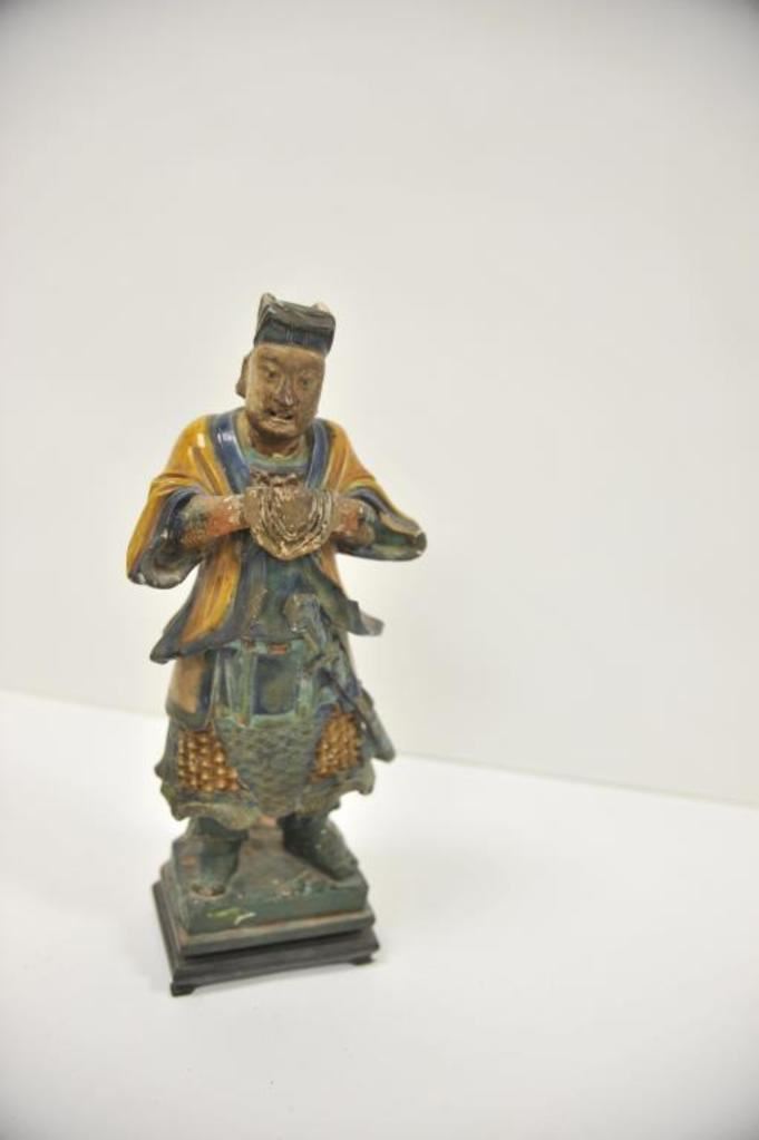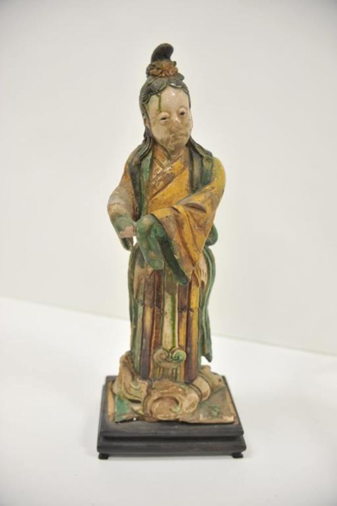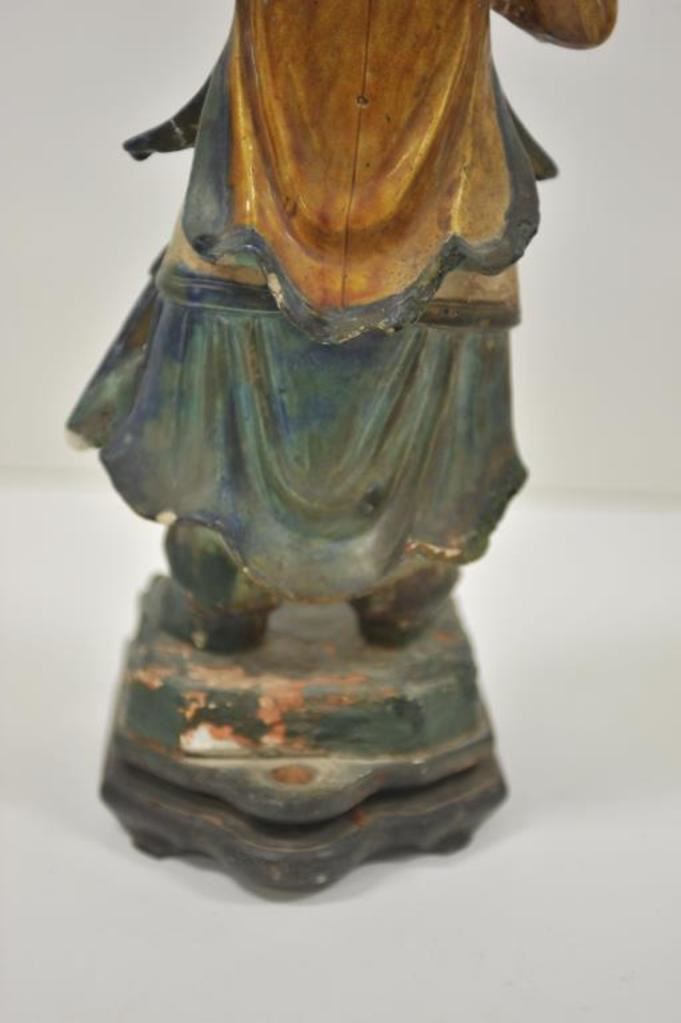 Lot of 2 old porcelain oriental figures on wooden stands of a man and a woman; each approximately 17” in height including stands; some old scattered damage. Est.: $400-$600.