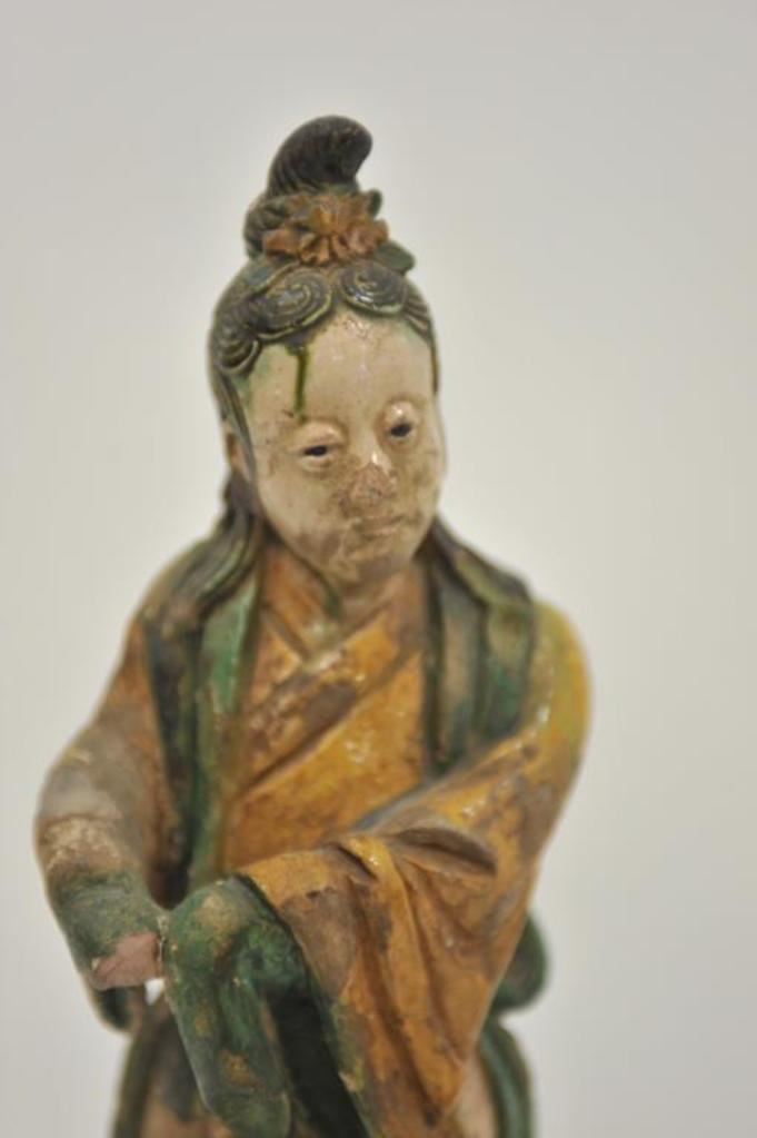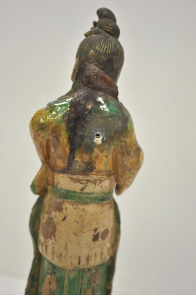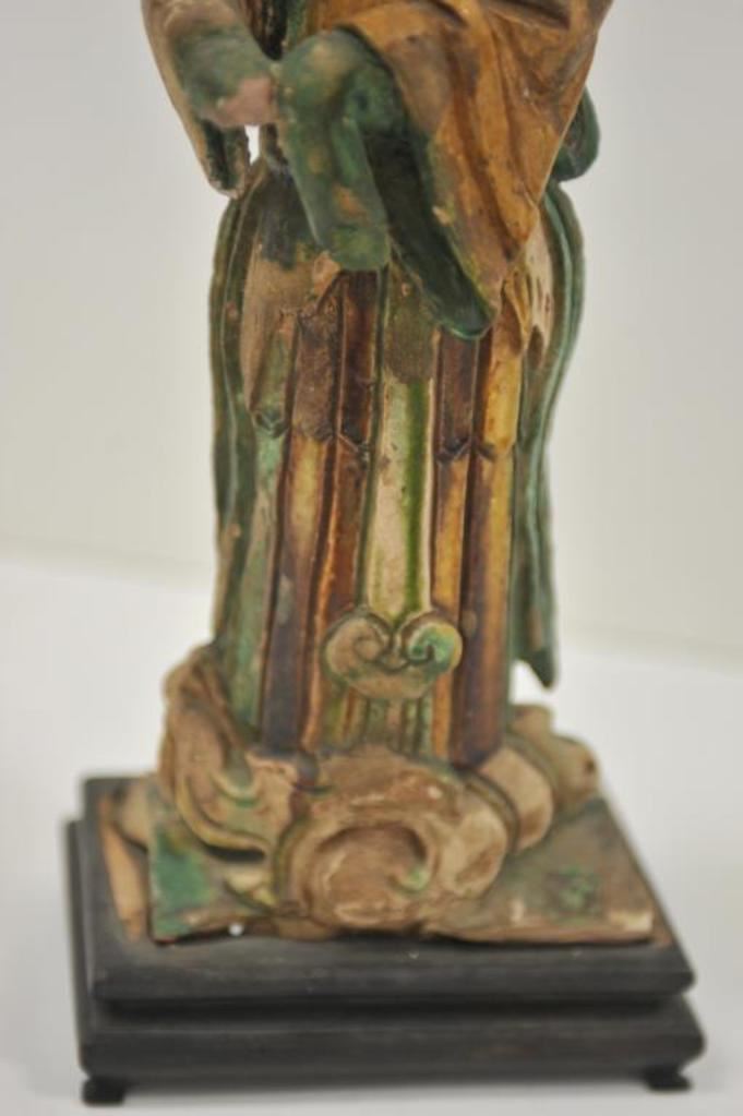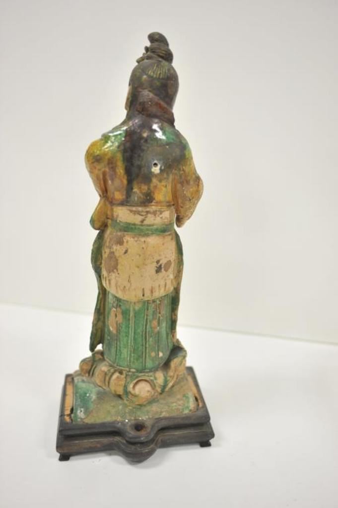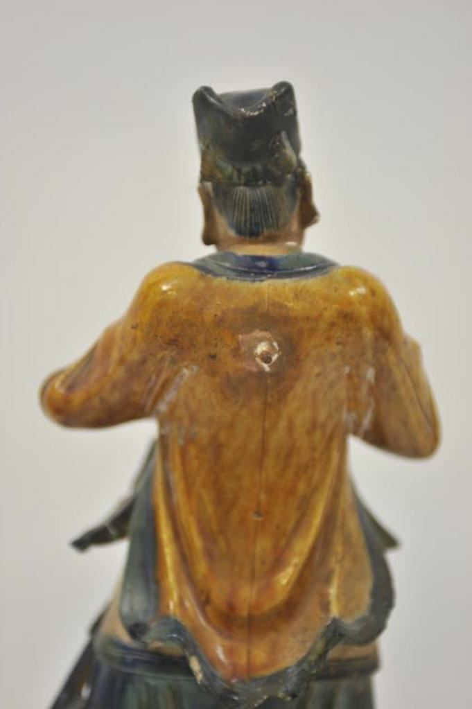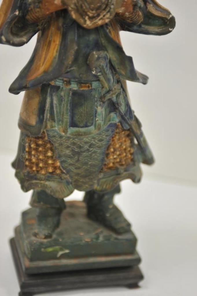 Lot of 2 old porcelain oriental figures on wooden stands of a man and a woman; each approximately 17” in height including stands; some old scattered damage. Est.: $400-$600.