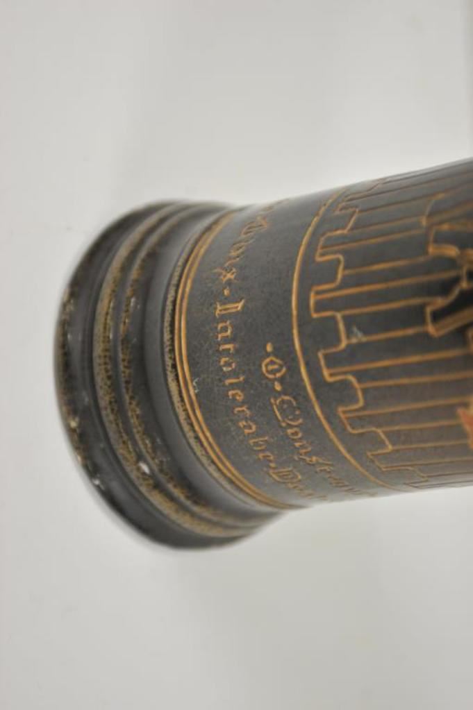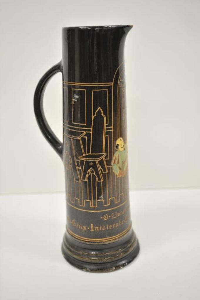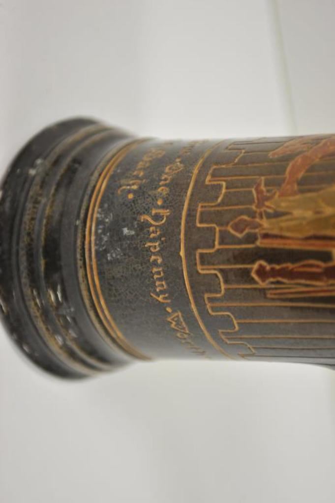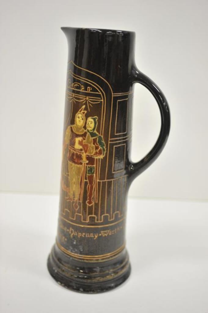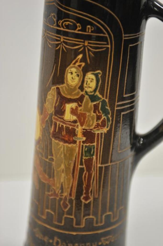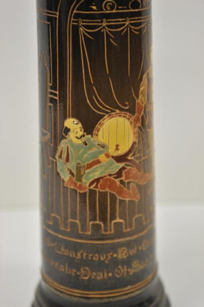 Large old drinking stein; approximately 17” in height with drinking figures in design work; bottom of stein is marked “Dickens ware/Weller/480/6/Y”; small chips to finish on rim. Est.: $300-$400.