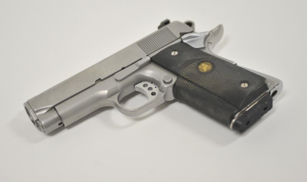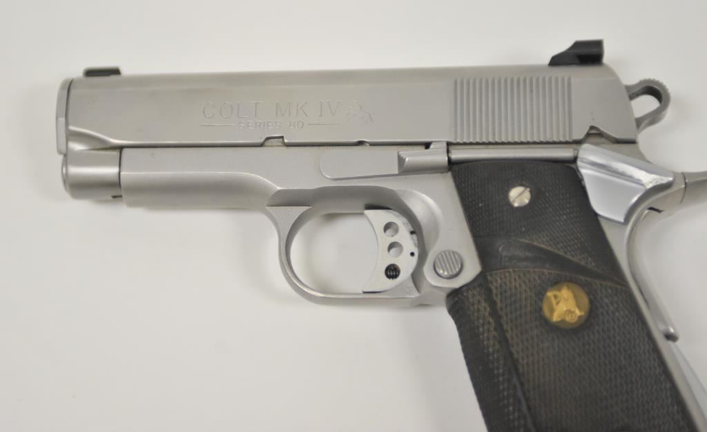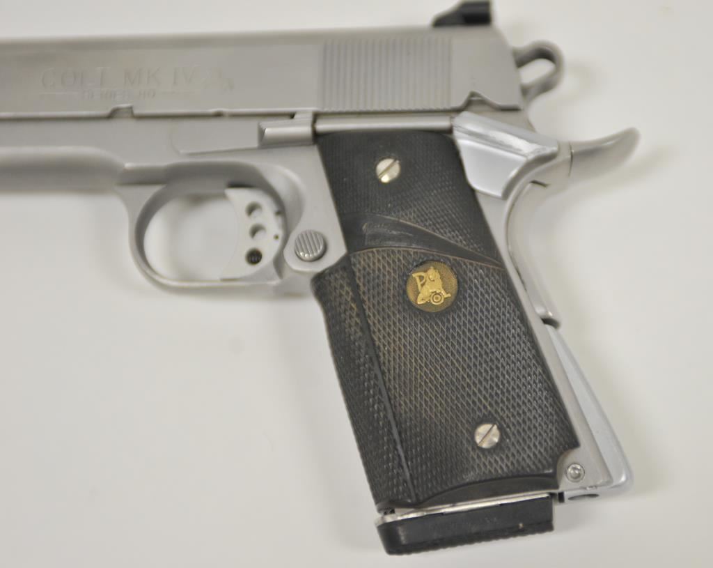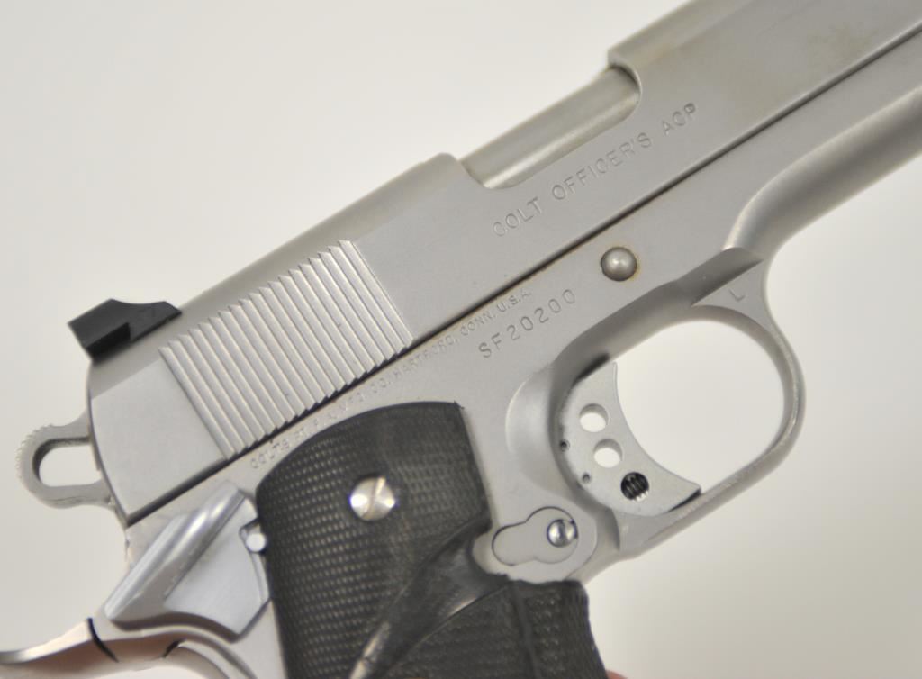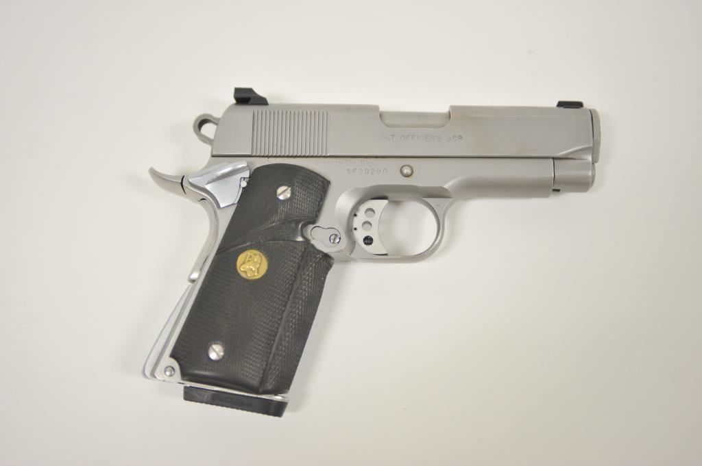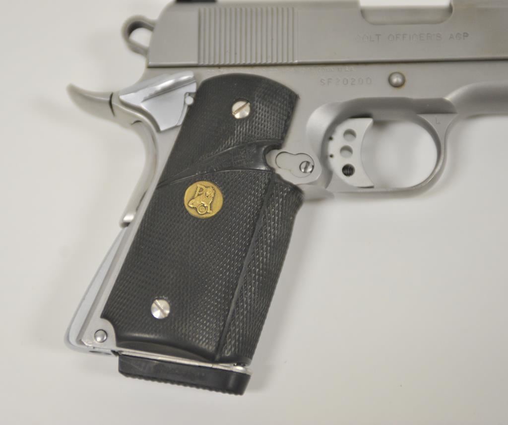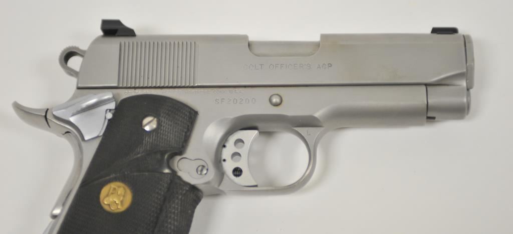 Colt Officer’s Model ACP in .45 ACP caliber Semi-Auto pistol, S/N SF20200. Customized and upgraded bushing and spring, trigger, sights, action and other work. Pachmayr grip and mag. combat ready. Very good plus used condition. (Modern/PPT) Est.: $700-$1400