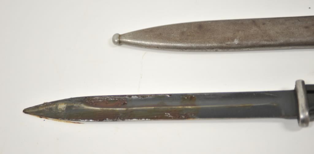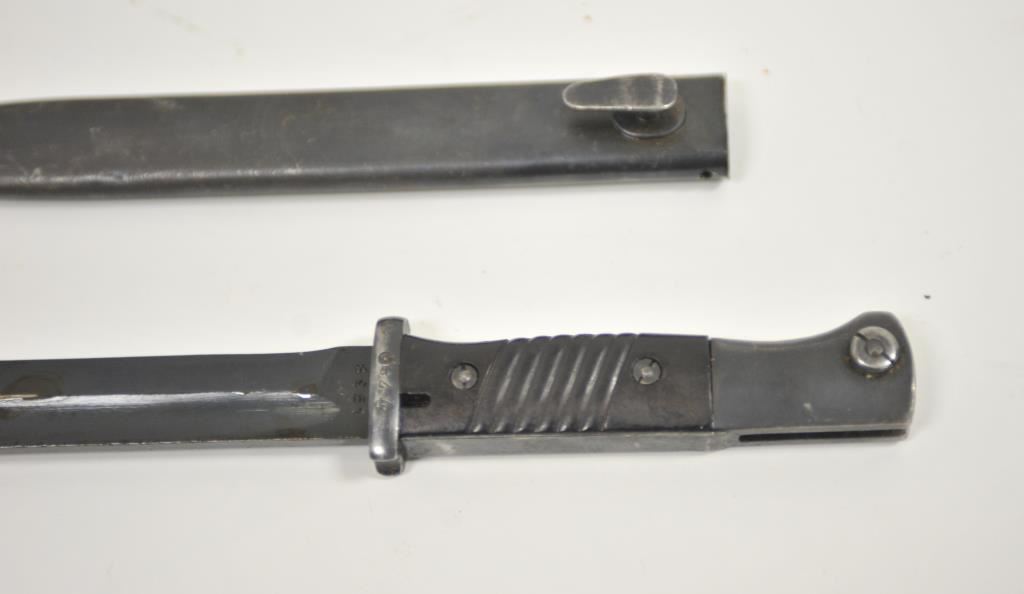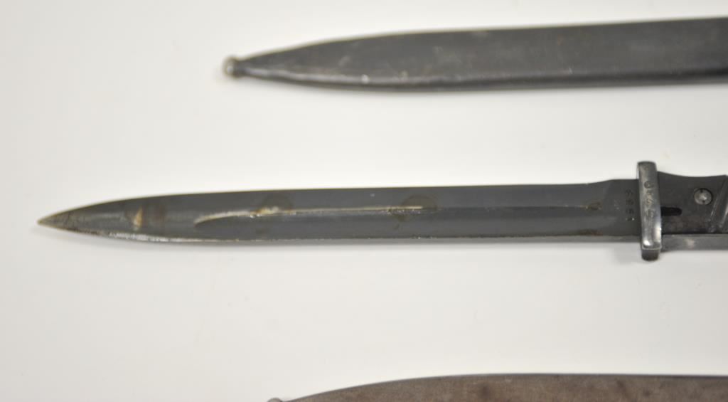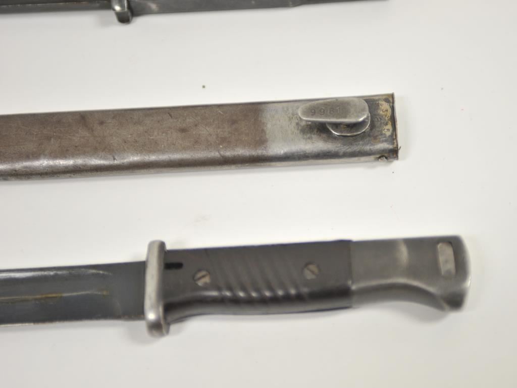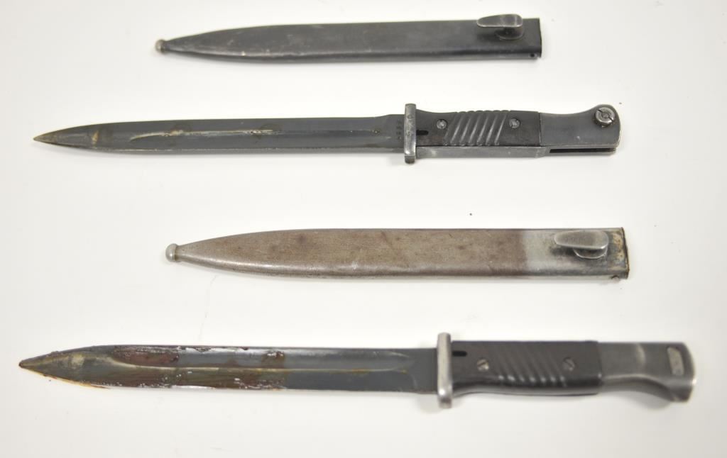 Lot of two Nazi era Model 98 Bayonets. 1. “42 CVL” marked #8951 and scabbard “42 Co. F” marked Waffen proofs. Hilt numbered 7782. Very good with most blue on the blade. Many dents to scabbard. Good grip. 2. Blade refinished and markings are light. With scabbard. Fair plus to good. Est.: $125-$250