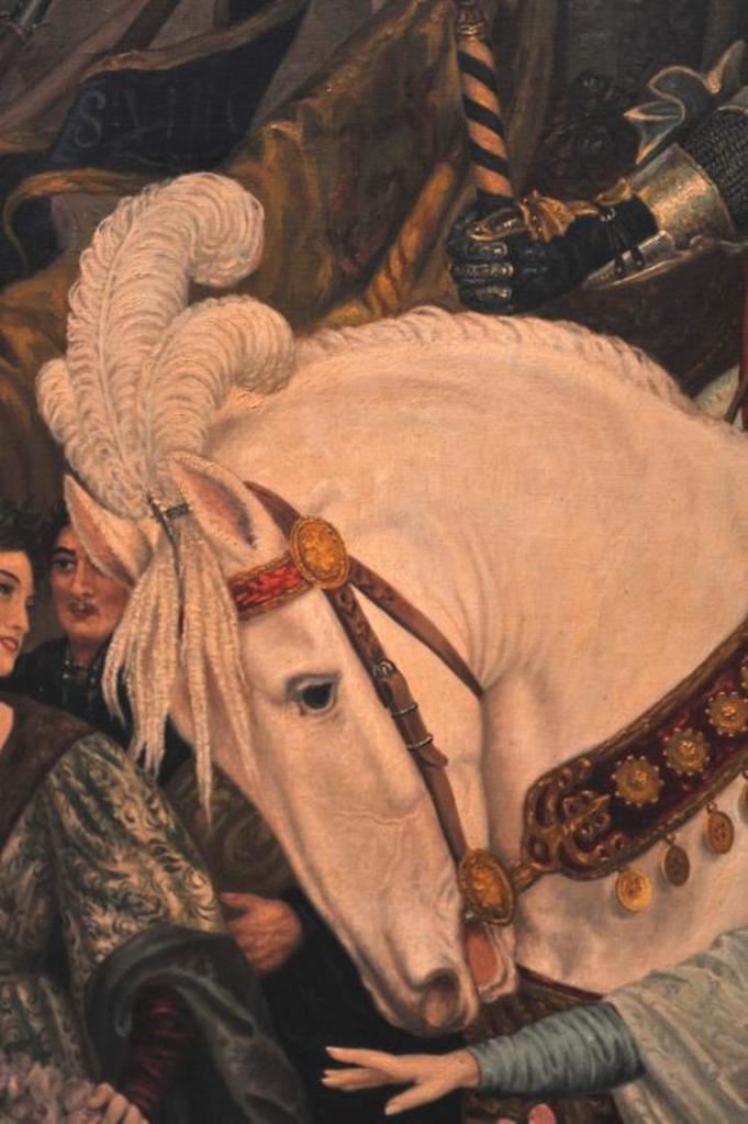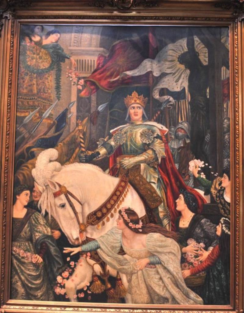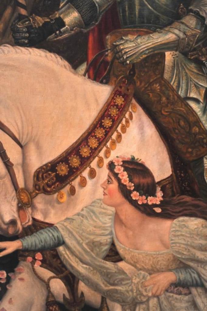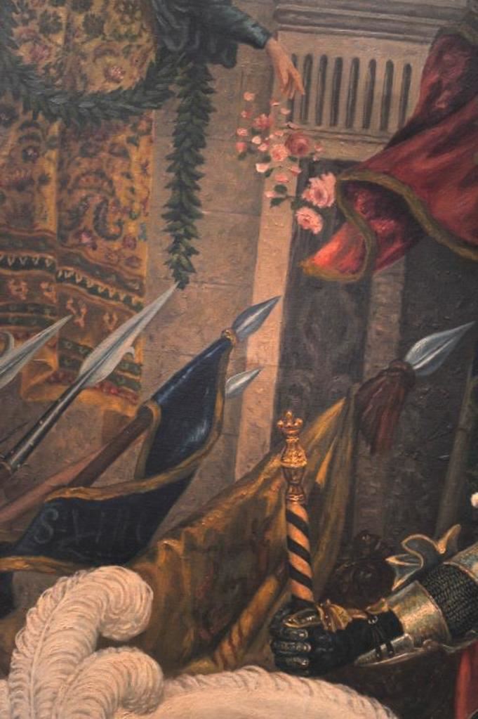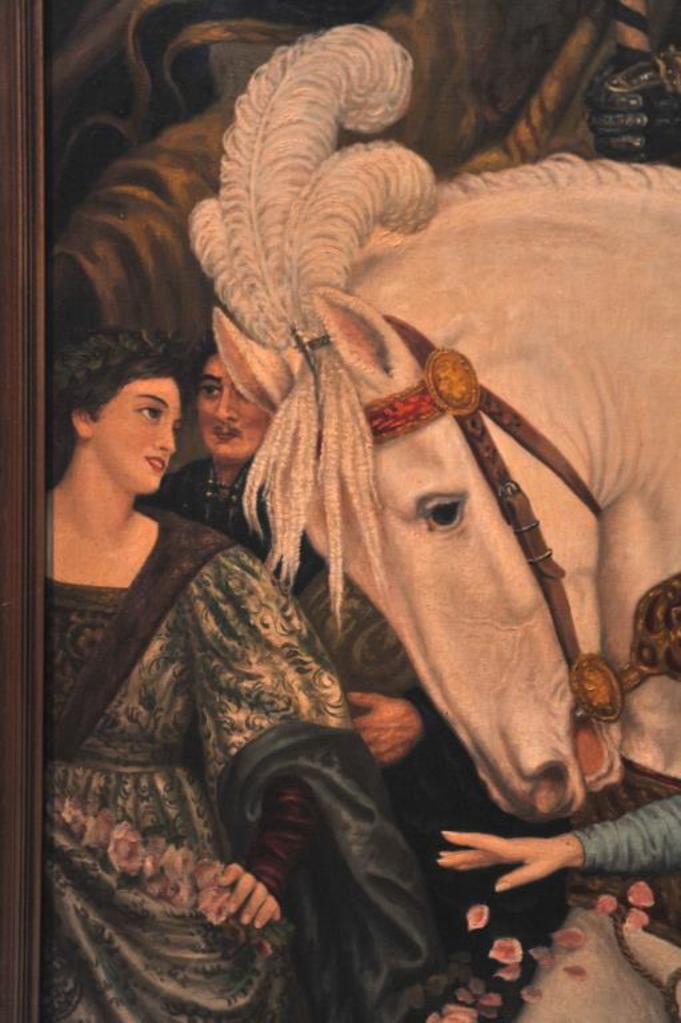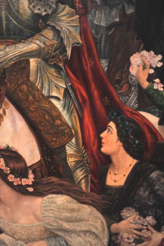 Original oil painting on canvas entitled “Return from the Crusade” signed lower right “A. Regli”. Measures approximately 53 ½” x 41 ½”. Alver Regli the artist was an Italian born artist with an intriguing story. As a young man he fled Verona, Italy after the murder of a fair lady of prominence under suspicious circumstances. A newspaper article contends this lady “Stella” was an obsession of Regli who painted a nude oil of her that was displayed at the Chicago World’s Fair in 1893. The painting was signed “Nani” but Regli claimed he was the artist. Stella sold for $100,000 to John T. Molligan an early collector at the turn of the century. Regli painted 3 copies from memory to prove the artwork was his. For practical reasons he declined to prove he was the artist although it would have made him world famous as this painting drew huge crowds in 1893. He was quoted as saying “I know it in my heart, it is enough.” Regli lived in Los Angeles for many years having a studio near second and Broadway in L.A. in the 1930s and ran an art school. He restored master works and in a 1930 L.A. Times article it reveals he was a student of Prof. Nani. Apparently Nani took credit for his work “Stella” which it is supposed Regli had Nani sell as his agent due to his being a fugitive from Italy. The photos and articles of happy Koomer, night club owner, and well known L.A. collector with this painting included. Also a copy of advertisement selling this painting along with Koomer’s collection Feb 13, 1973 by E.C. Jenkins. This painting fetched $5,000 43 years ago to a prominent Huntington Beach, CA collector and obtained from his estate. In conclusion we feel this to be a master work by a great artist who chose to “hide out” rather than gain recognition from painting “Stella”. The condition is near excellent in period (1930s) frame. Light damage to top of frame. Just light cleaning necessary. Note: This painting was sold to a Northwest coast dealer and was never shipped. The copies of articles and information are now missing. Est.: $2500-$5000