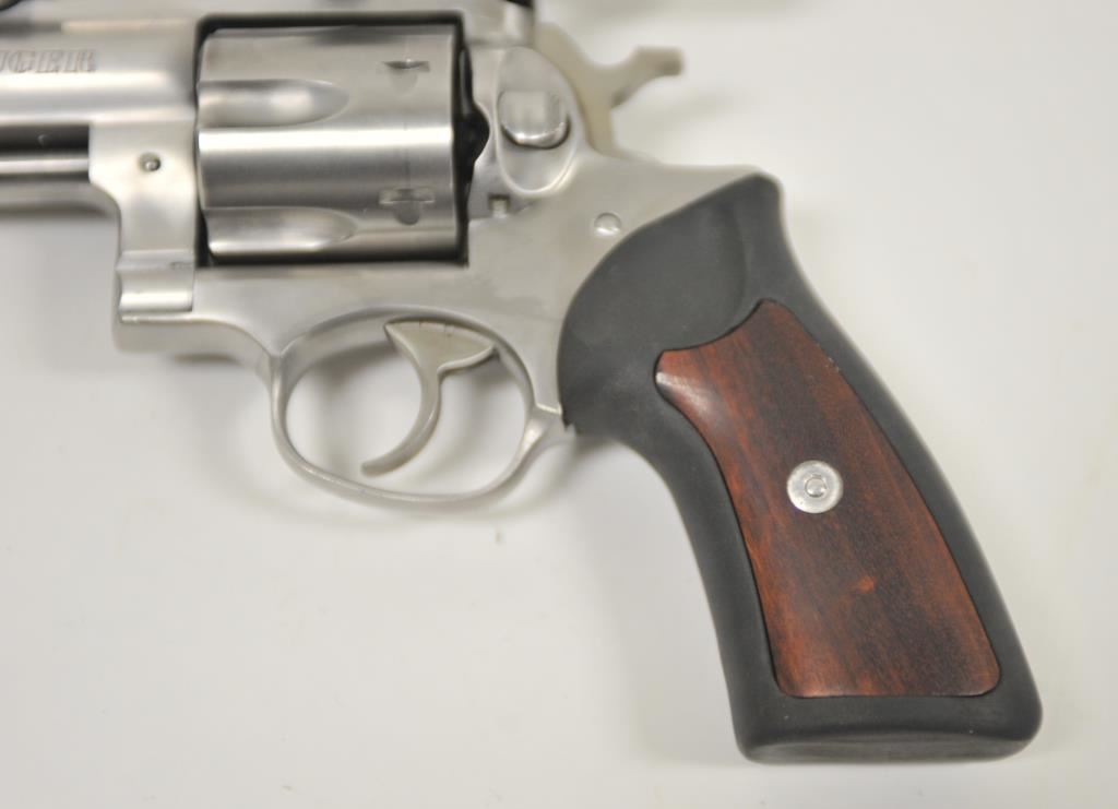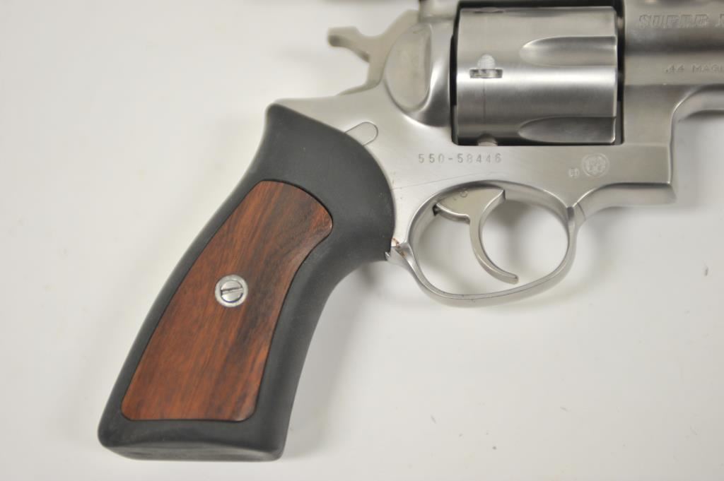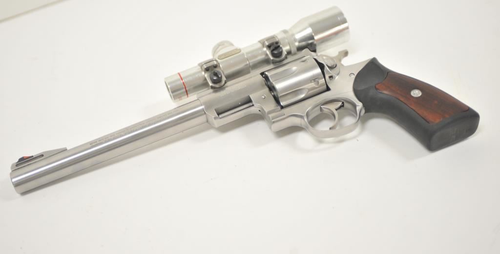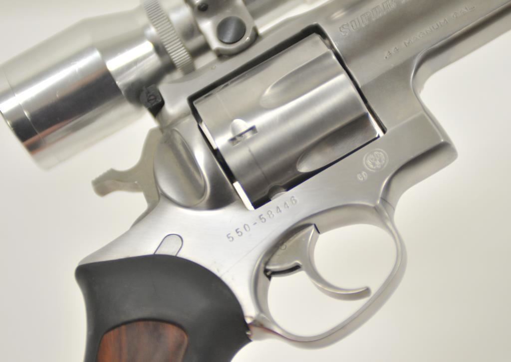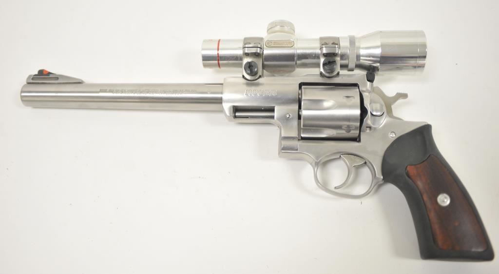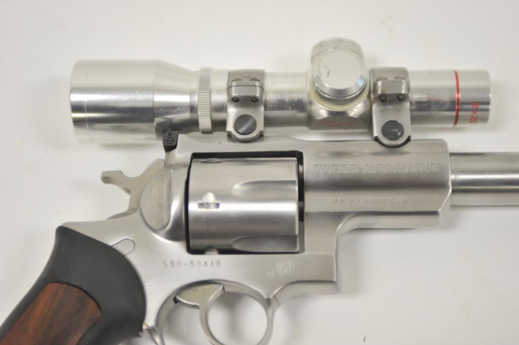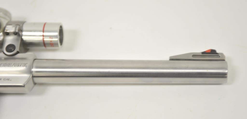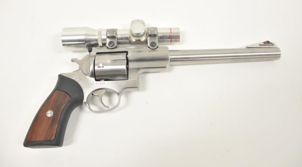 Ruger Redhawk .44 Magnum Double Action revolver with a 9 ½” barrel in stainless steel with Simmons pistol scope, S/N 550-58446. Fine to excellent used condition showing minor firing and some use. (Modern/PPT) Est.: $500-$1000