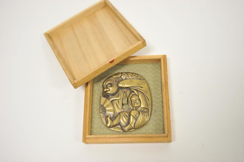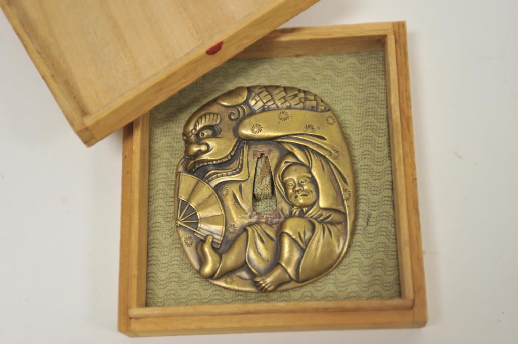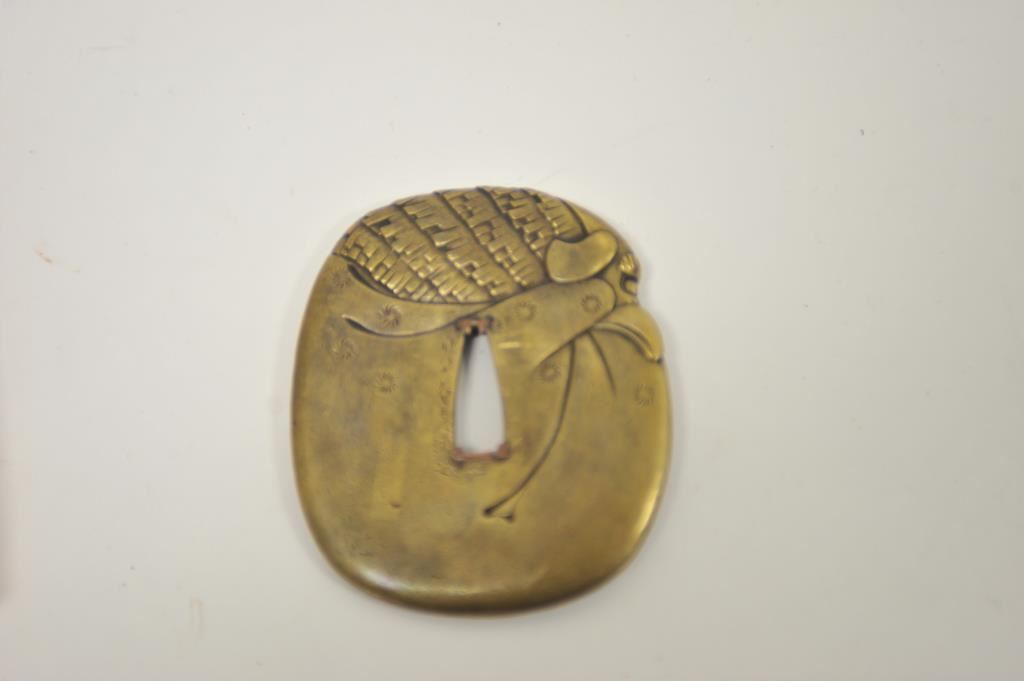 Heavy cast brass alloy tsuba (Japanese sword guard) for Wakasashi showing man with dragon and Phoenix on reverse (Signed). Good to very good condition. Copper pinning to fit blade in slot. Great detail. Measures 3 ¼” x 3” approximately. Est.: $400-$800
