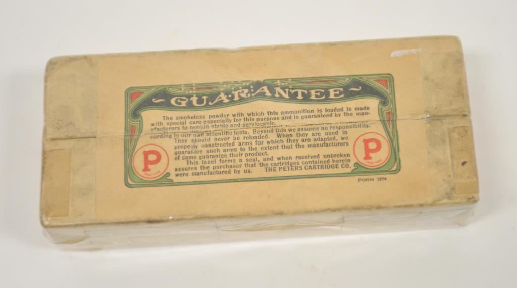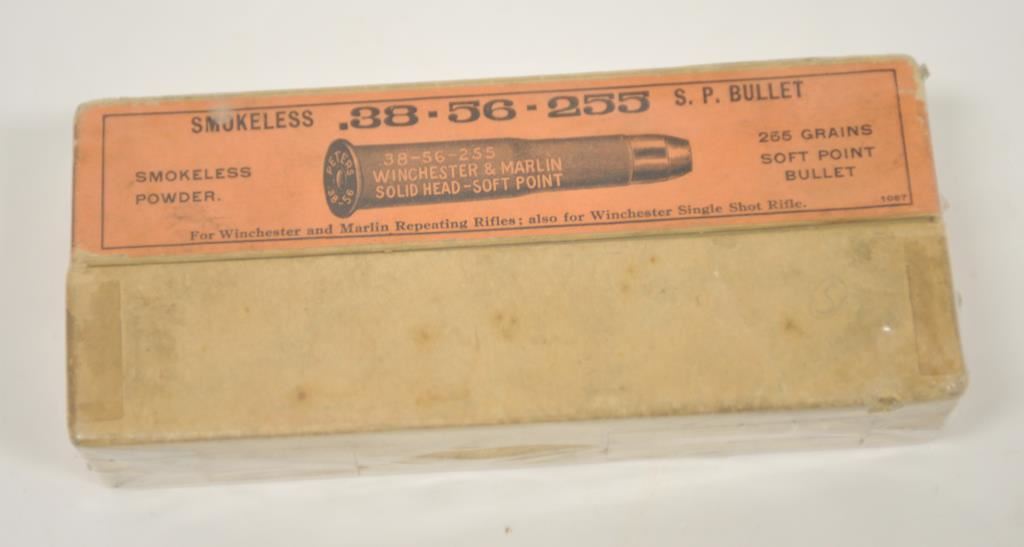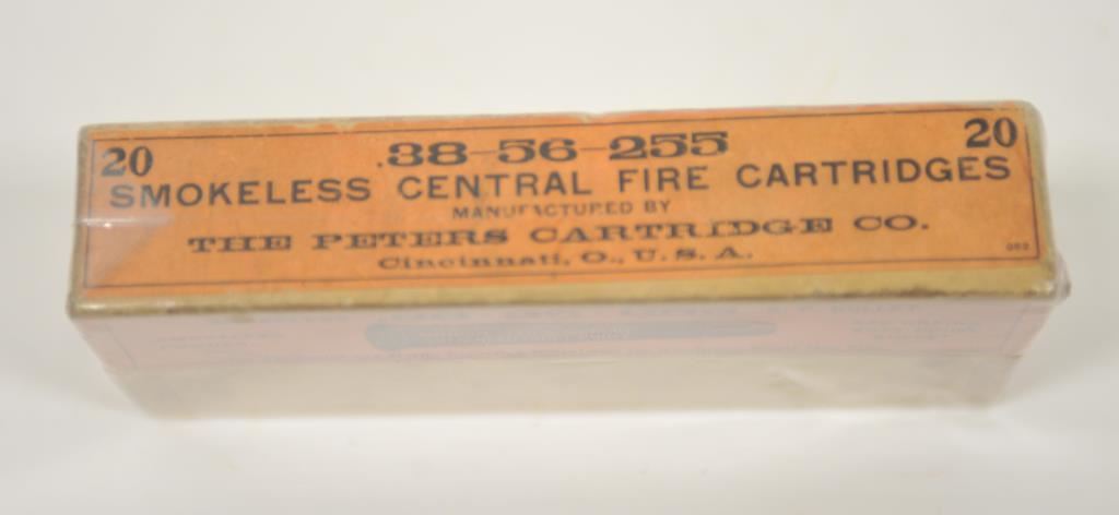 Full sealed box of .38-56-255 caliber cartridges by Peters Cartridge Co. marked for Winchester and Marlin with picture of cartridge (Also for Winchester single shot rifle). Full labels and near fine. 9.5 on a 1-10 grading scale. Est.: $300-$600