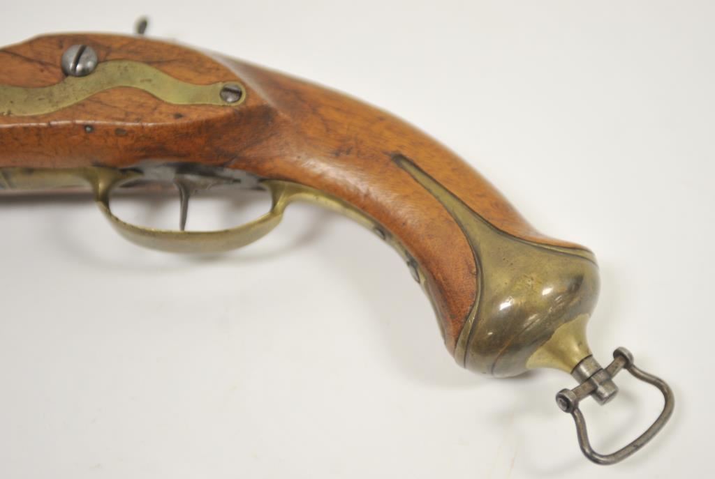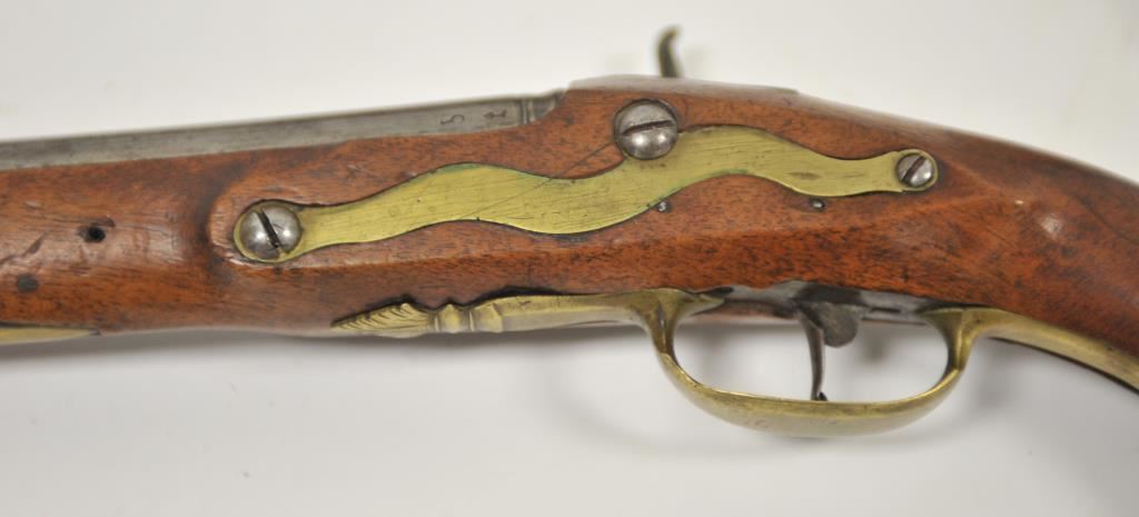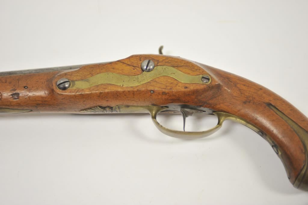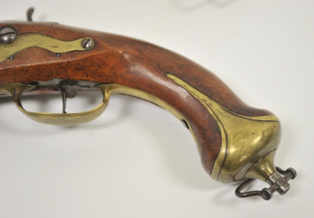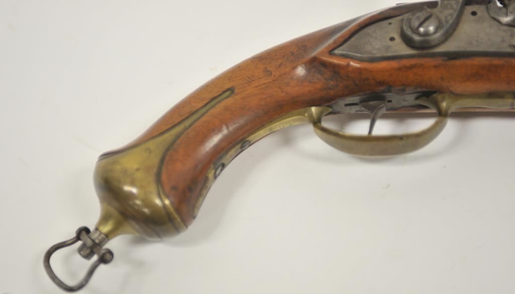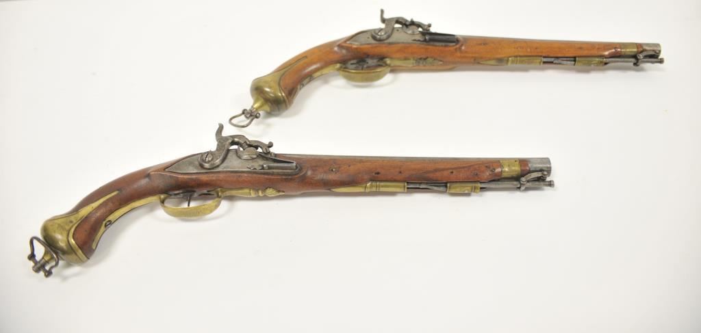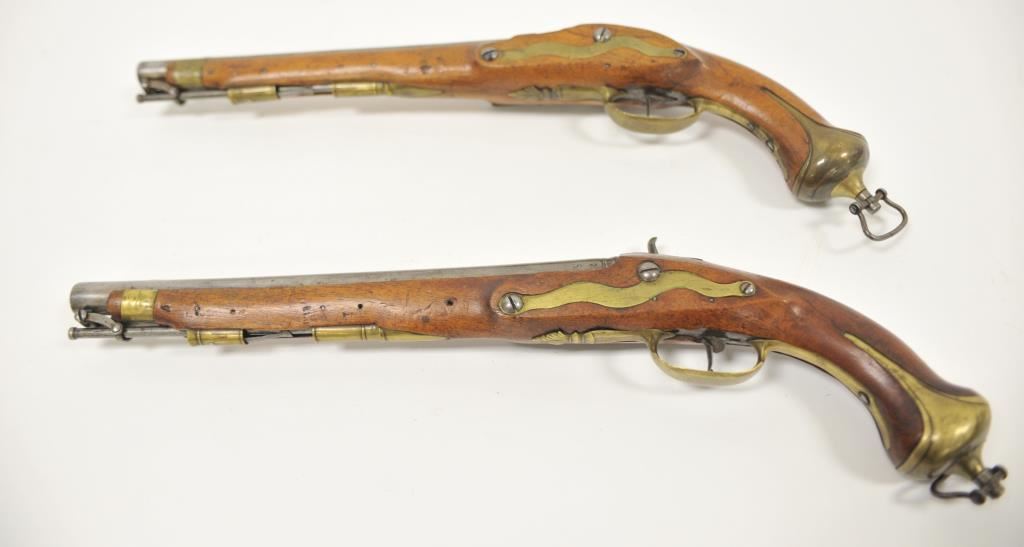 Pair of German 18th century flintlock Military issue horseman’s size pistols converted to percussion with contriner type nipple safety and swivel ramrod added. Brass mounts with large swivel in butt. Measures 21” overall with nearly a 13” barrel of approximately .67 caliber smoothbore. “V” and crown proof and breech and tang. Markings removed from lock plate when converted (Originally marked “F” with Roman numerals). The hammer also engraved at the time of conversion. Very good plus condition with crisp wood showing just minor aging and slight imperfections. (Antique) Est.: $2000-4000