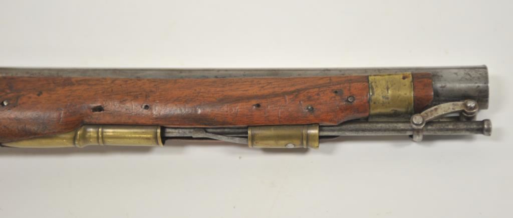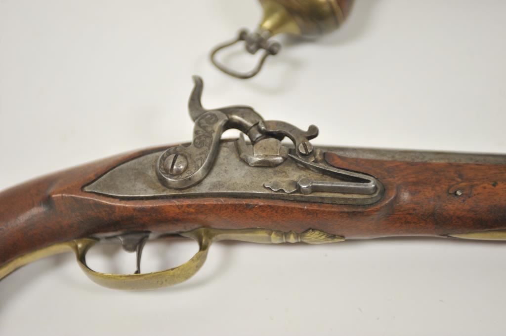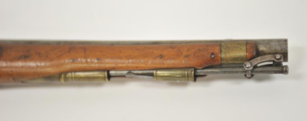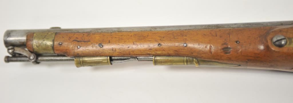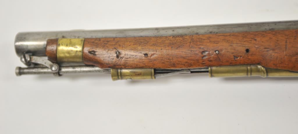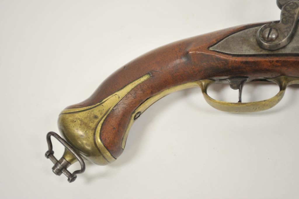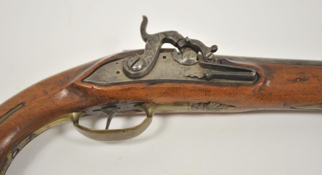 Pair of German 18th century flintlock Military issue horseman’s size pistols converted to percussion with contriner type nipple safety and swivel ramrod added. Brass mounts with large swivel in butt. Measures 21” overall with nearly a 13” barrel of approximately .67 caliber smoothbore. “V” and crown proof and breech and tang. Markings removed from lock plate when converted (Originally marked “F” with Roman numerals). The hammer also engraved at the time of conversion. Very good plus condition with crisp wood showing just minor aging and slight imperfections. (Antique) Est.: $2000-4000