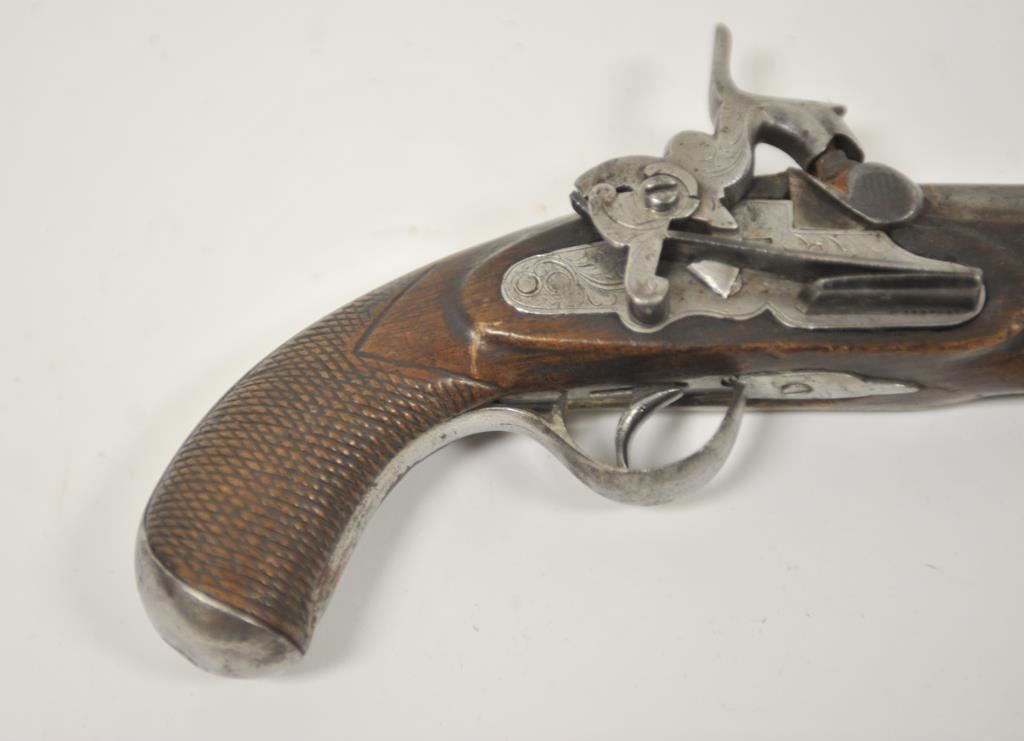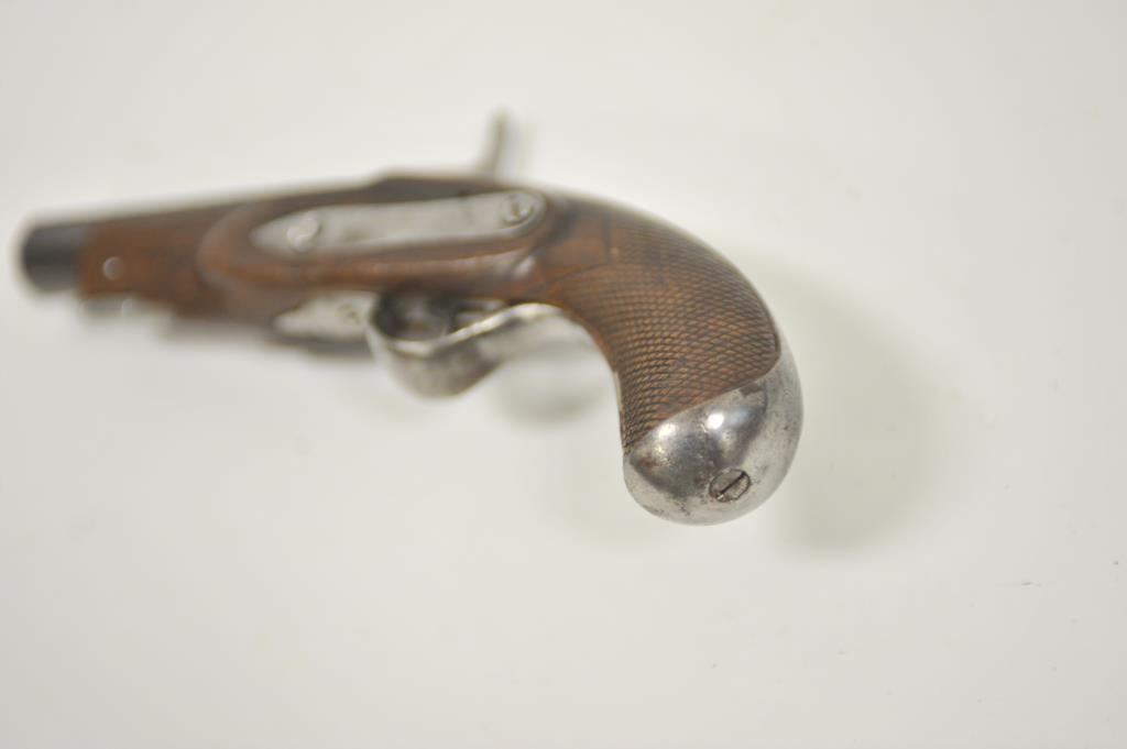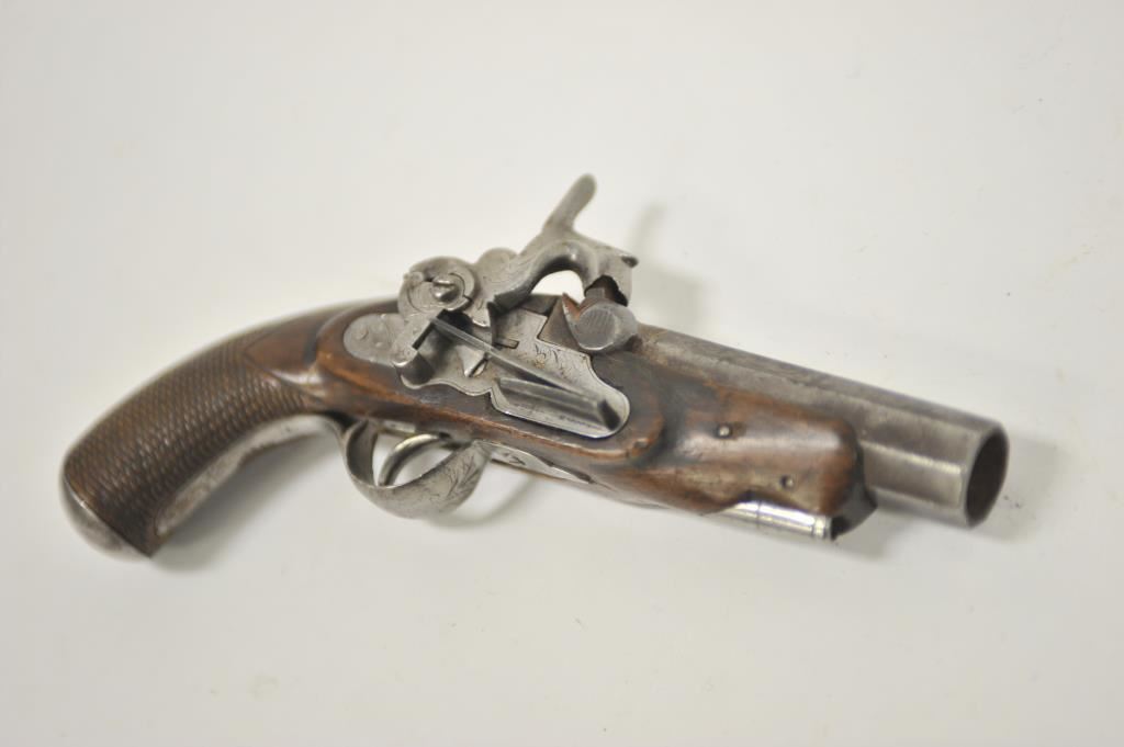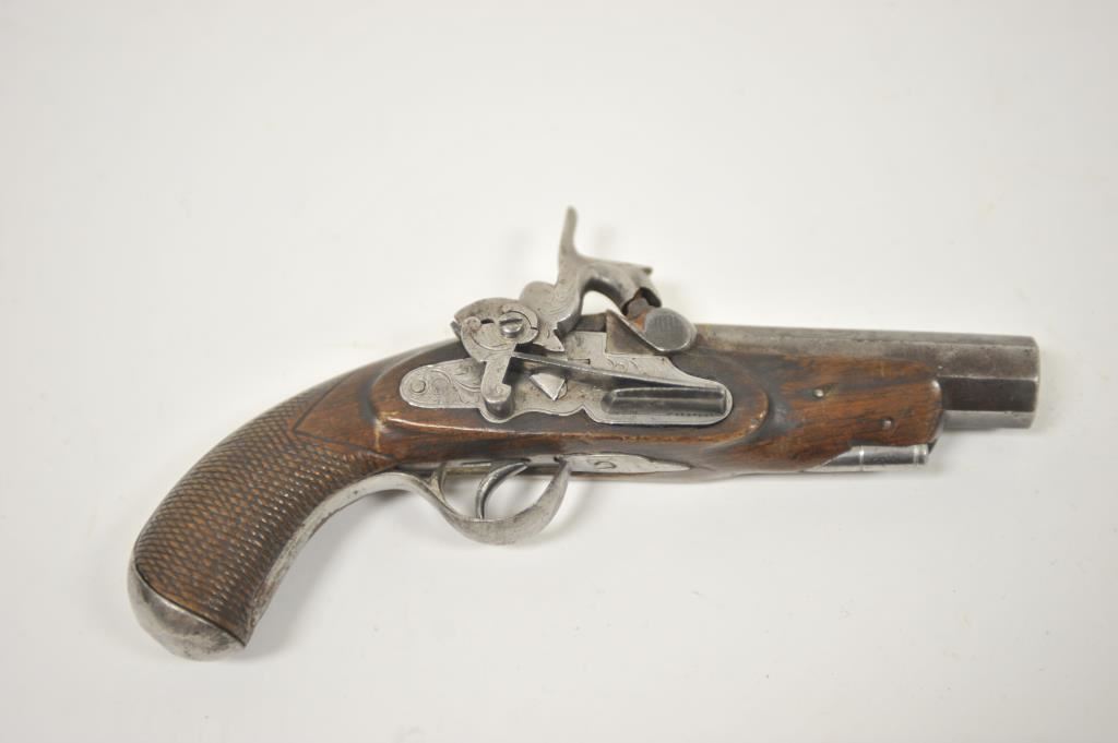 Miquelet percussion pocket size pistol with octagonbarrel and checkered stock. No proofs or markings circa Mid-19th century. Measures 9” overall with a 4 1/8” barrel of .69 caliber smoothbore. Missing ramrod. Working action. Some light cleaning but good overall. (Antique) Est.: $300-$600