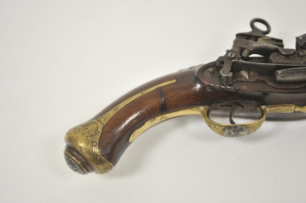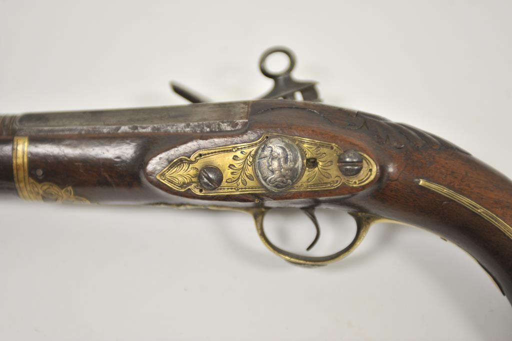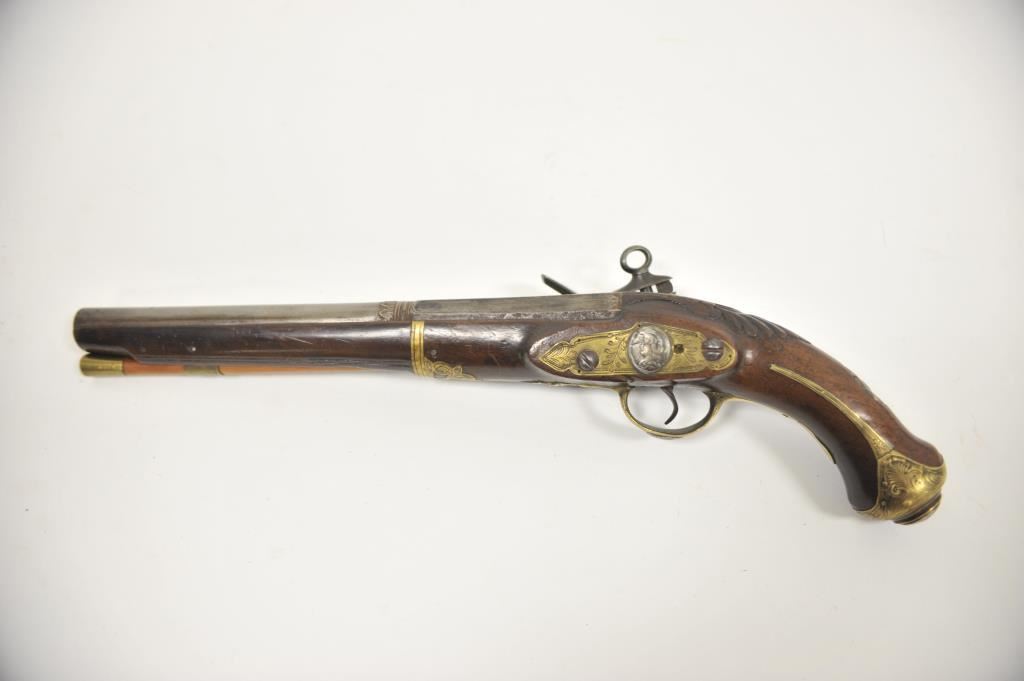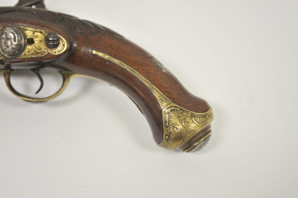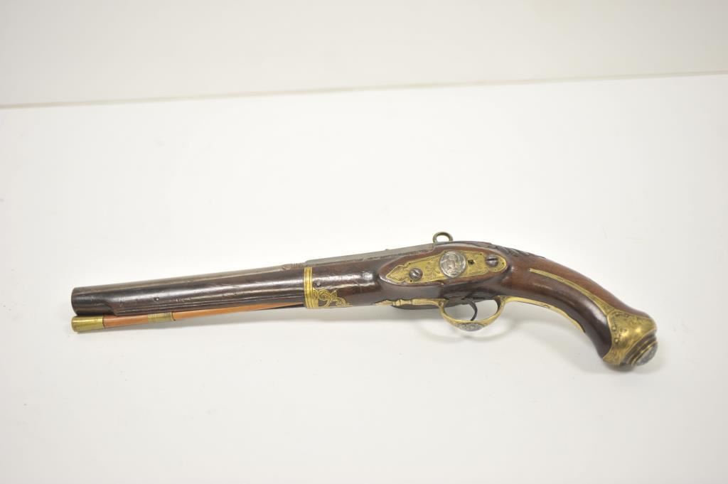 Miquelet flintlock holster size pistol marked “Iorrento” on the lock. Measures 17 ¼” overall and .69 caliber smoothbore. Engraved brass with pewter overlays of bust and faces. Metal is very good with minor restorations and cleaning. The fore end and stock has excellent restorations that are almost imperceptible. The ramrod is a correct style replacement. Generally good to very good overall with some wear to pewter inlays and the mentioned museum quality restoration. Circa 1780-1820 approximately. (Antique) Est.: $750-$1500