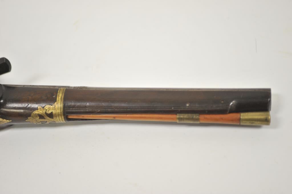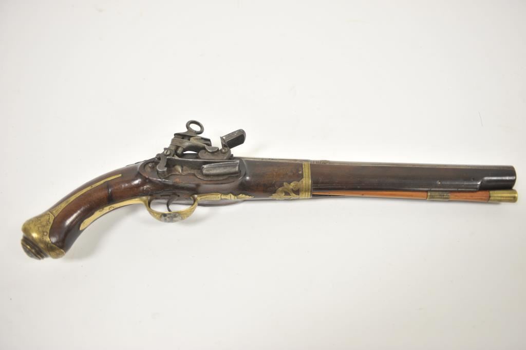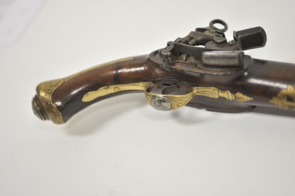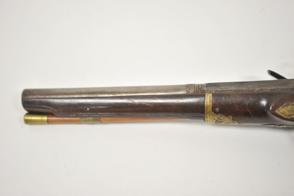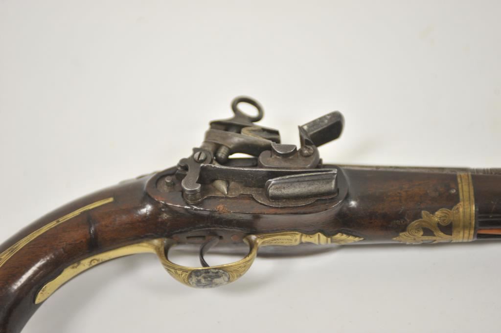 Miquelet flintlock holster size pistol marked “Iorrento” on the lock. Measures 17 ¼” overall and .69 caliber smoothbore. Engraved brass with pewter overlays of bust and faces. Metal is very good with minor restorations and cleaning. The fore end and stock has excellent restorations that are almost imperceptible. The ramrod is a correct style replacement. Generally good to very good overall with some wear to pewter inlays and the mentioned museum quality restoration. Circa 1780-1820 approximately. (Antique) Est.: $750-$1500