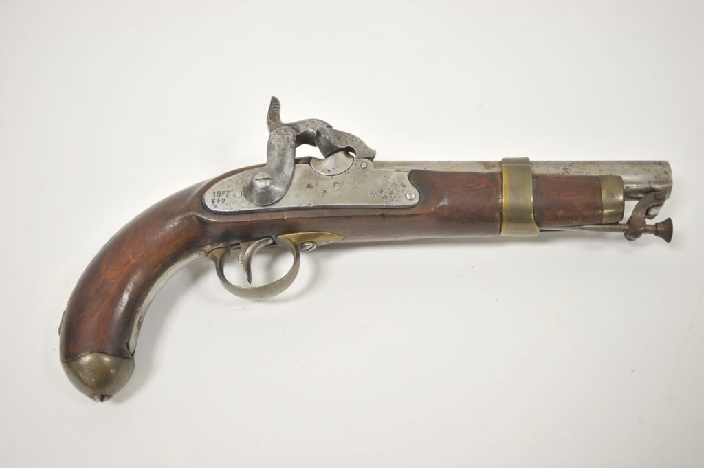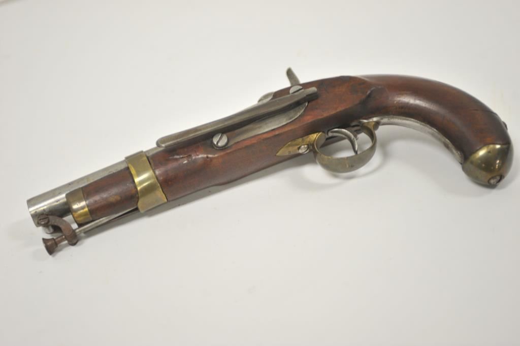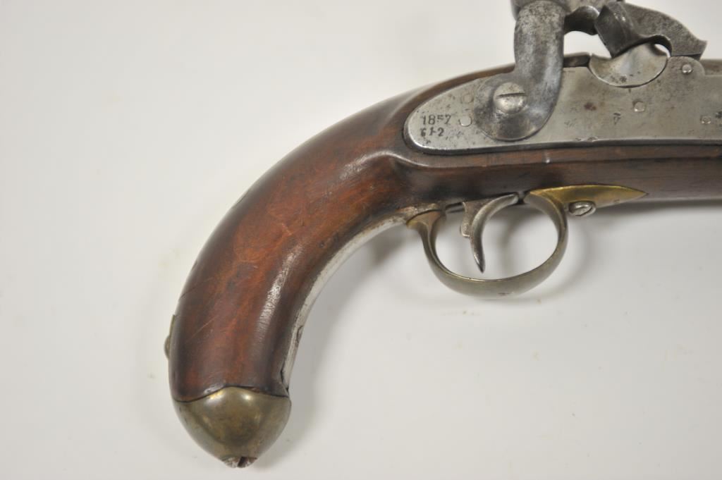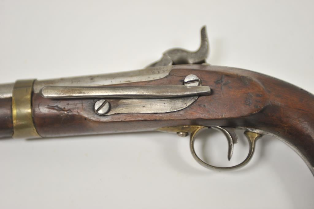 1857 dated percussion military issue pistol marked “M. Arana” at the front edge lock probably Spain or Portugal issue. Brass mounted with swivel ramrod and nipple safety. The barrel measures 7 ¾” in .69-70 caliber smoothbore. Lightly cleaned in very good condition retaining belt hook. Works well. The barrel is also dated 1857. We could find no reference other that the fact we sold similar specimen to Eric Vaule noted European and expert 30 years ago that he identified as Portuguese. (Antique) Est.: $500-$1000
