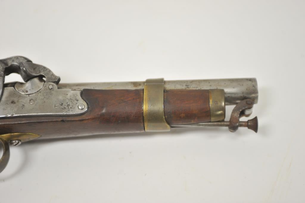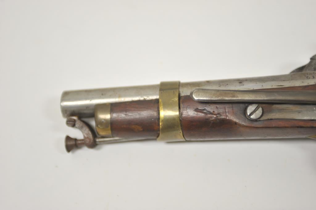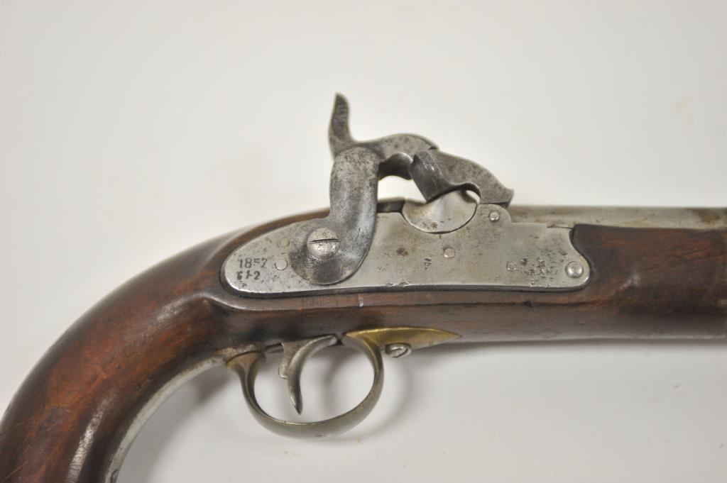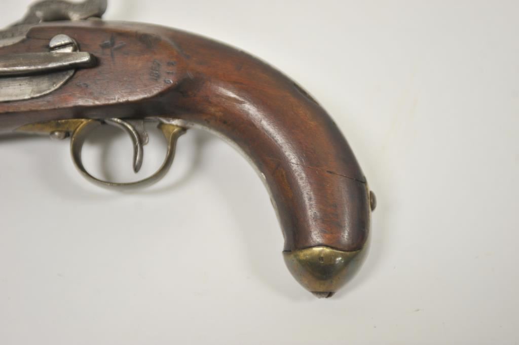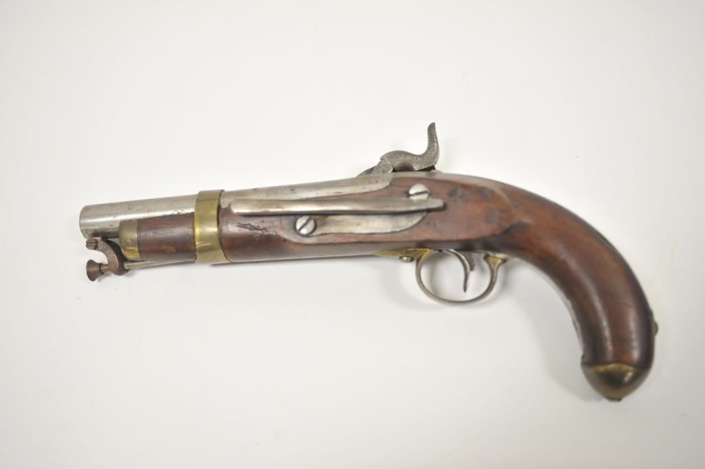 1857 dated percussion military issue pistol marked “M. Arana” at the front edge lock probably Spain or Portugal issue. Brass mounted with swivel ramrod and nipple safety. The barrel measures 7 ¾” in .69-70 caliber smoothbore. Lightly cleaned in very good condition retaining belt hook. Works well. The barrel is also dated 1857. We could find no reference other that the fact we sold similar specimen to Eric Vaule noted European and expert 30 years ago that he identified as Portuguese. (Antique) Est.: $500-$1000