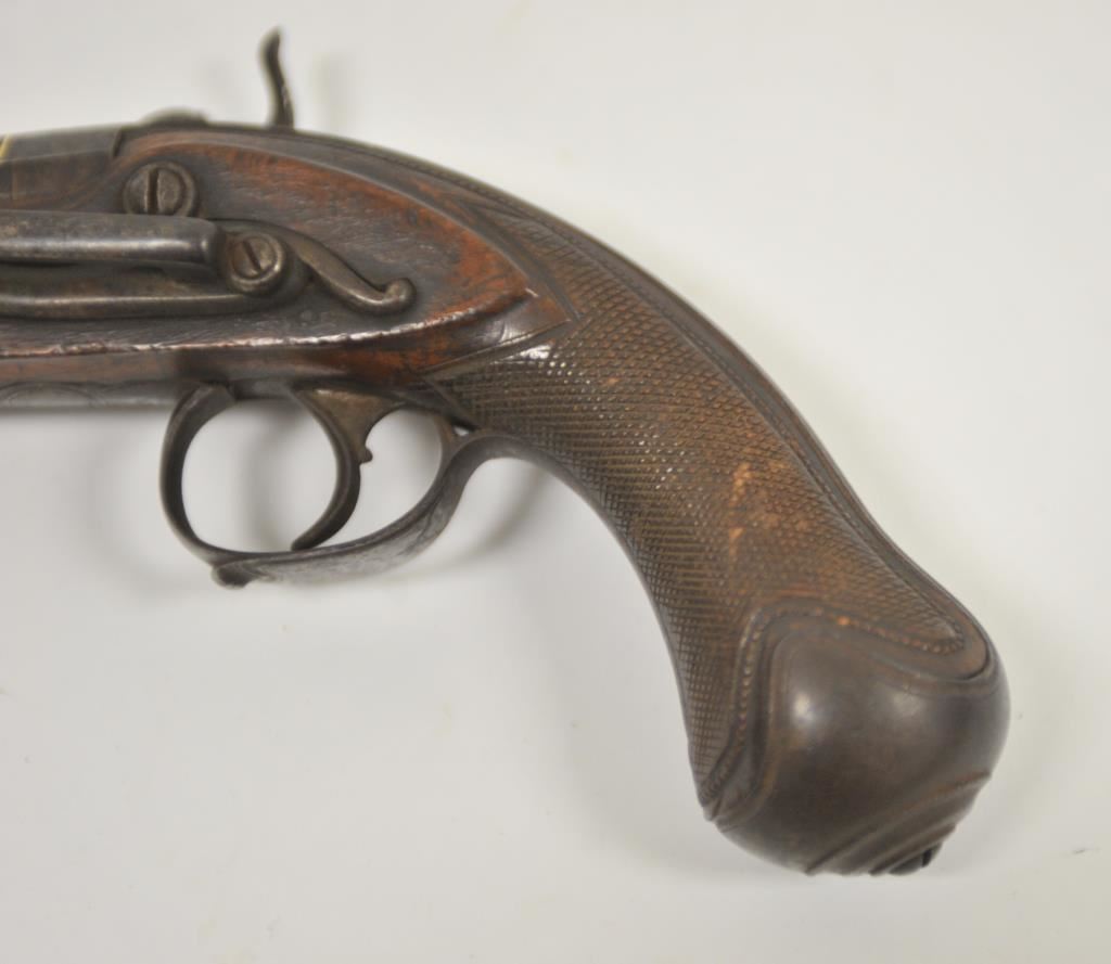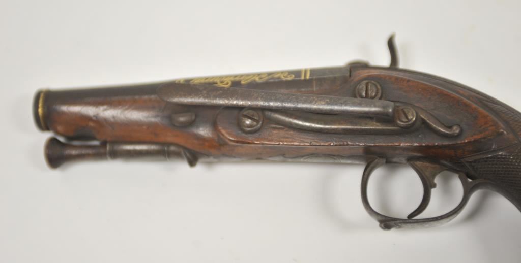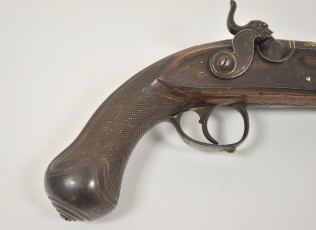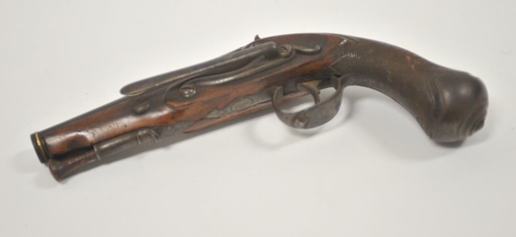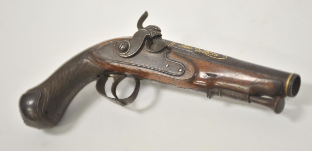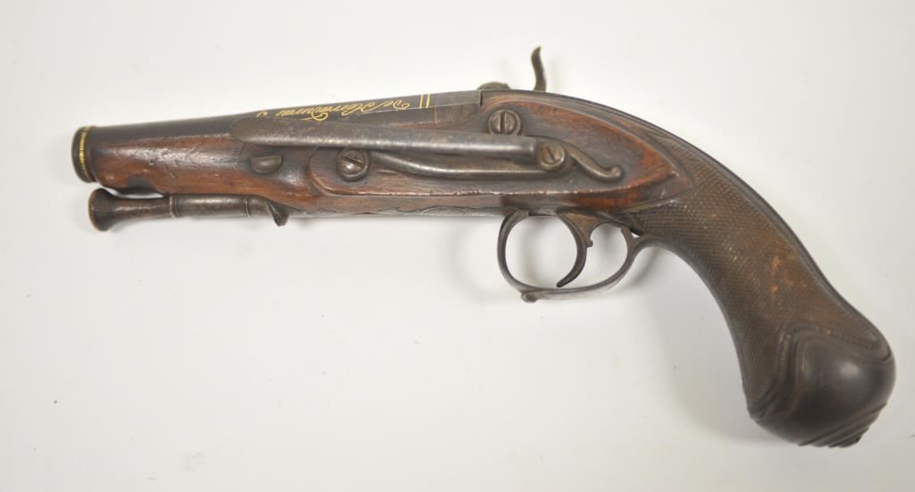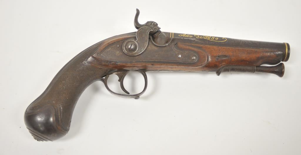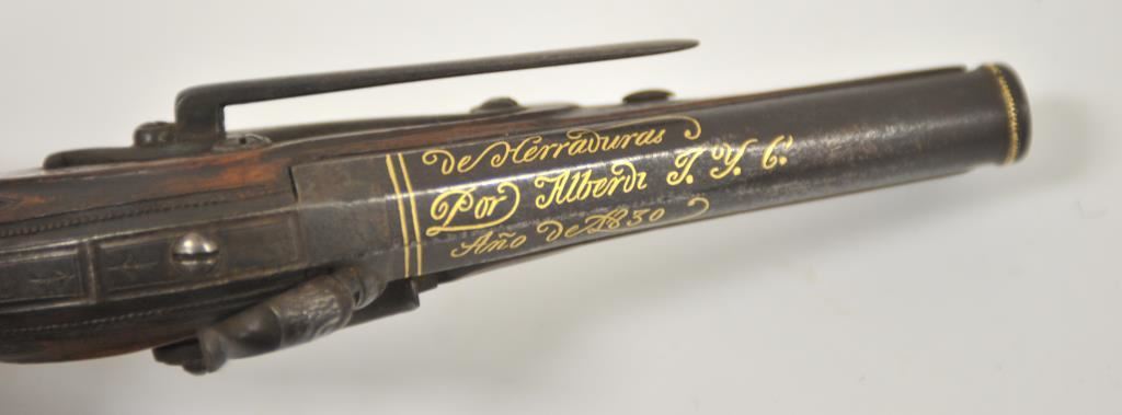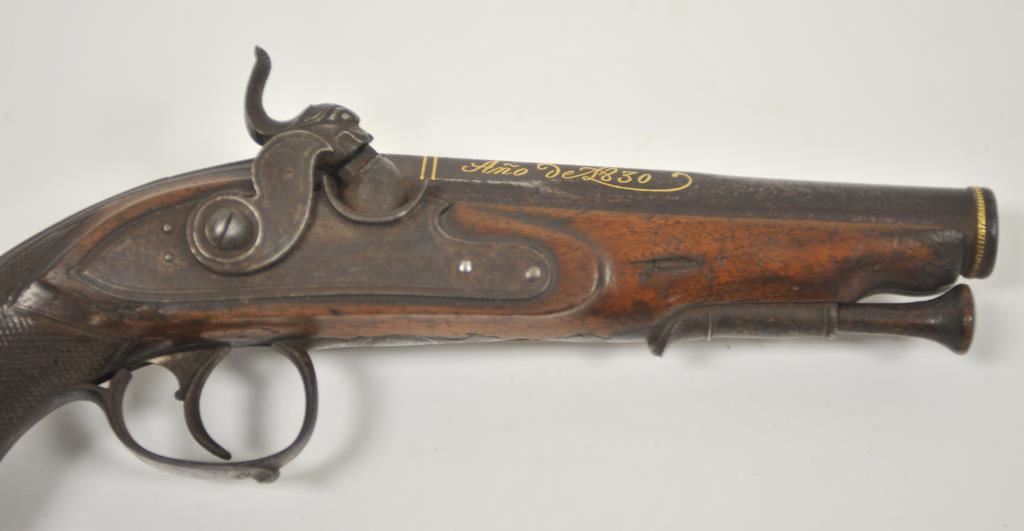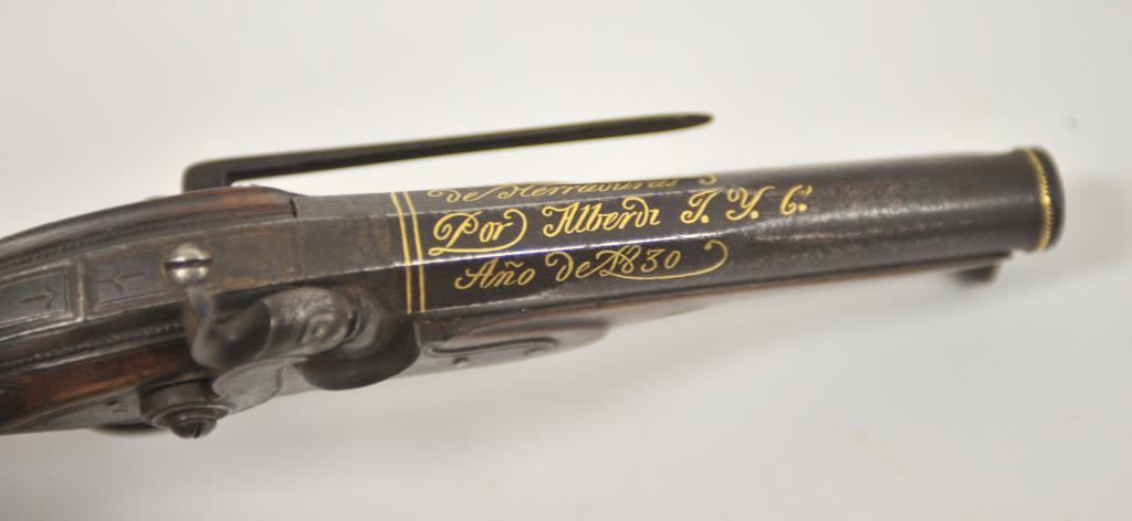 Excellent quality Spanish percussion belt pistol with gold inlaid barrel in fancy script, “De Herra Duras (Made of Horseshoe), for Alberdi J.Y.C., Ano (Year) 1830”. 2 gold lines at the breech and braided ring at the muzzle. Chiseled lion on the hammer face. Measures 10 3/8” overall with a 4 ½” barrel in .62 caliber smoothbore. Brown patina finish that is uncleaned and ‘As Found” out of the attic condition. The stock is very good plus with good checkering, minor bumps, and aging. Original belt hook and ramrod. Made during period that California was still under Spanish rule as a good deal of Southern U.S. (Antique) Est.: $900-$1800