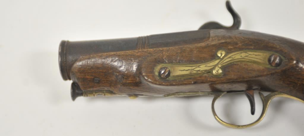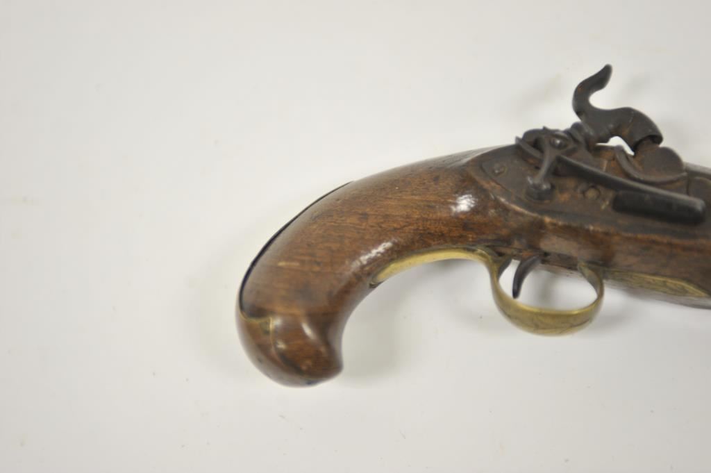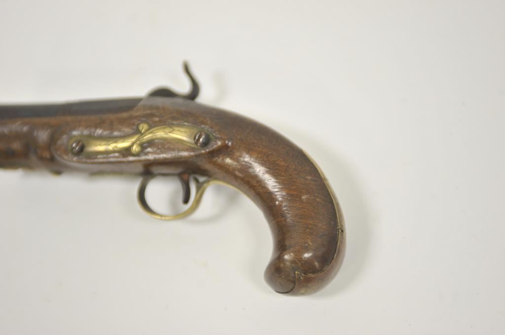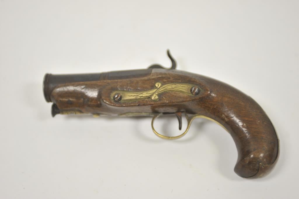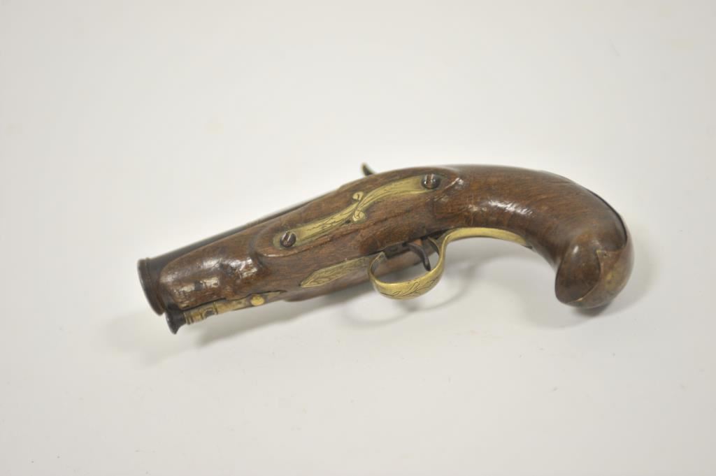 Miquelet percussion pocket pistol with large bore cannon barrel. Measures 7 ½” overall with a 3 ¼” barrel of .75 caliber smoothbore. Brass mounts in continental rather than Spanish style. Dark patina finish with minor erosion and pinprick pitting. Not holding on full cock but working. Good wood and generally good overall. Made from Spain through Italy into Mediterranean in this style during early 19th century. No absolute identifying characteristics. 50/50 chance on whether Spanish or Italian. (Antique) Est.: $300-$600