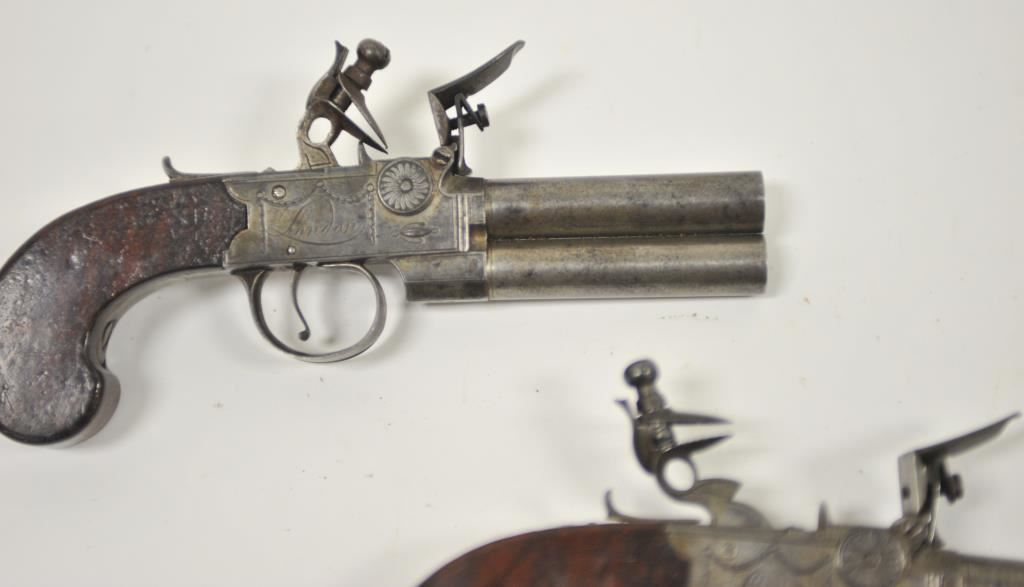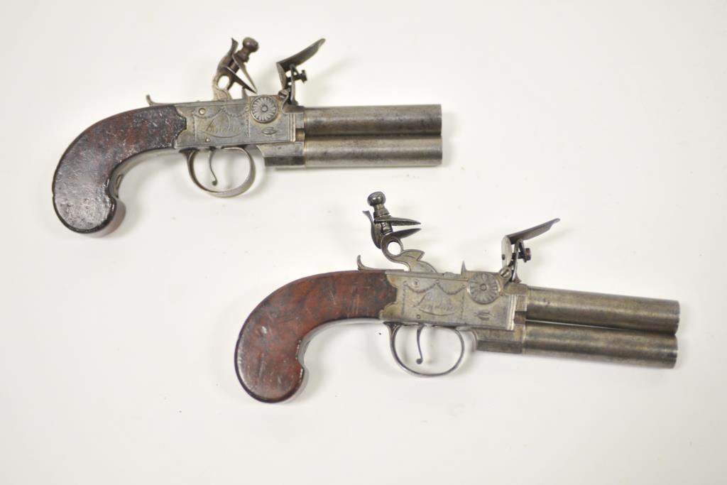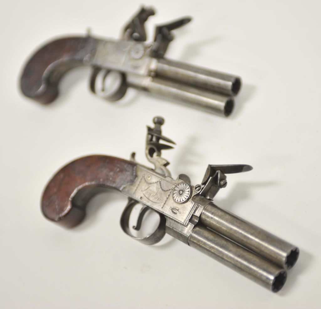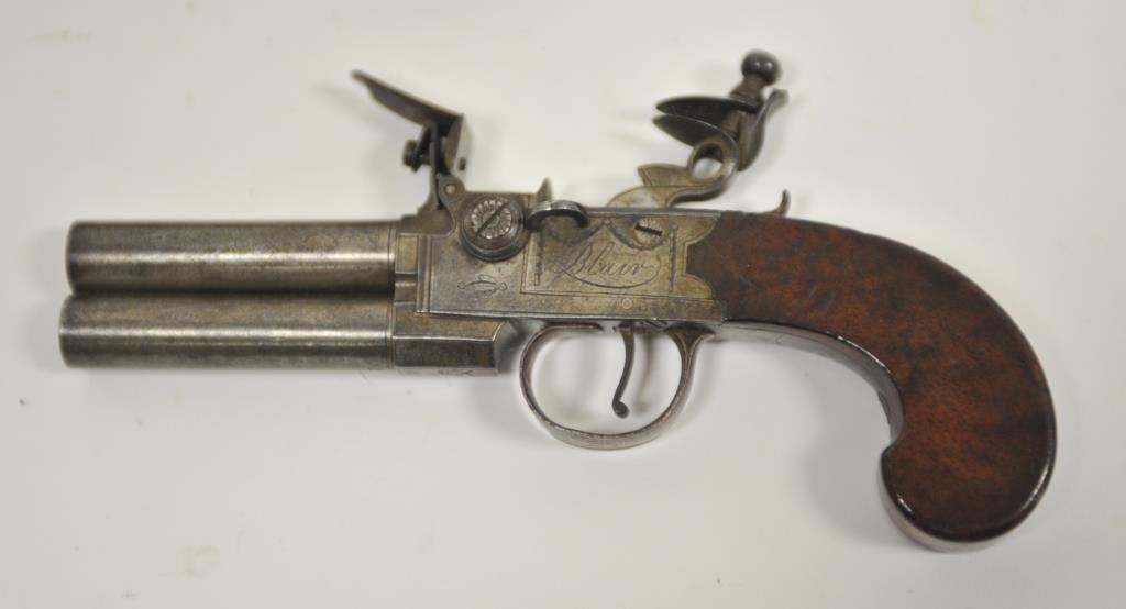 Pair of tap action 2 shot O/U flintlock pistols signed “Blair, London”. Circa about 1790-1820. Nearly 7” overall with approximately 2 ½” barrels of approximately .40 caliber false rifled. Bag shaped grips and lightly engraved frames. Very good condition with light gray to light brown patina finish with crisp metal services and well defined markings and edges. Original flintlock parts. Very good plus wood stock with very minor scratches and bumps. Working action and revolving “Tap” that activates bottom barrel. (Antique) Est.: $1000-$2000