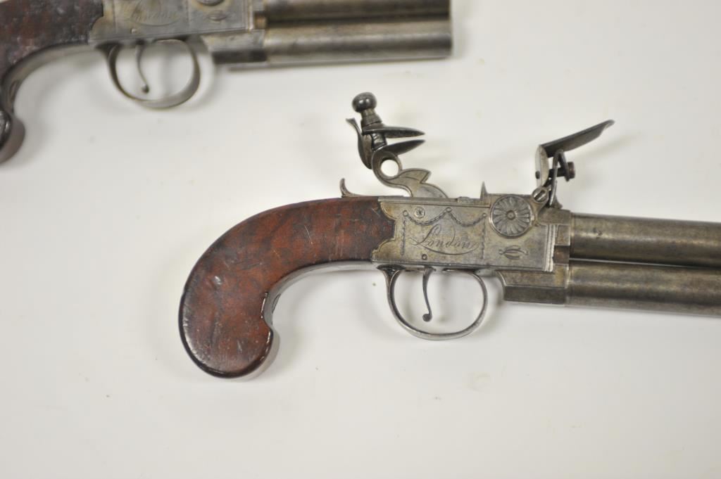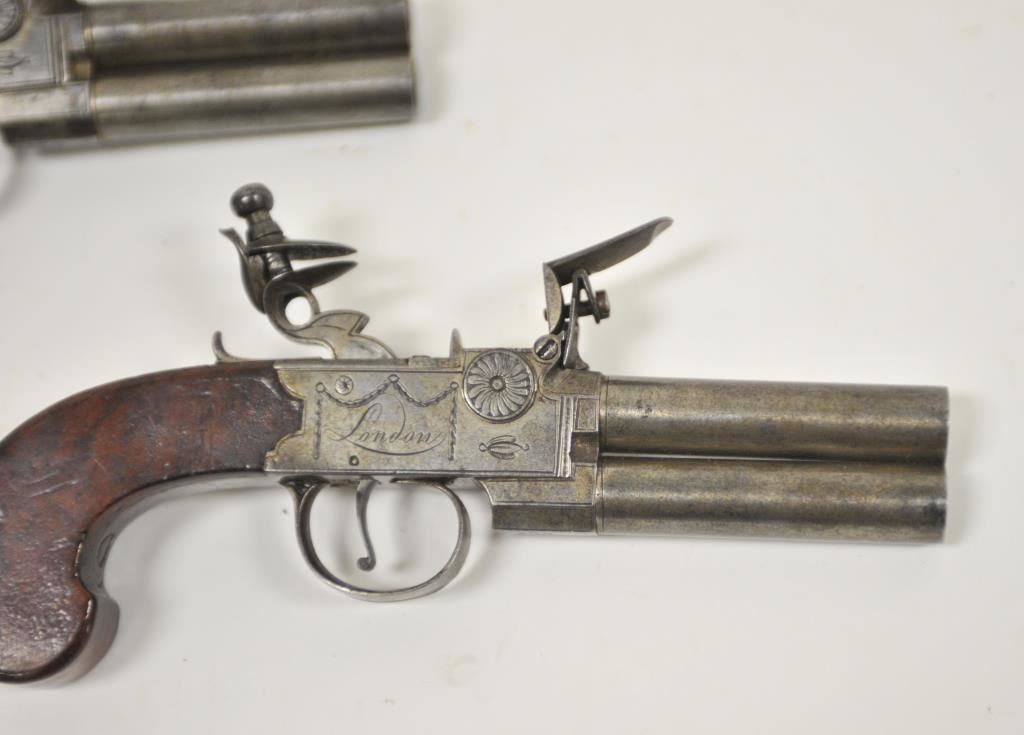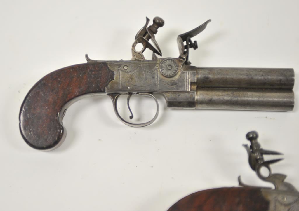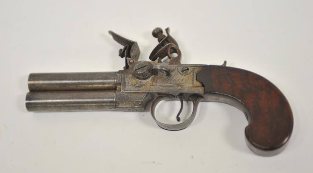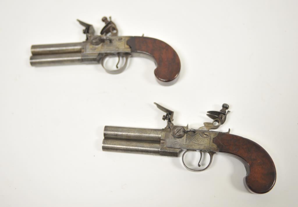 Pair of tap action 2 shot O/U flintlock pistols signed “Blair, London”. Circa about 1790-1820. Nearly 7” overall with approximately 2 ½” barrels of approximately .40 caliber false rifled. Bag shaped grips and lightly engraved frames. Very good condition with light gray to light brown patina finish with crisp metal services and well defined markings and edges. Original flintlock parts. Very good plus wood stock with very minor scratches and bumps. Working action and revolving “Tap” that activates bottom barrel. (Antique) Est.: $1000-$2000