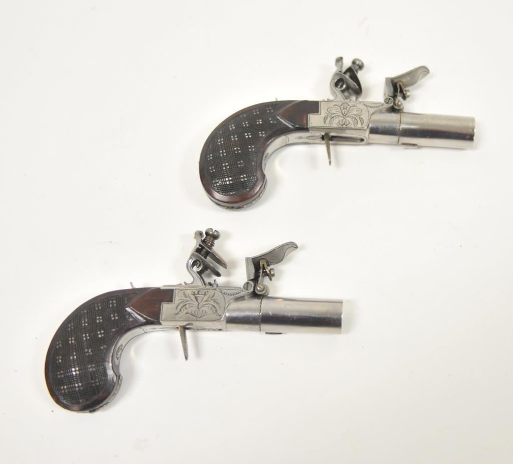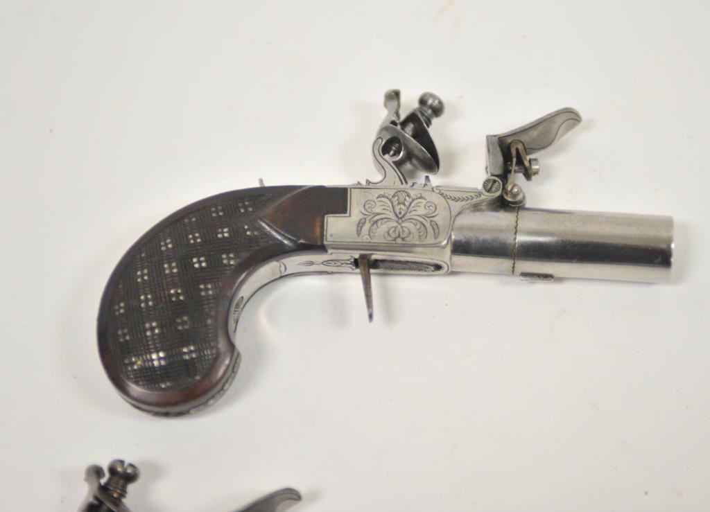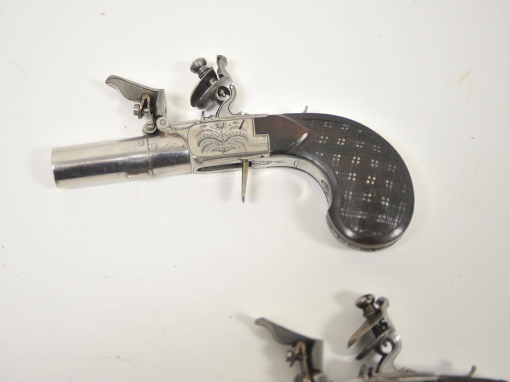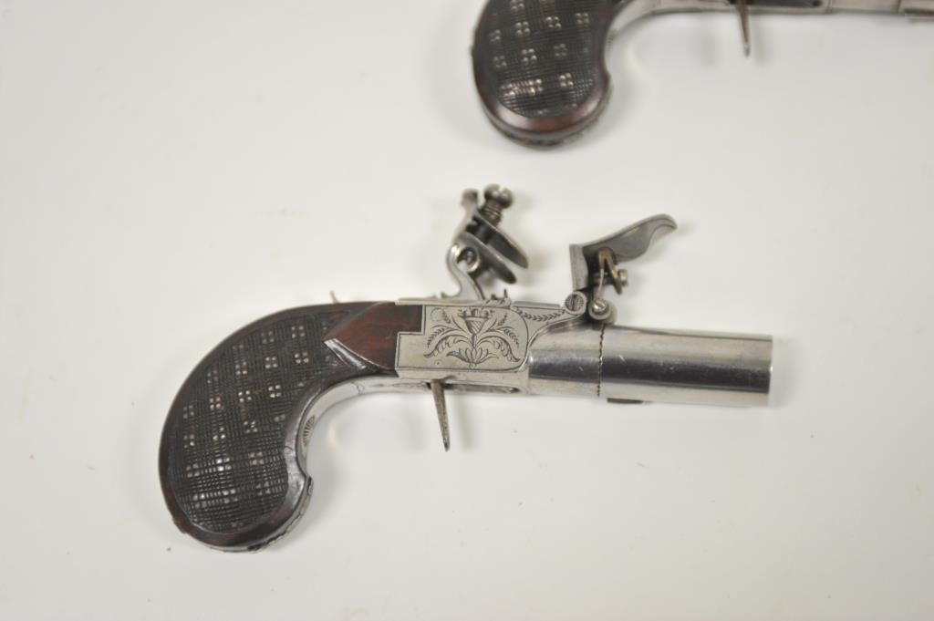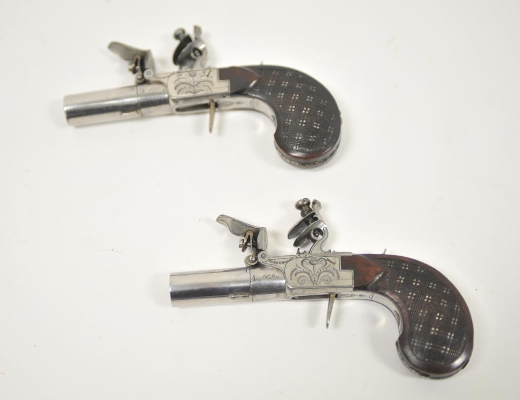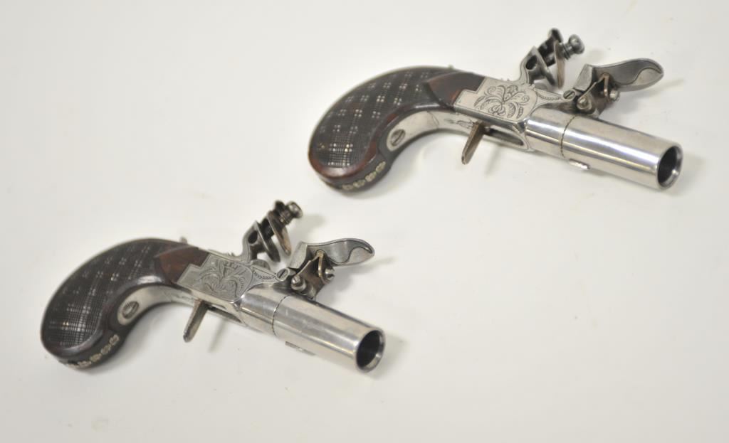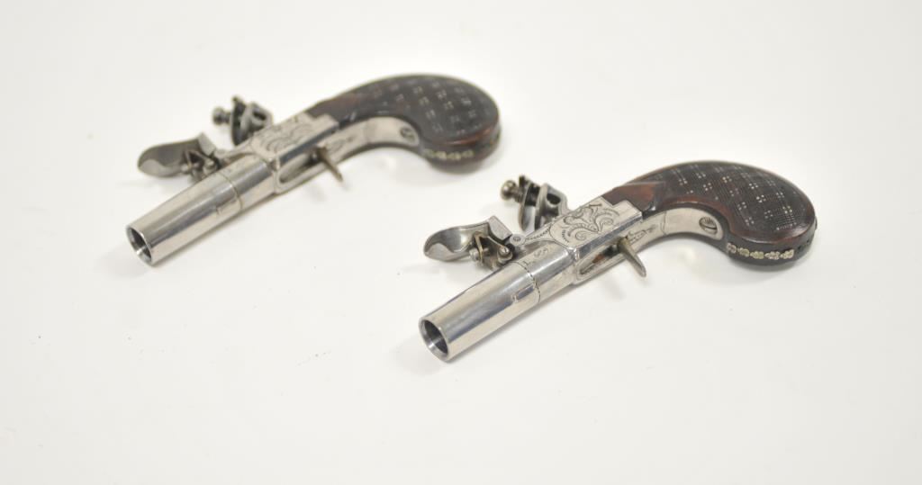 Classic pair of French style flintlock Pocket pistols of Napoleonic era 1800-1815. Measures 6” overall with 1 5/8” barrel of .52 caliber smoothbore and ‘ELG” (Belgium) proof. Original bright polished finish with sharp engraving and correct flintlock parts. Checkered and pinned grips with silver floral overlay down backstrap (70% intact with 30% lost). The action is crisp. #1 and #2 are both very good plus to almost fine condition for their age and beautiful empire styling. (Antique) Est.: $1000-$2000