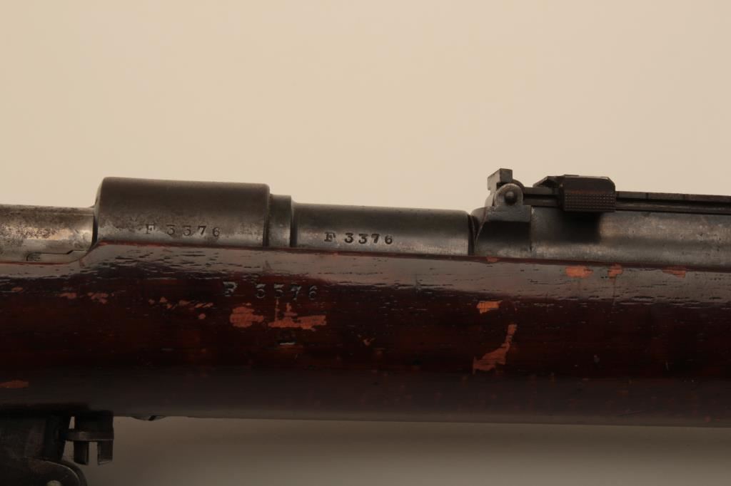 Argentine Model 1891 by Loewe of Berlin in 7.5 caliber, S/N F3376. The barrel measures 23” with stock reduced and fore arm removed. Crest grounded and refinished by “El Crappe” the unknown gunsmith. Bore is very dark. Working condition. Est.: $50-$100