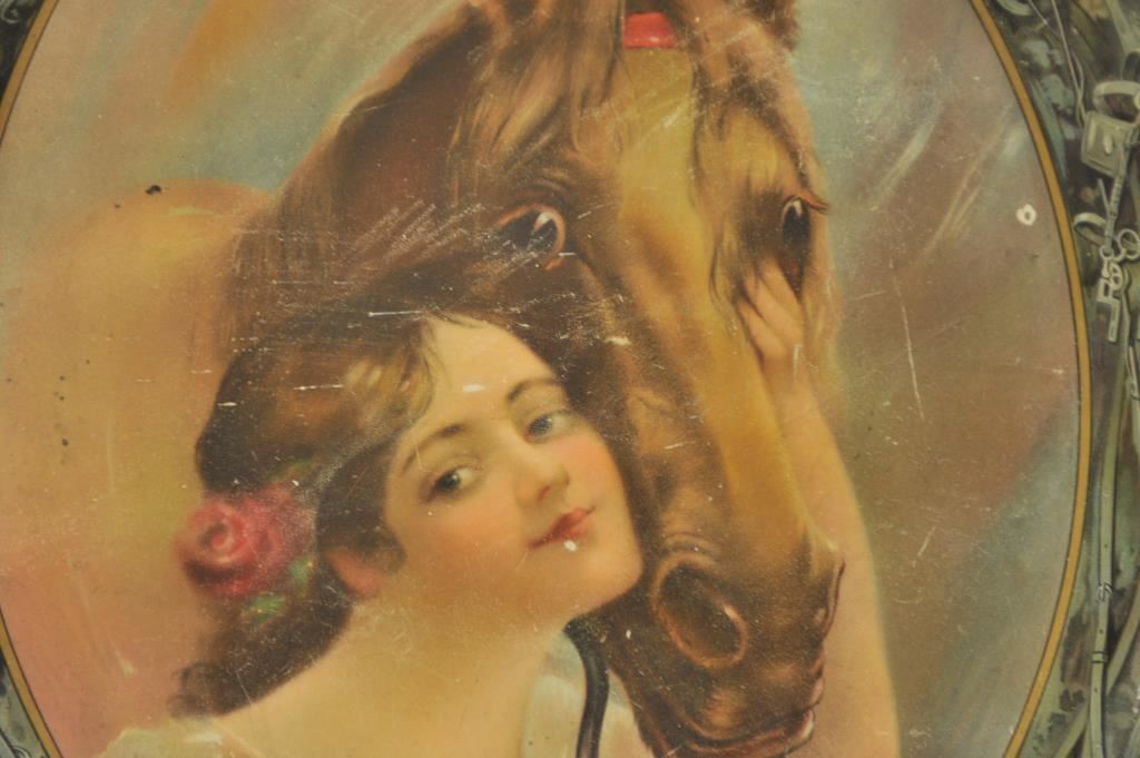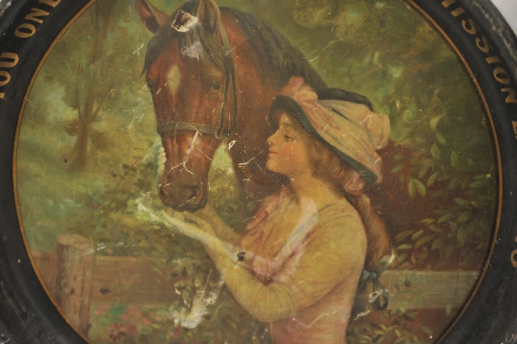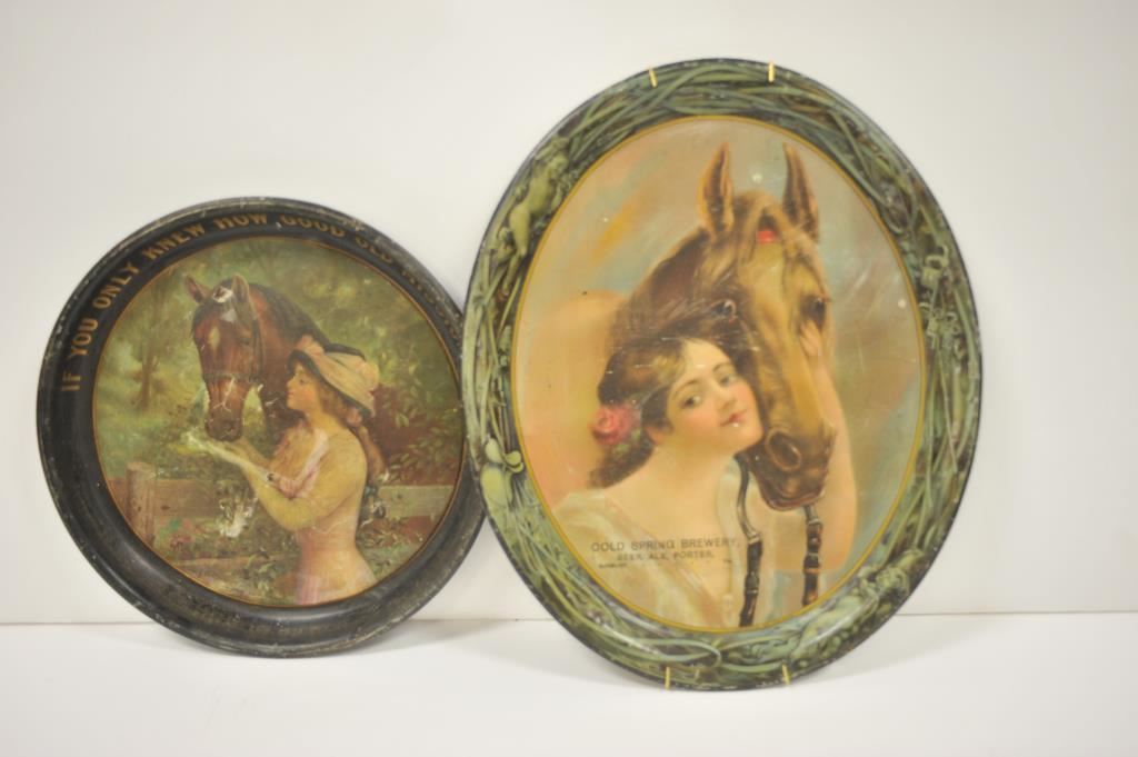 2 beer advertising trays, Cold Spring Brewery, PA and Mission Lager "In Old Kentucky" showing ladies with horses, fair to good. Est. $150-300