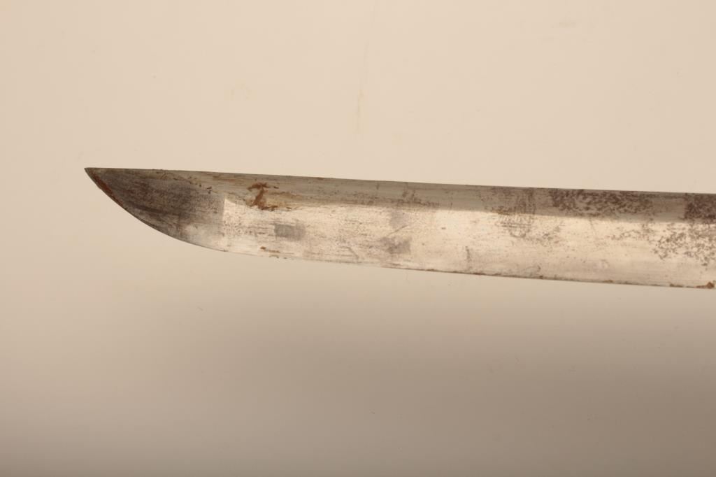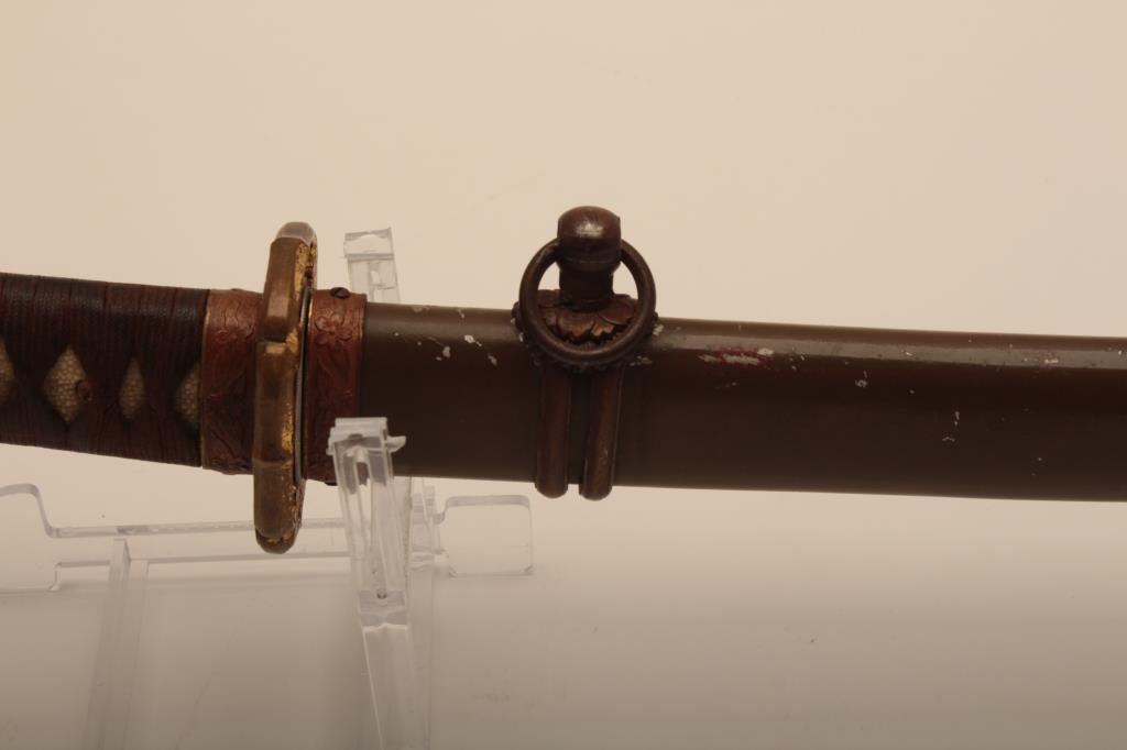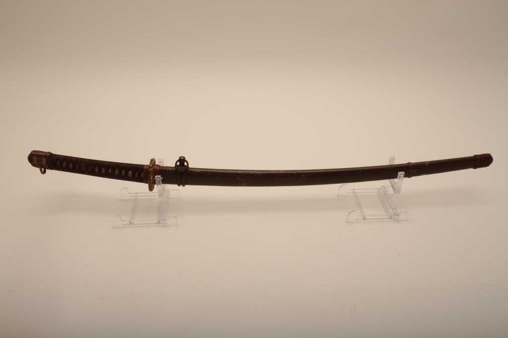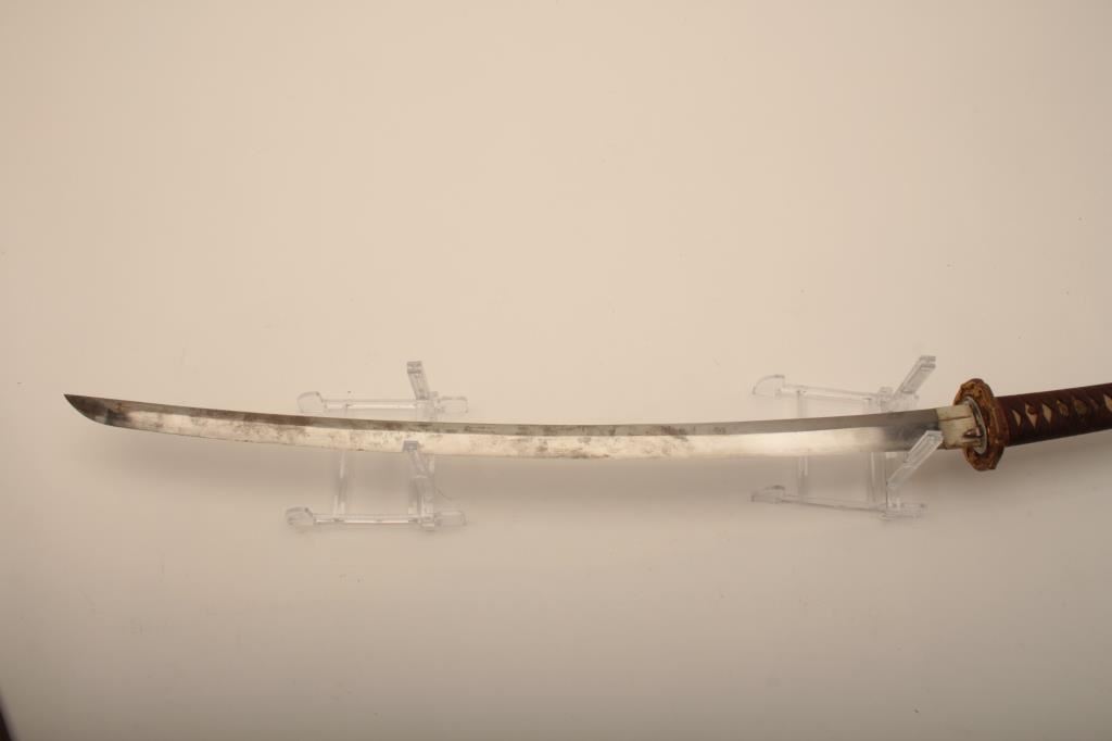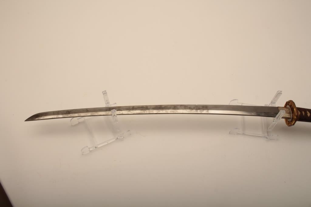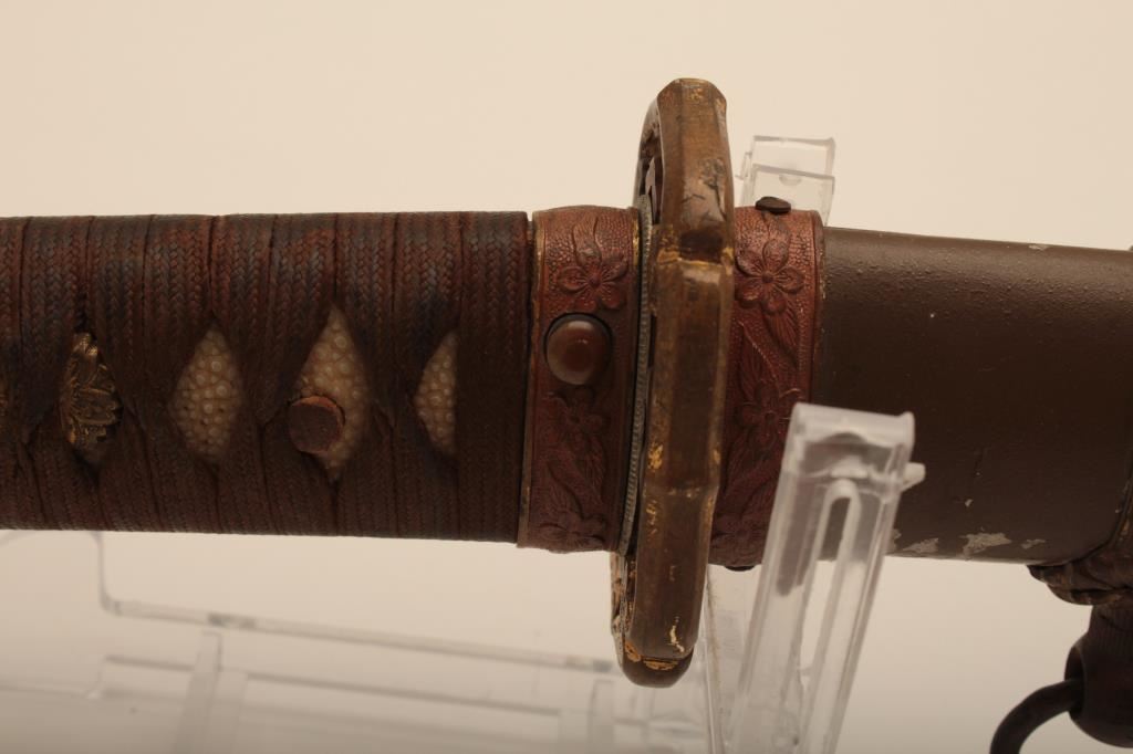 Samurai sword with WWII issue mounts, battle nicks in edge, fair to good. From Circle in Orange antique dealer's estate. Est. $350-700