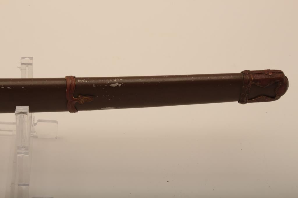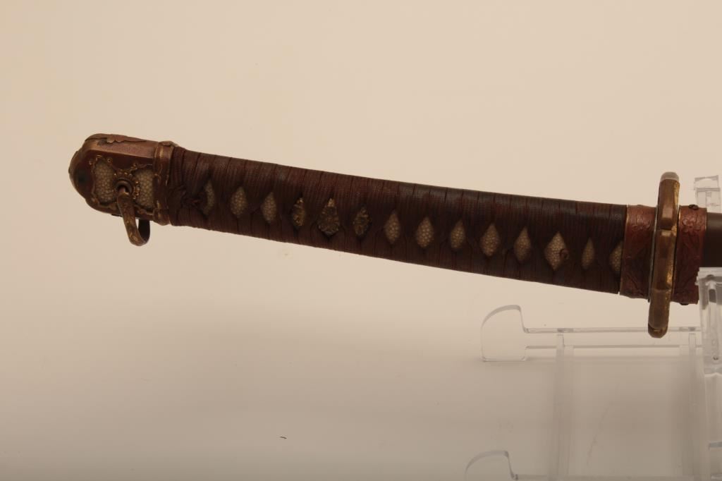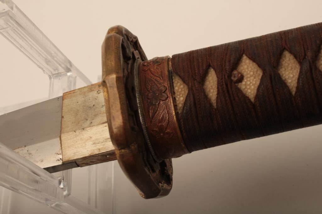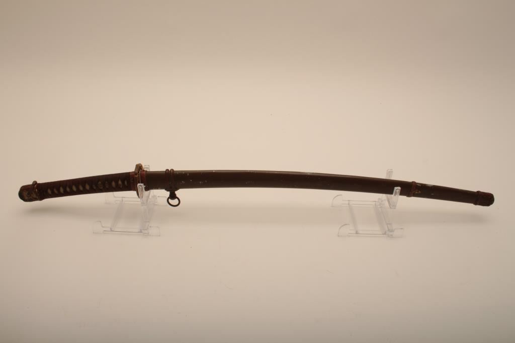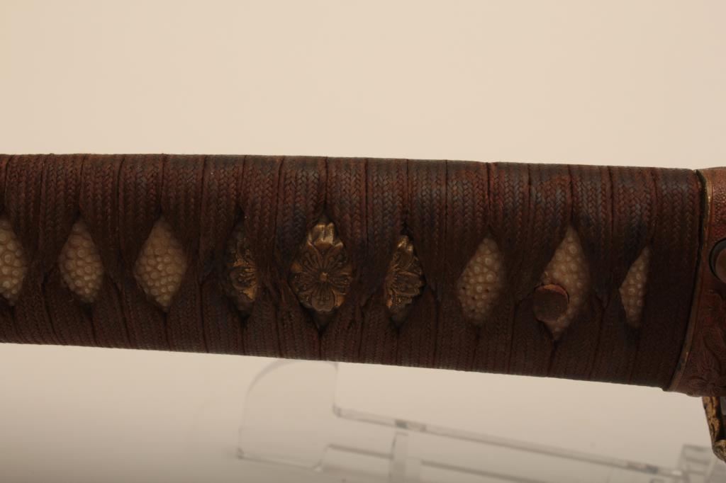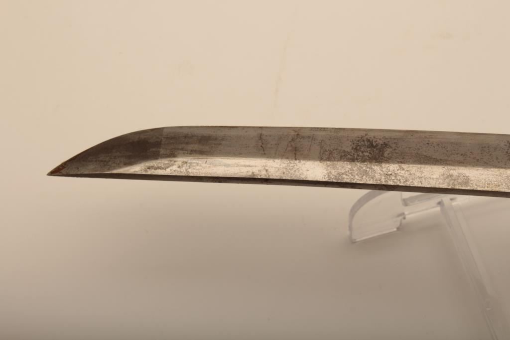 Samurai sword with WWII issue mounts, battle nicks in edge, fair to good. From Circle in Orange antique dealer's estate. Est. $350-700