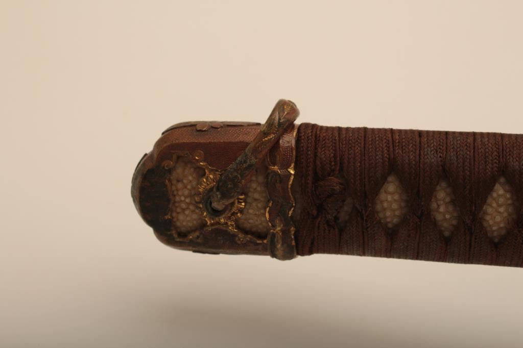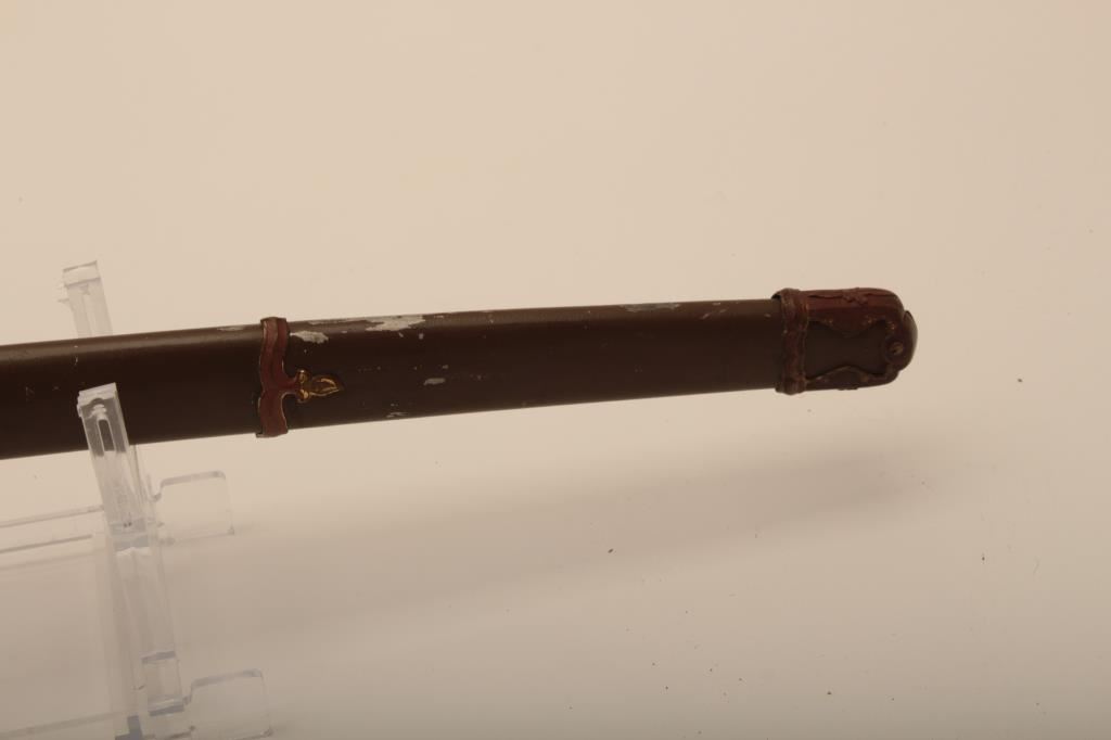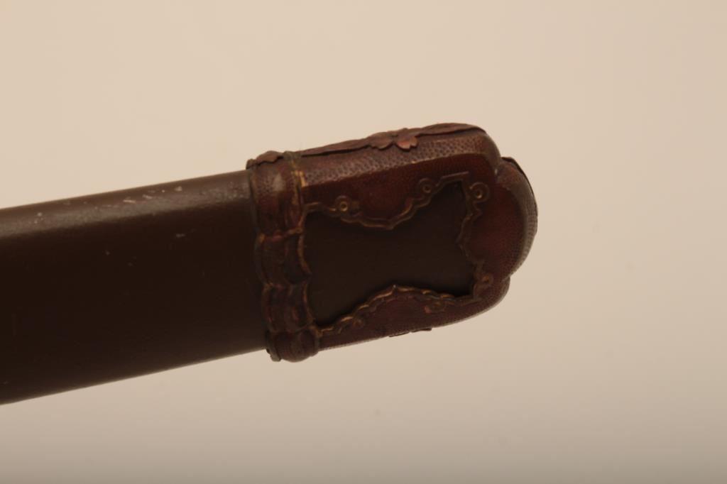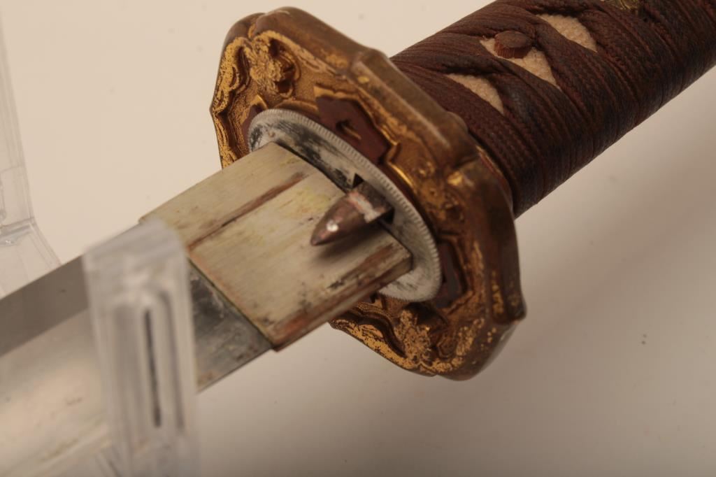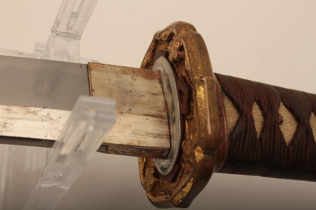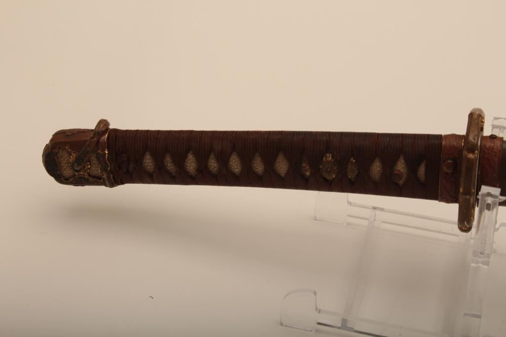 Samurai sword with WWII issue mounts, battle nicks in edge, fair to good. From Circle in Orange antique dealer's estate. Est. $350-700